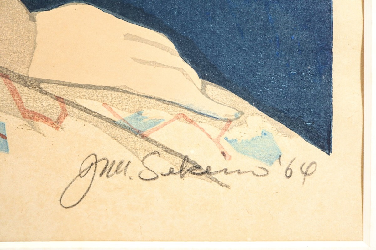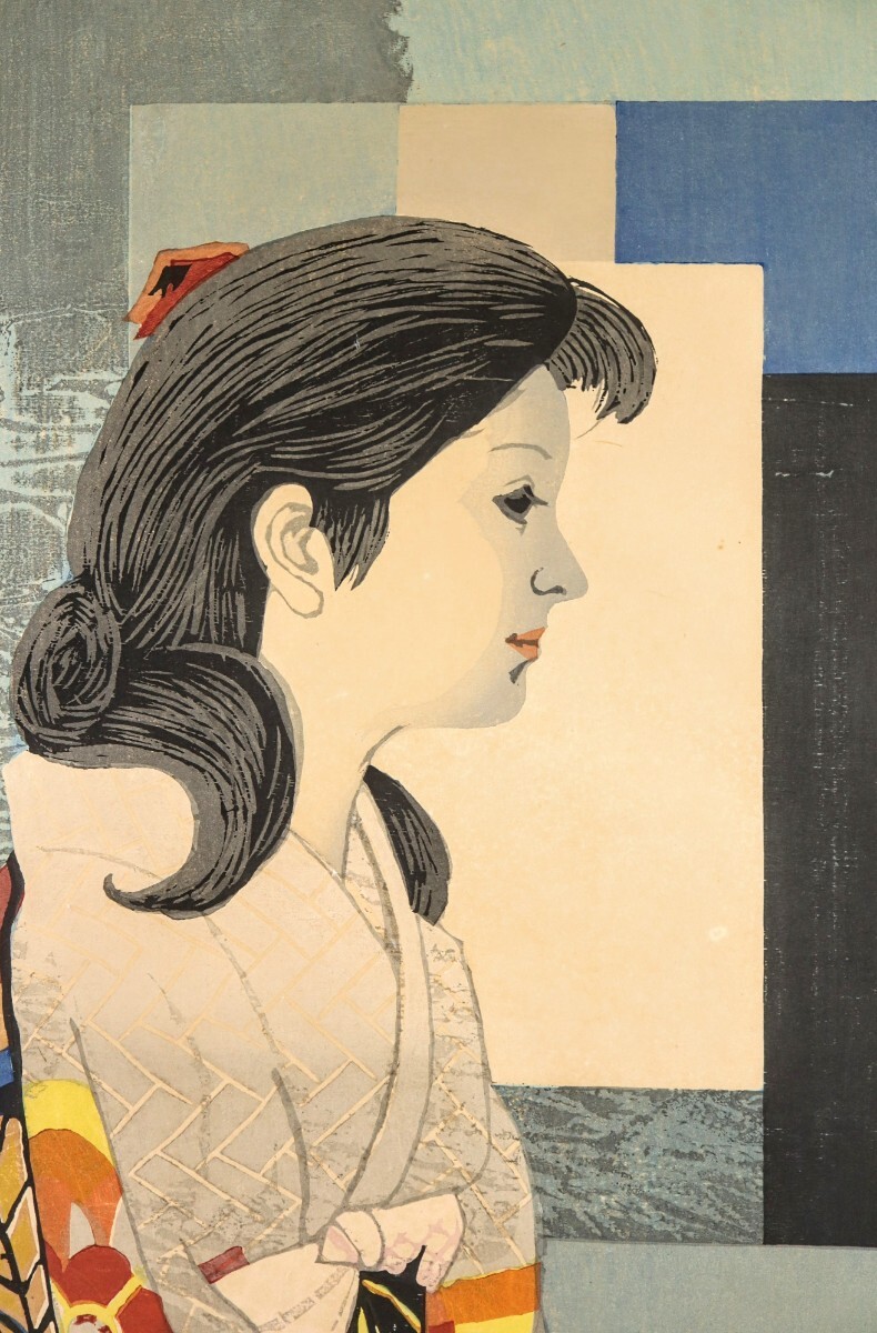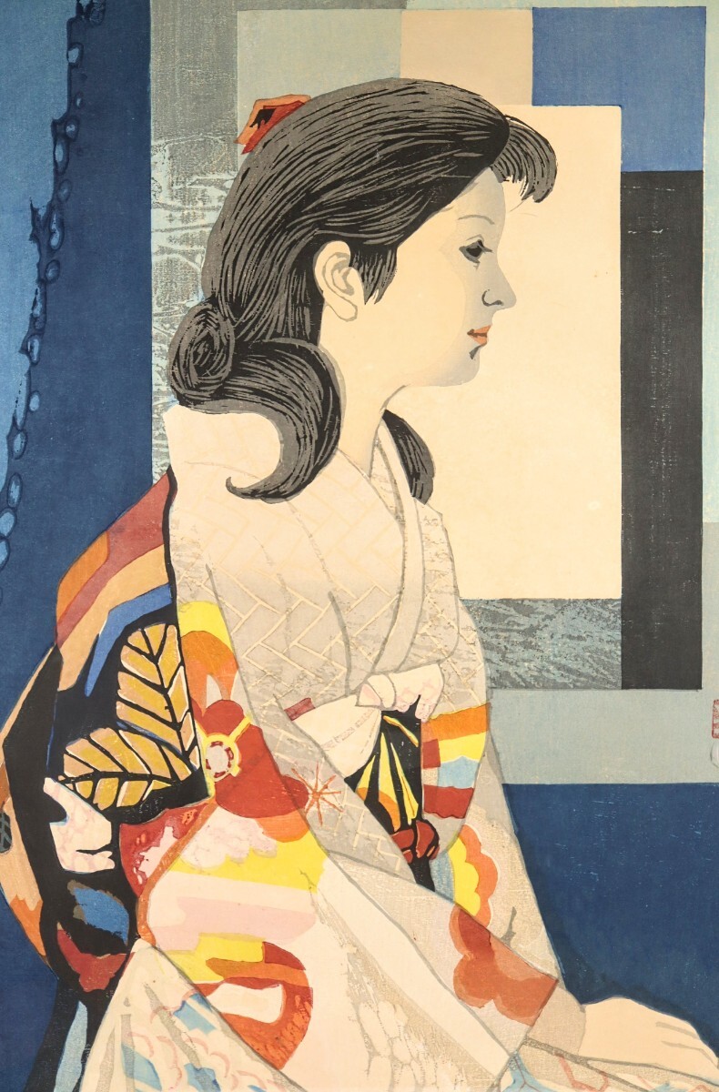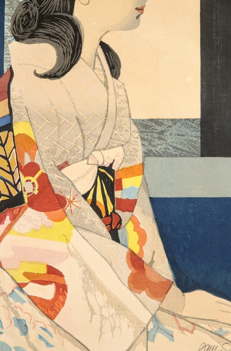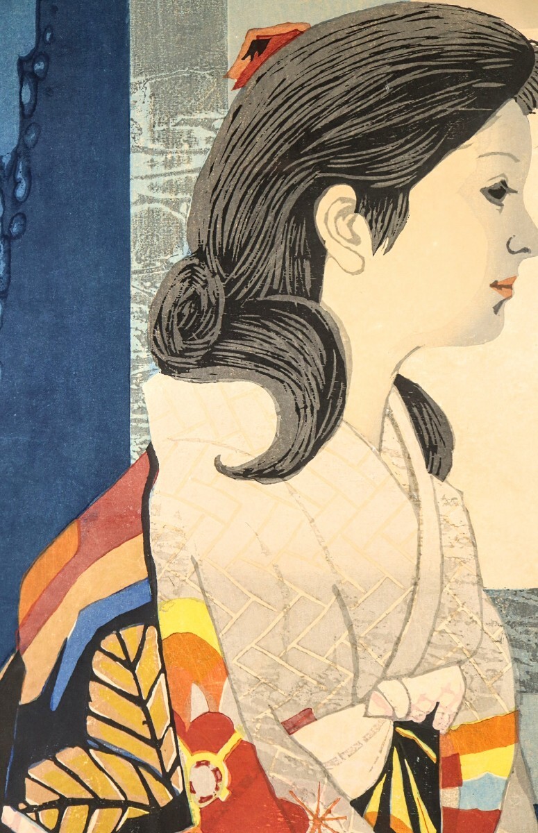 真作 関野凖一郎 1964年大判木版画「鮎子」画56×81.5cm 青森県出身 現代の浮世絵師 大胆な色彩感覚と巧みな幾何学的画面構成 準一郎 10514