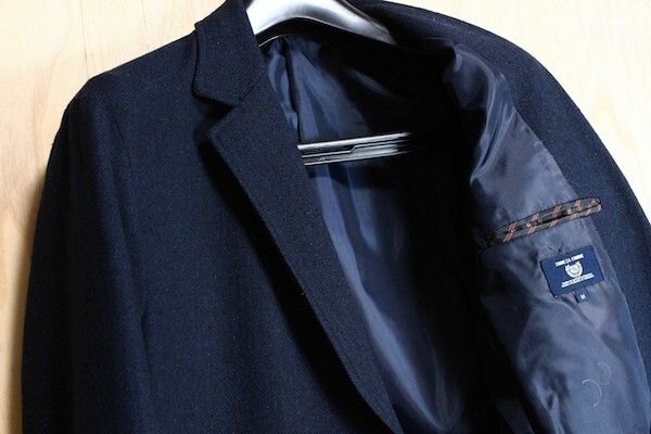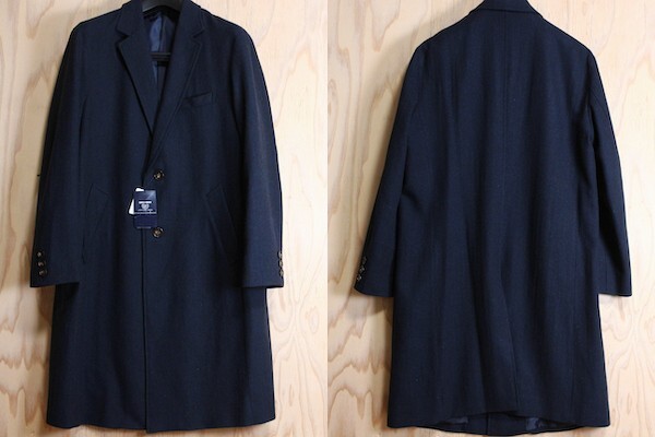 《デザイン》 ウールライクなツイード素材を使用した、ベーシックな2つボタンのチェスターコート。 衿を立てた時に見える衿腰と、内ポケットの口布に使用したレジメンタルストライプの生地が さりげないアクセントです。