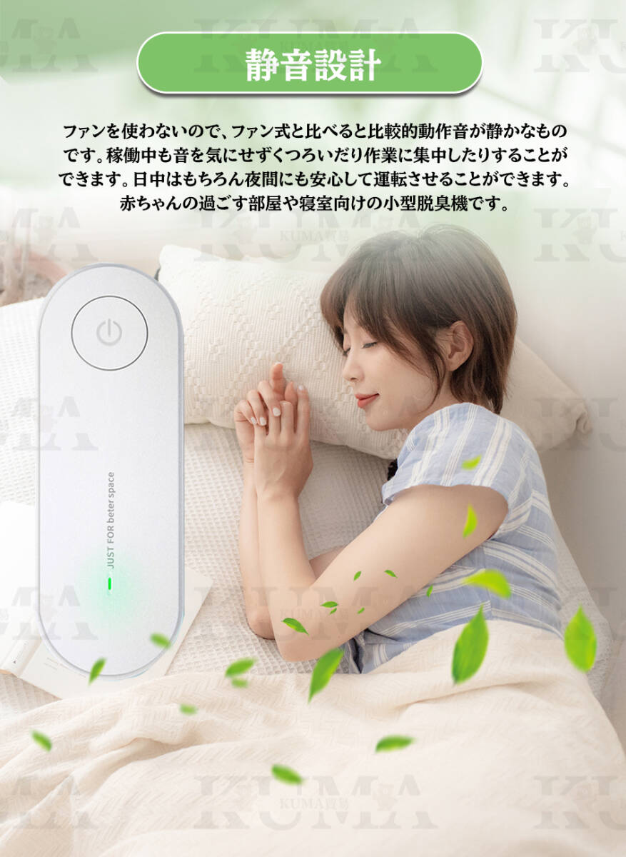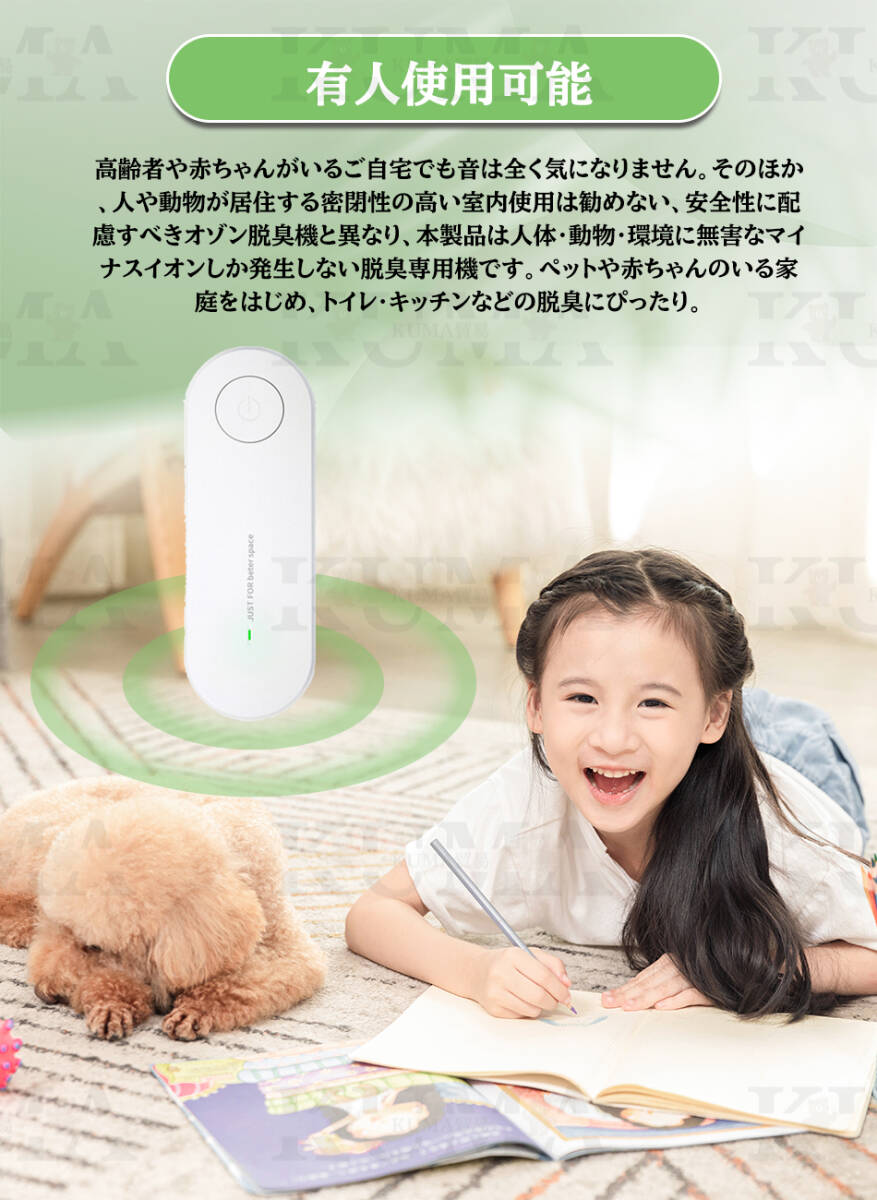 【超静音設計&有人使用可能】 ファンレス設計、運転中の動作音でも5dB未満のため、睡眠中はもちろん、寝室でのリラックスタイムも快適に過ごすことができます。高齢者や赤ちゃんがいるご自宅でも音は全く気になりません。そのほか、人や動物が居住する密閉性の高い室内使用は勧めない、安全性に配慮すべきオゾン脱臭機と異なり、本製品は人体・動物・環境に無害なマイナスイオンしか発生しない脱臭専用機です。ペットや赤ちゃんのいる家庭をはじめ、トイレ・キッチンなどの脱臭にぴったり。<br>