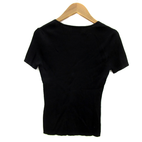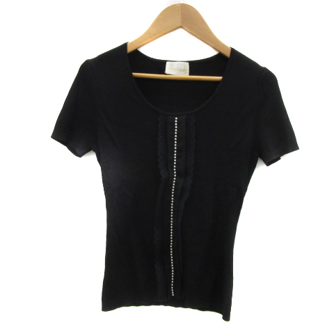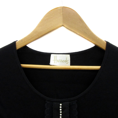 ハロッズ Harrods リブニット カットソー 半袖 ラウンドネック チュール フェイクパール 黒 ブラック /YS26 レディース