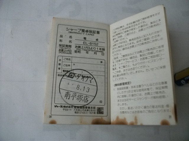 シャープ 取扱説明書 カード電卓 エルシーメイト EL-8152 汚れあり 昭和レトロ ビンテージ
