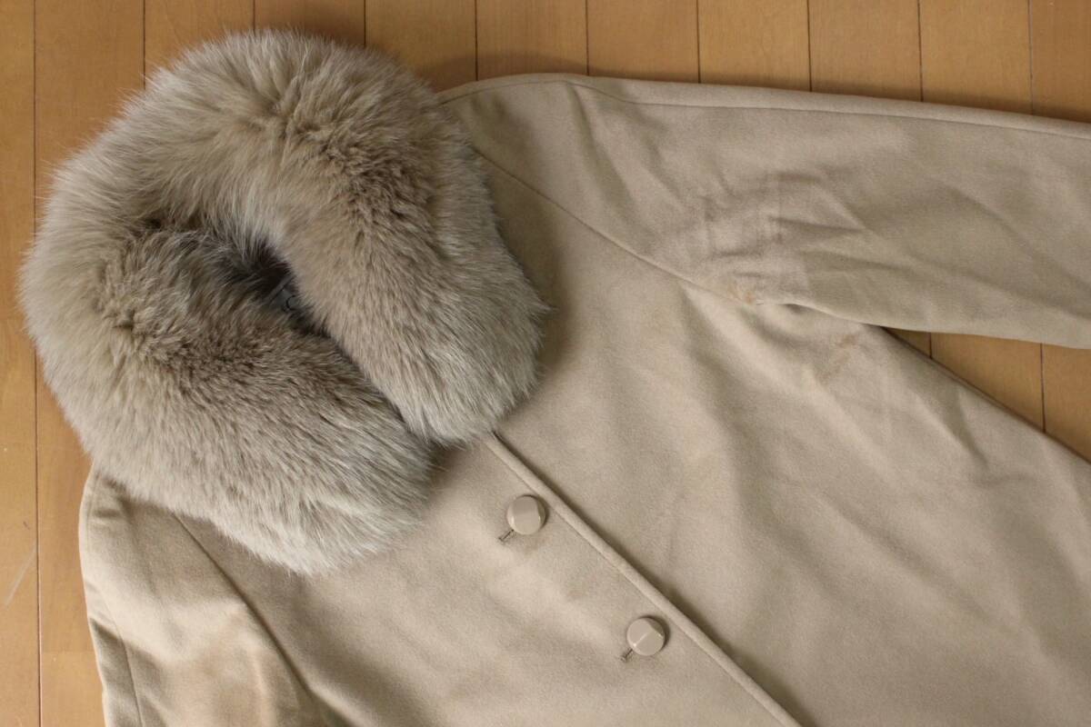 襟元のフォックスファーはボタンで取り外し可能です。フォックスファーの中で,最もシルキーな毛艶のブルーフォックス(北極キツネ)。毛足が長く,肌あたり滑らか。めくってもめくっても根元が見えないほどのボリュームで顔まわりを華やかに,若々しく見せてくれます。