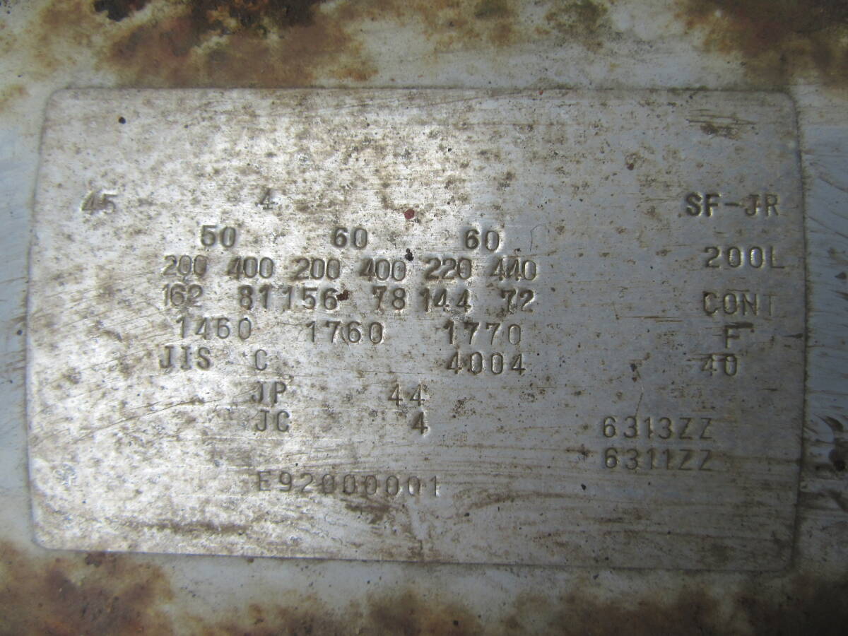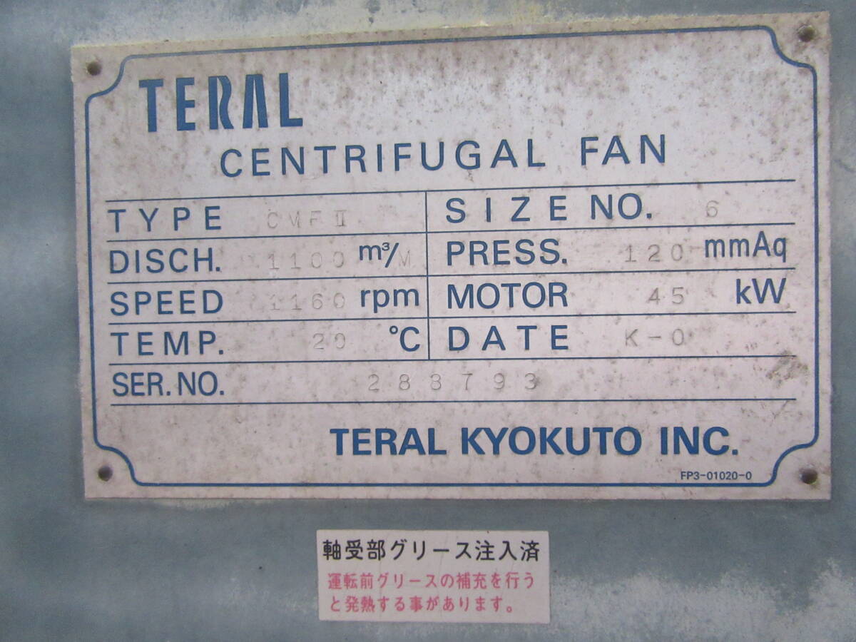 メーカーはテラル極東。  三相200Vの45KWモーター。 50/60HZ仕様です。 200V/400V兼用型です。 風量はなんと1100立米/min! とてつもない風量です!