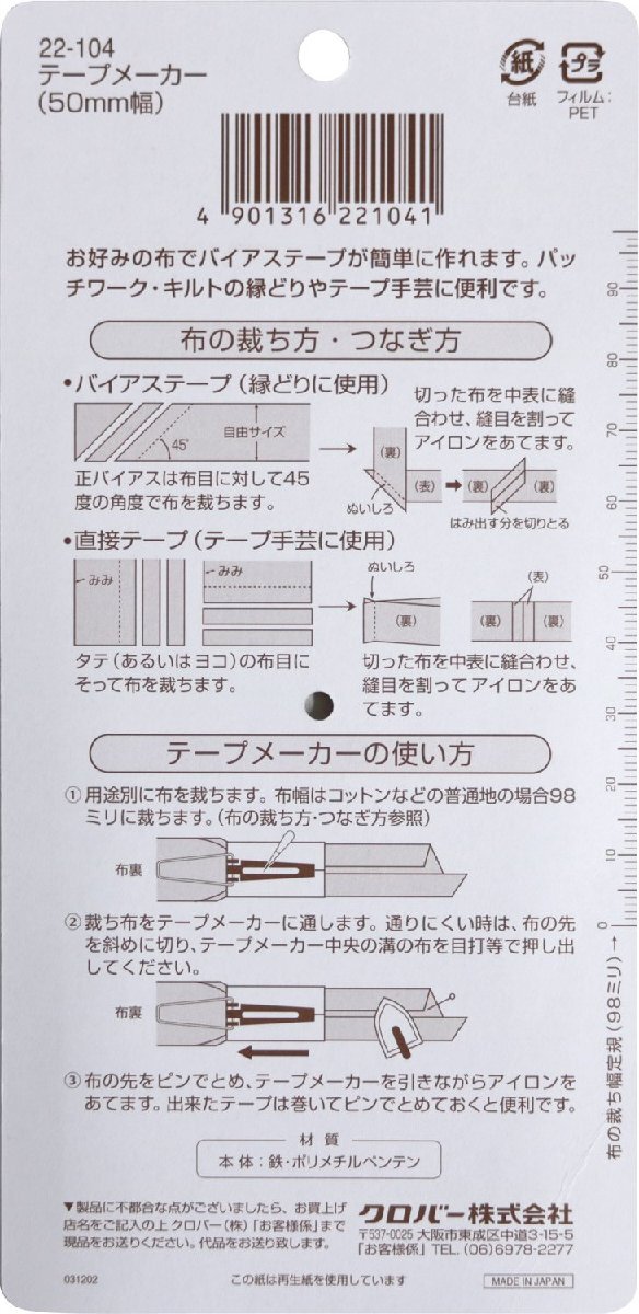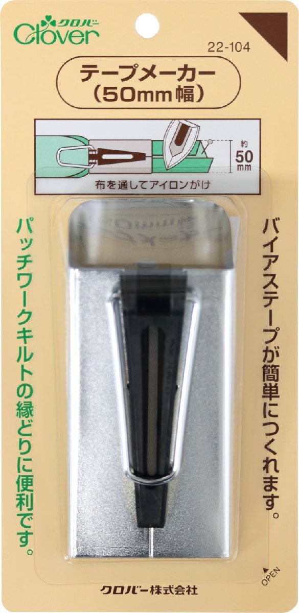 「Clover テープメーカー 50mm幅」▼4901316221041▼(商品説明)・ 50mm幅 22-104・・Size:50mm幅・対象性別 :男女共用説明 袖ぐり・衿ぐりのパイピングの始末やベルト通しなど、共布で素早く同じ幅のテープ作りができます。