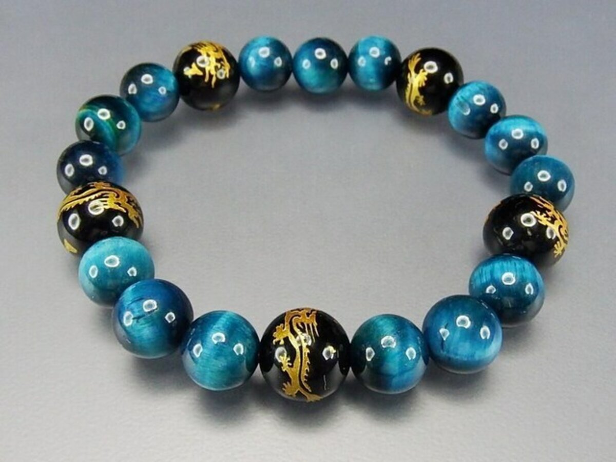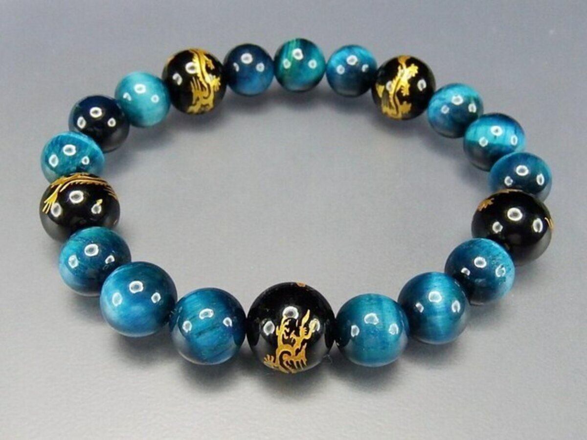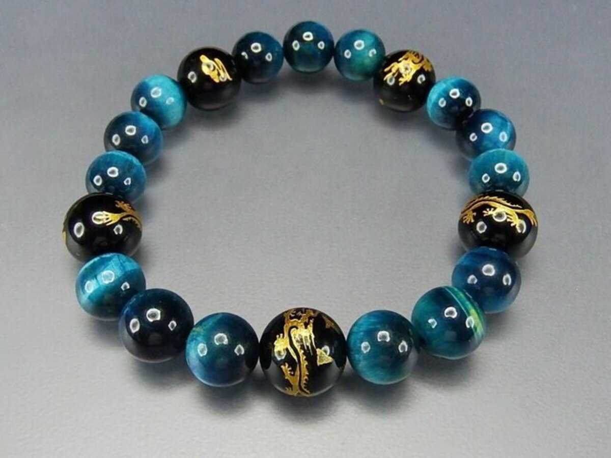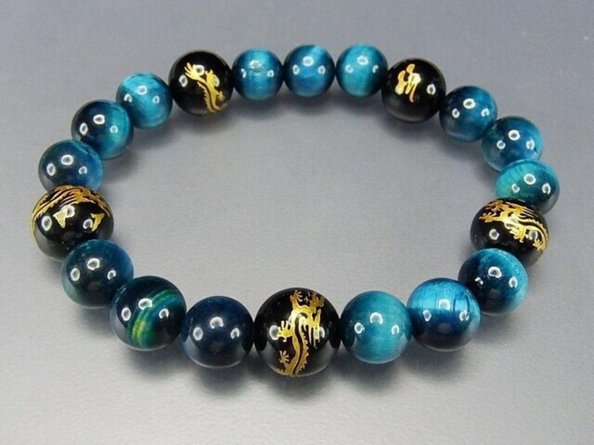 AA品マリンブルータイガーアイオニキス金龍彫り天然石ブレスレットプライム