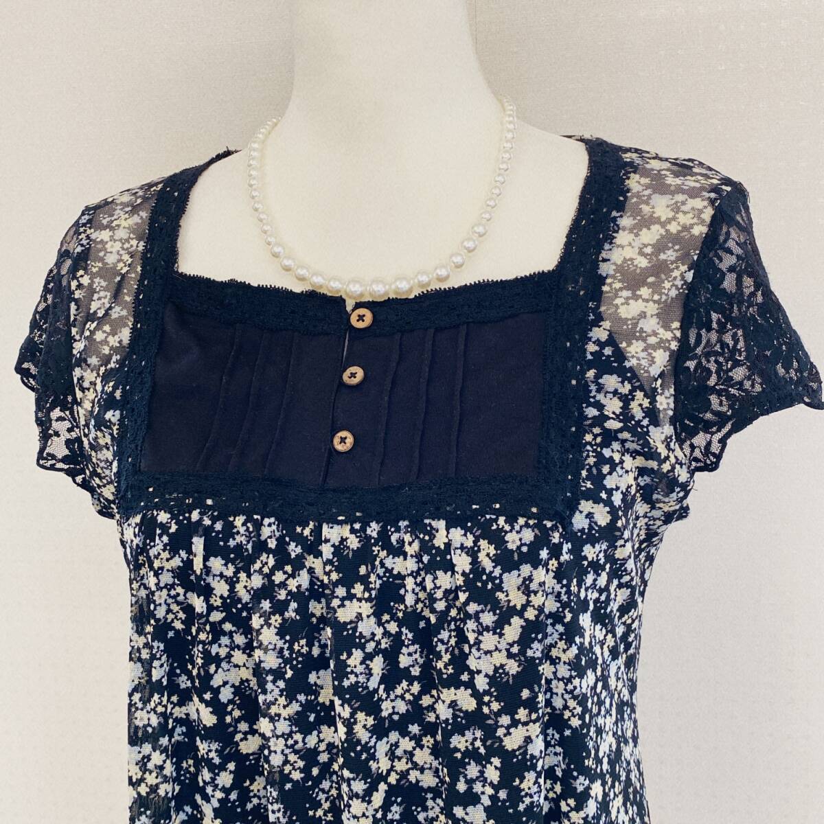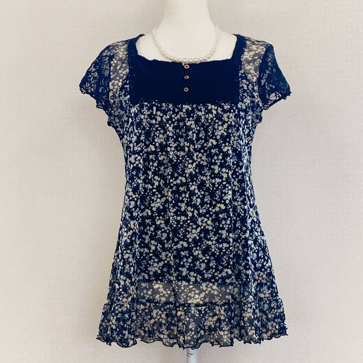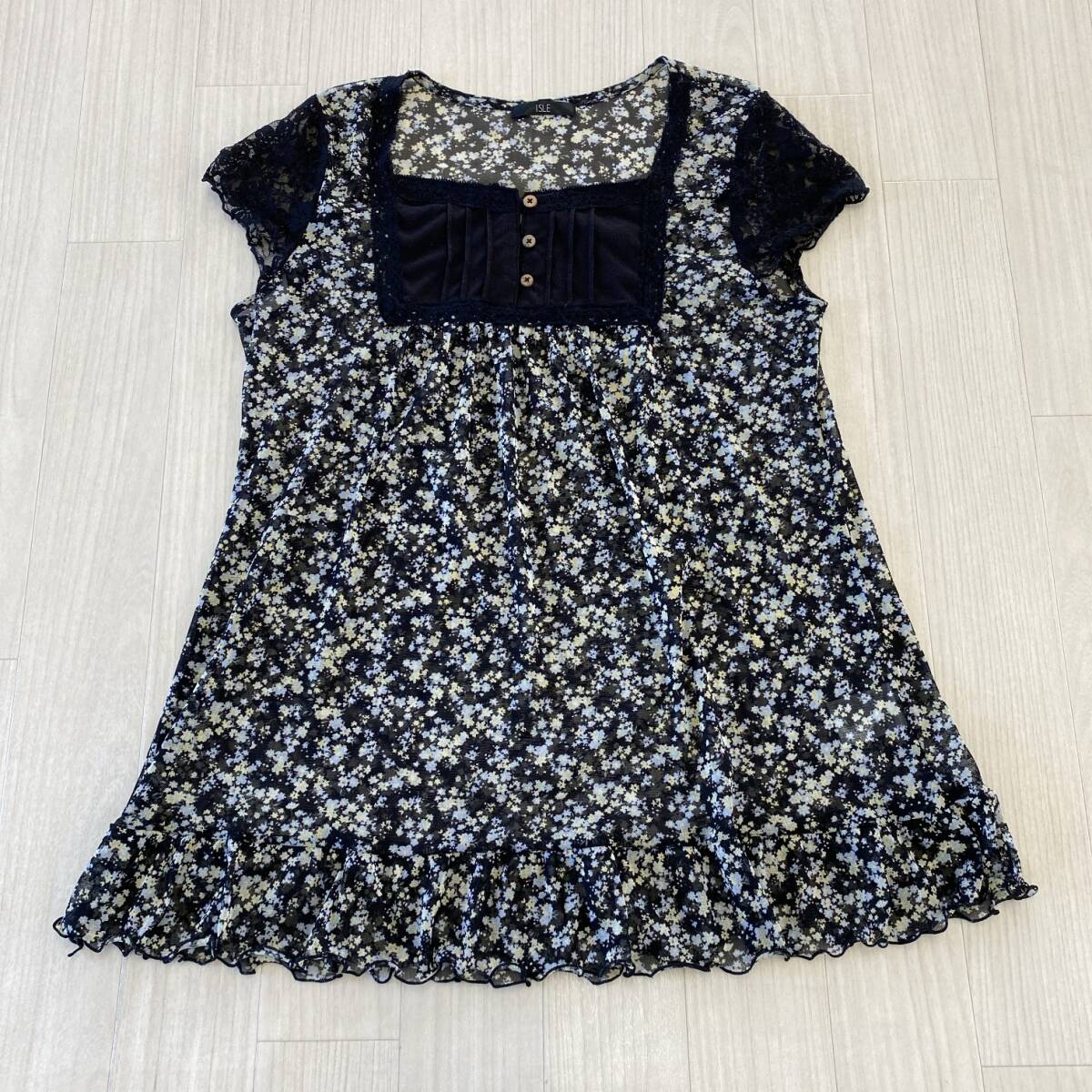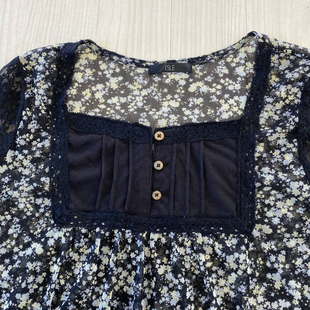 Y1701 ISLE レディース トップス チュニック 4つ穴ボタン チュール生地 薄手 袖レース M~L ブラック 花柄 涼しげ 大人かわいい おしゃれ