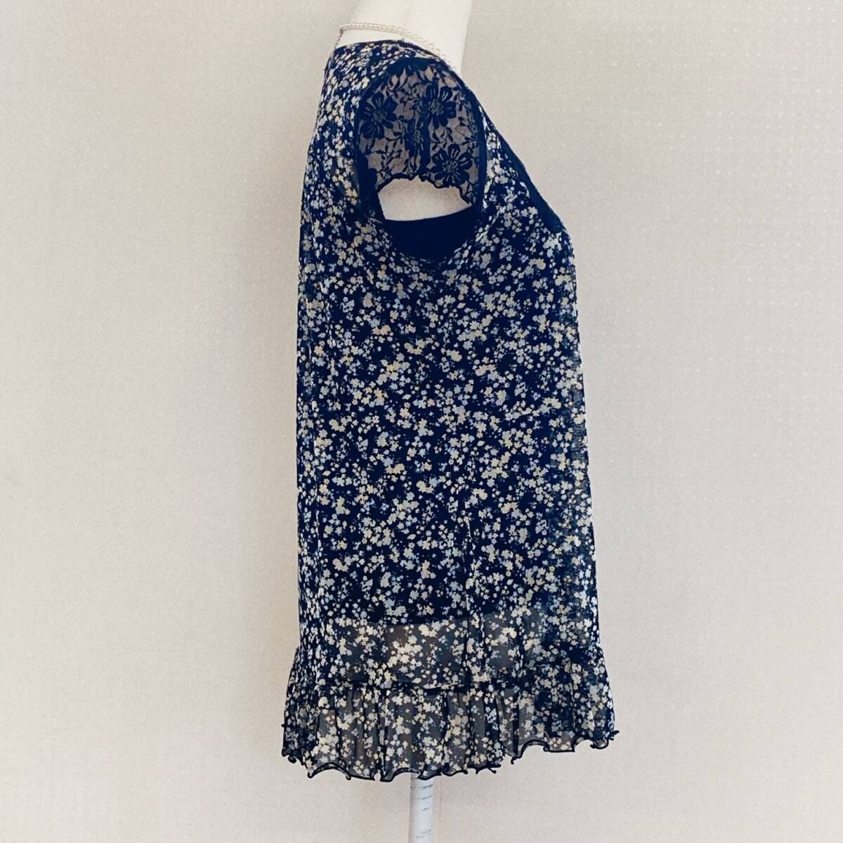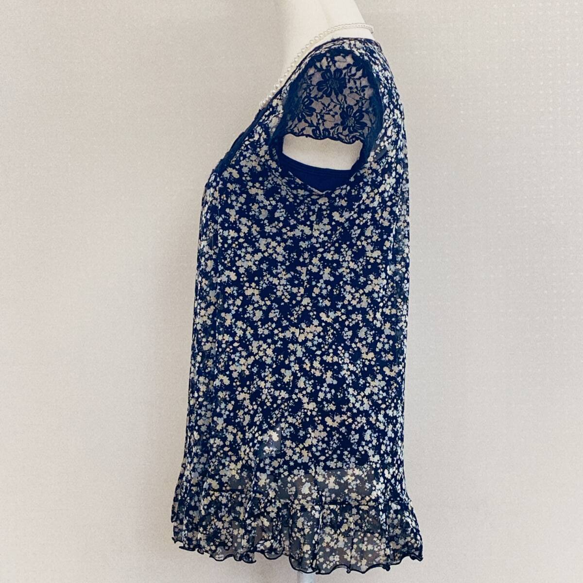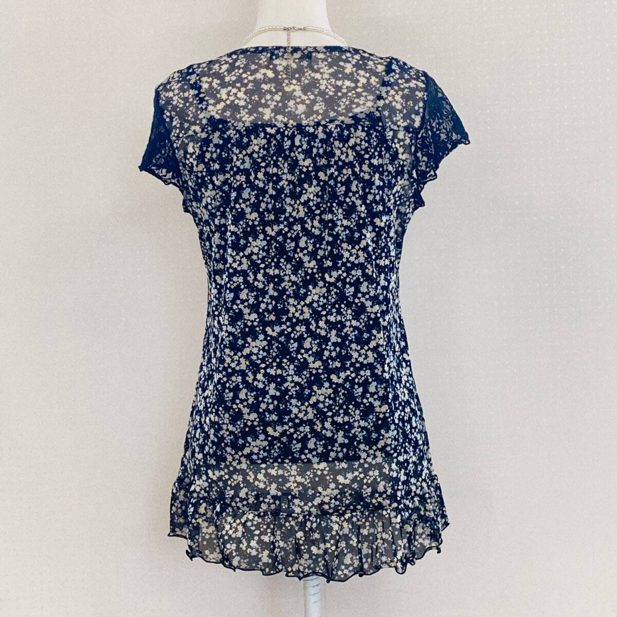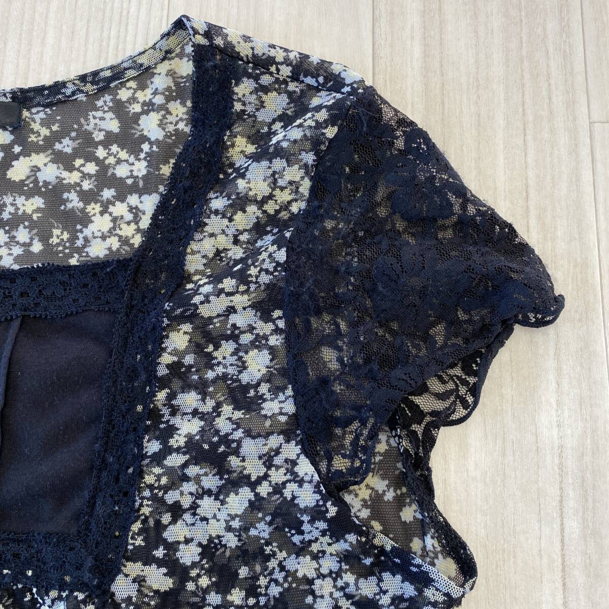Y1701 ISLE レディース トップス チュニック 4つ穴ボタン チュール生地 薄手 袖レース M~L ブラック 花柄 涼しげ 大人かわいい おしゃれ