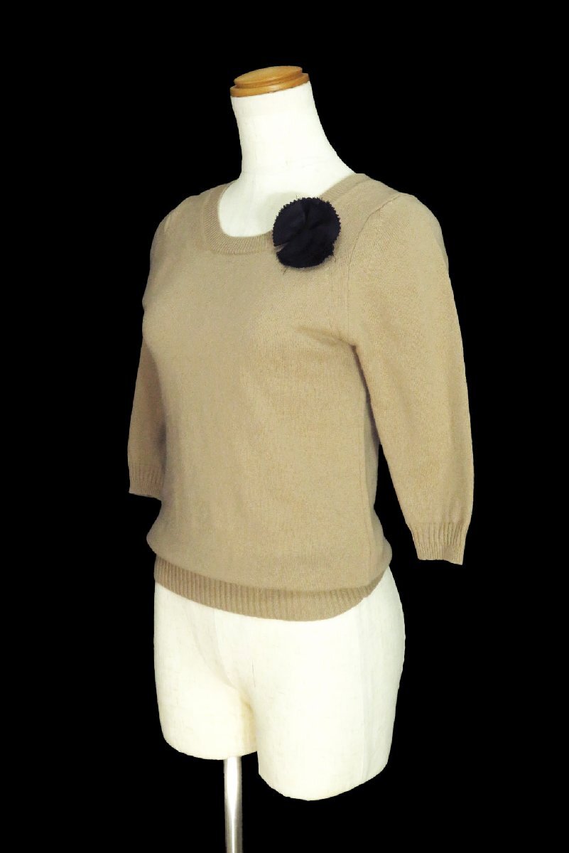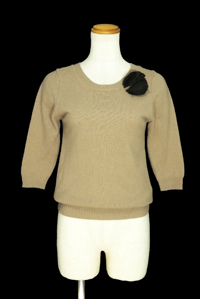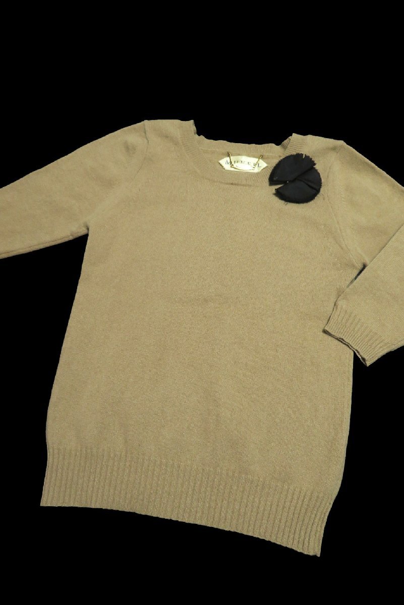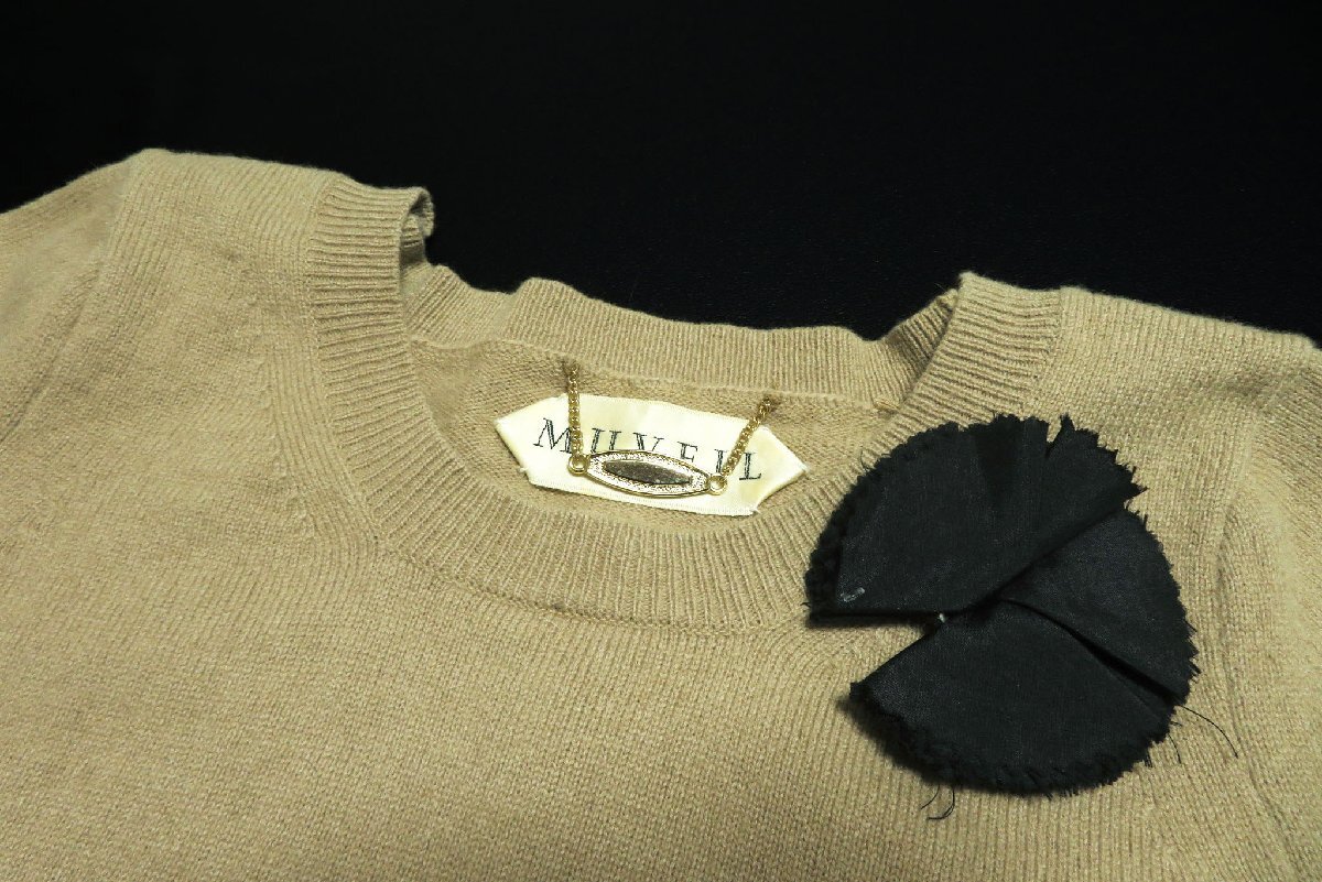 ☆美品☆MUVEILミュベール/ブローチ付ウールアンゴラ5分袖ニットプルオーバー:ベージュnk896