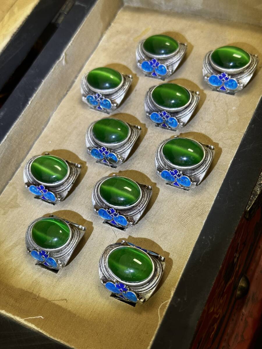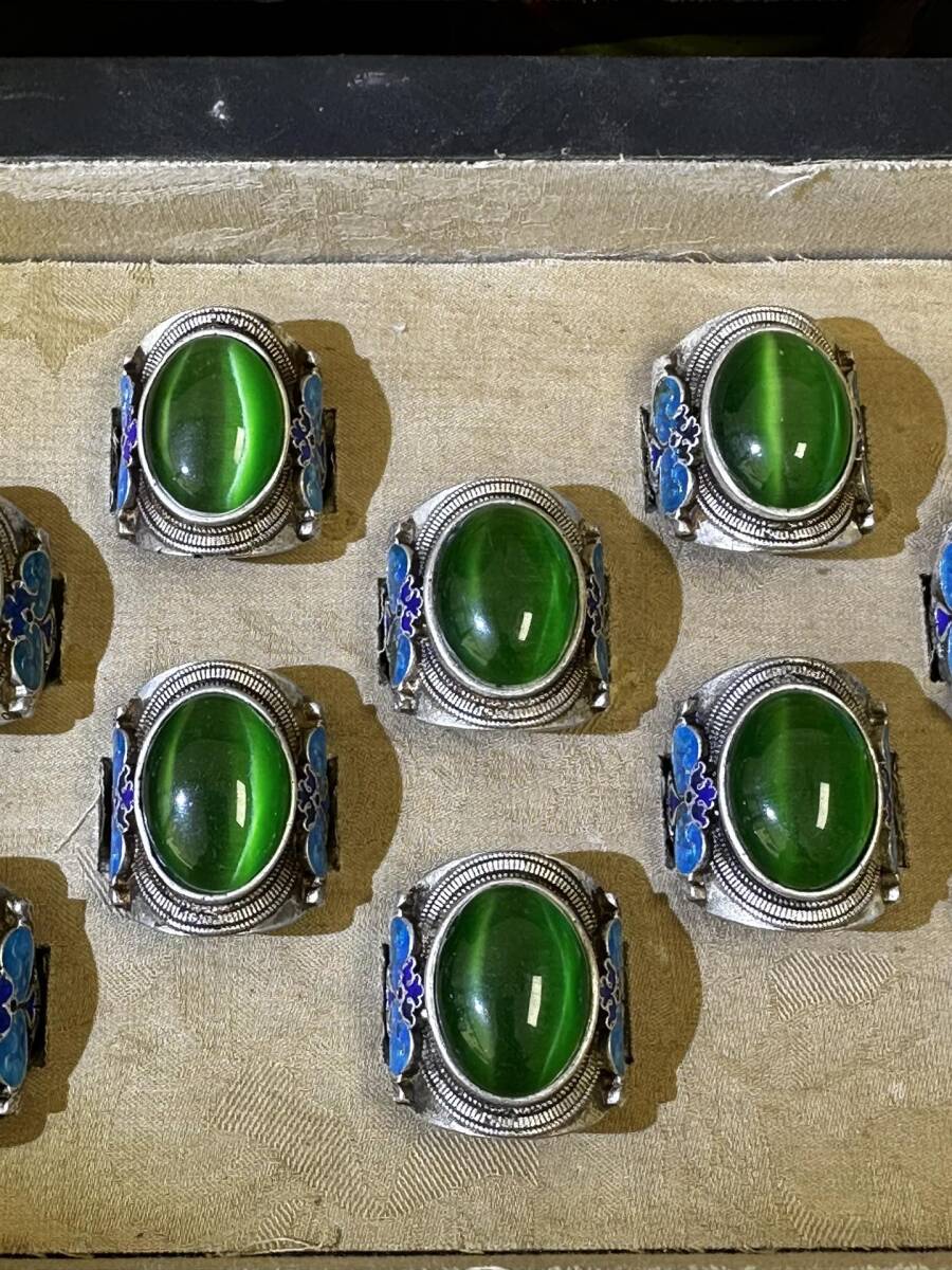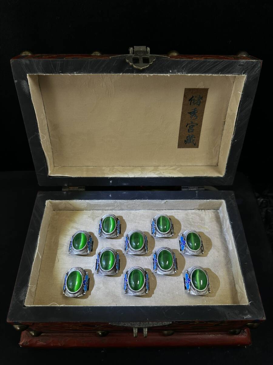 『清・宮廷御製・古綠猫眼石彫・戒指・指環・箱付』極細工・東洋彫刻・骨董品・古賞物・中国古玩・中国古美術