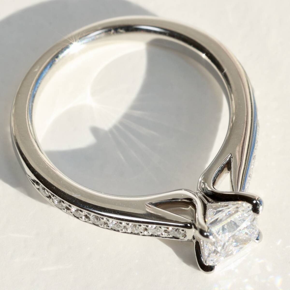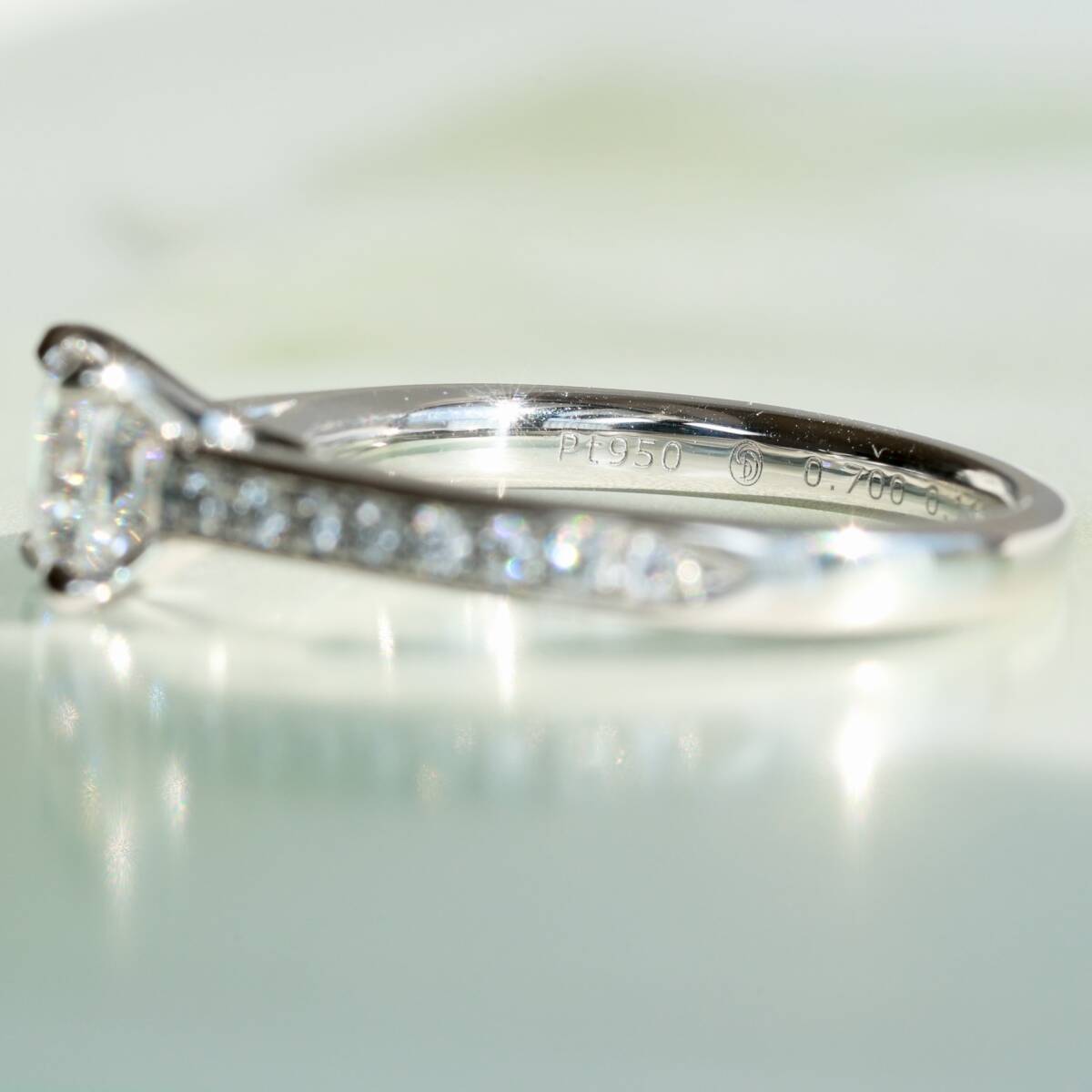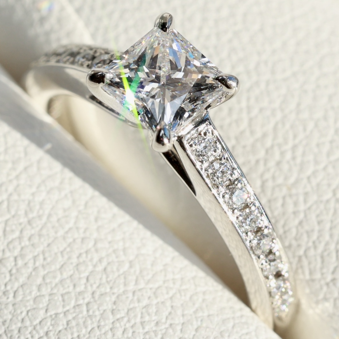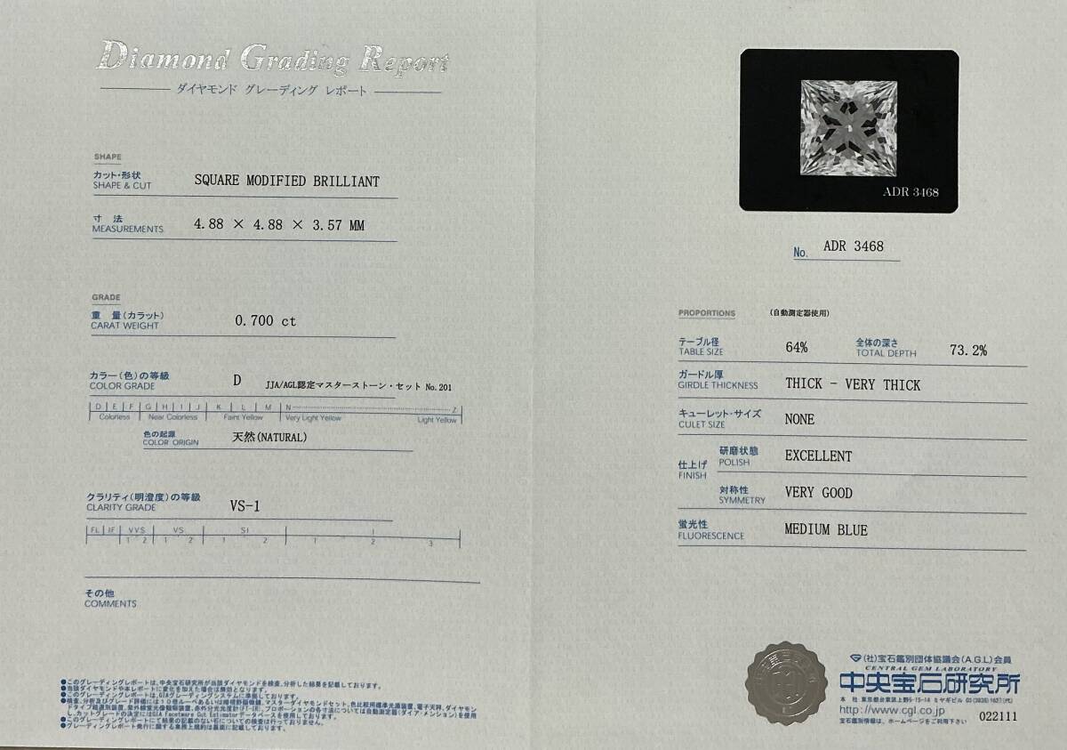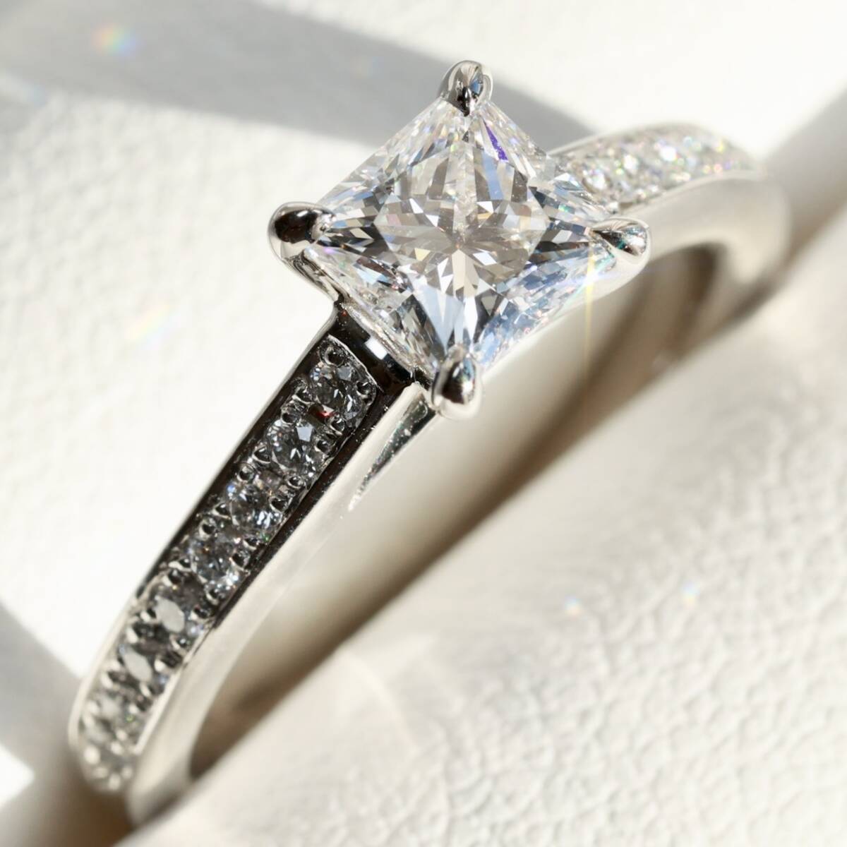 高品質なプリンセスカットのダイヤモンドは1石で0.70ctと十分な大きさと、DカラーとVS1クラスと高品質で輝きの美しいお品です。