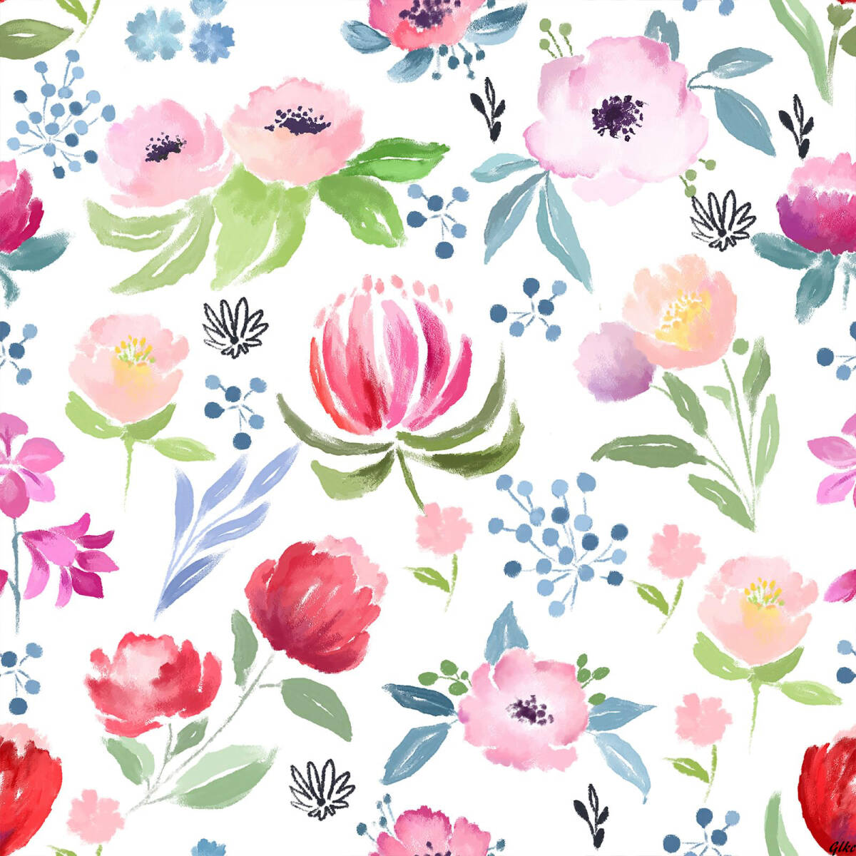 ピンクや紫の花と緑の葉が描かれたデザインは、温かく、明るい印象を与えてくれます。