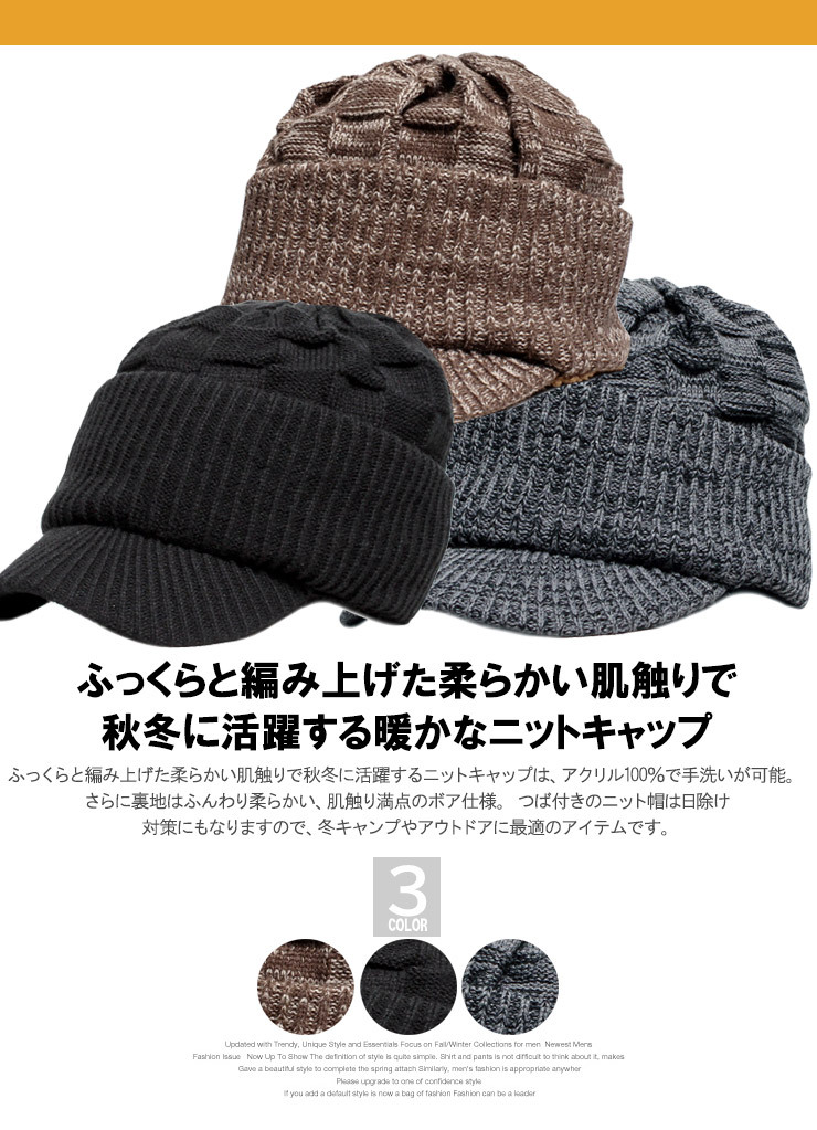 | 商品説明 | 雰囲気のある、着こなしのポイントになるつば付きニットキャップです。 |