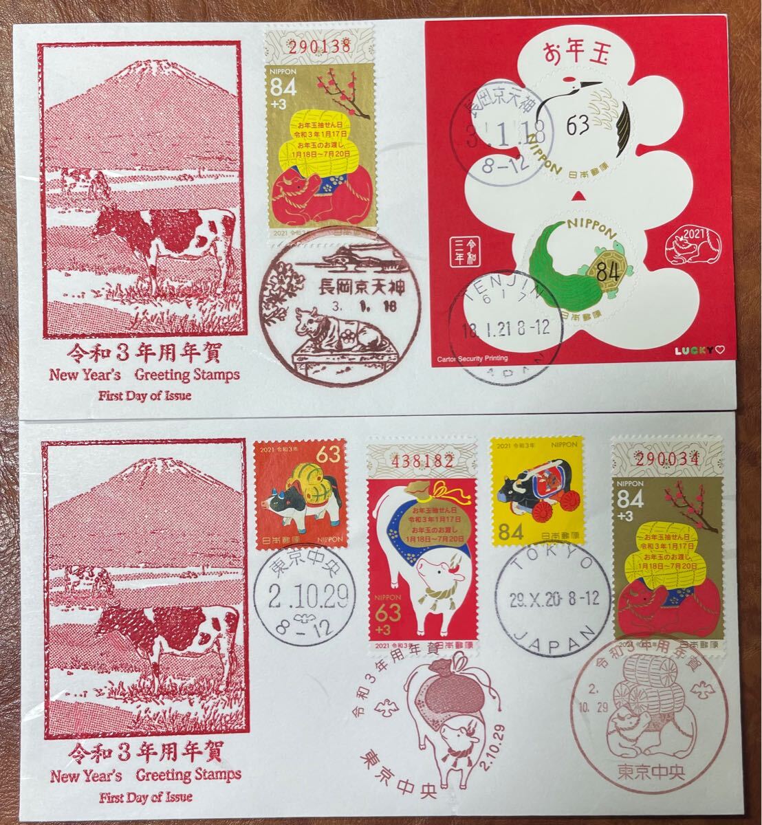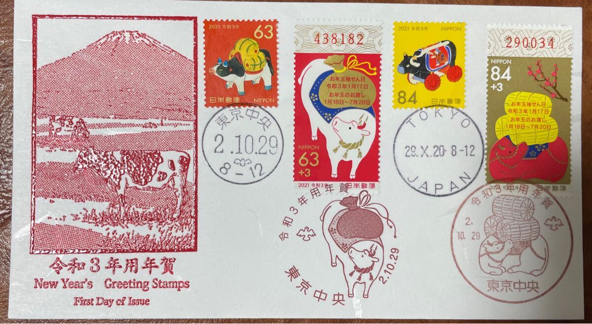 2020年10月29日牛ウシ年賀お年玉切手初日カバー封筒2枚