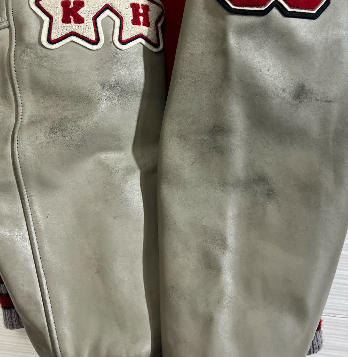 状態は、大きいダメージや目立った汚れはないですが、全体的に多少色落ち、毛羽立ち、スレがあります。袖レザーに多少スレ、小傷、色褪せ、汚れあります。新品ではないので、多少の着用感は否めませんが、まだまだ使っていただけるかと思いますが、あくまでもユーズド品になりますので、神経質な方は入札はお控え下さい。