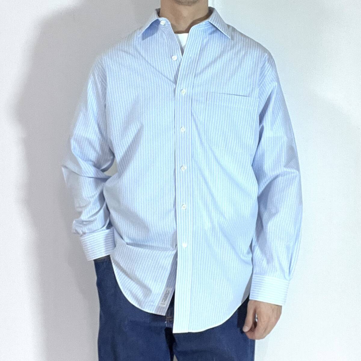 ・ワイドめのカラーにワンポケットのシンプルなストライプのライトブルーシャツ