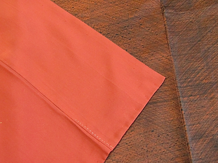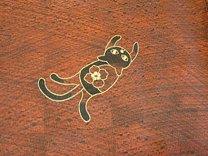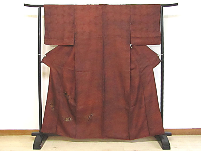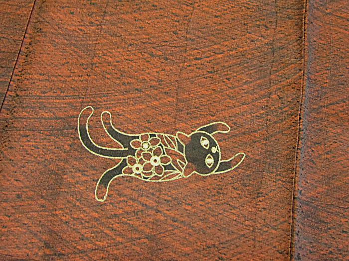 臙脂に黒のシケ引き染に猫の柄の附下きものです。