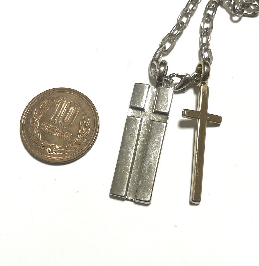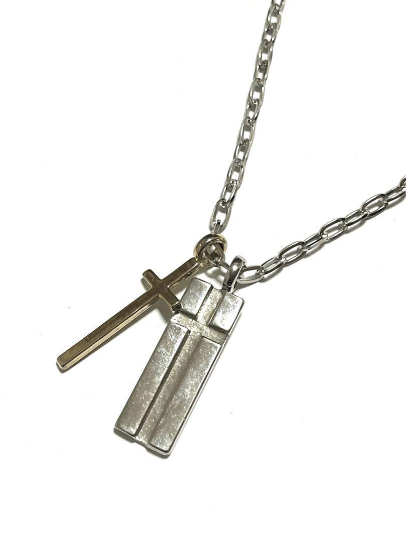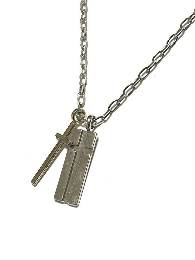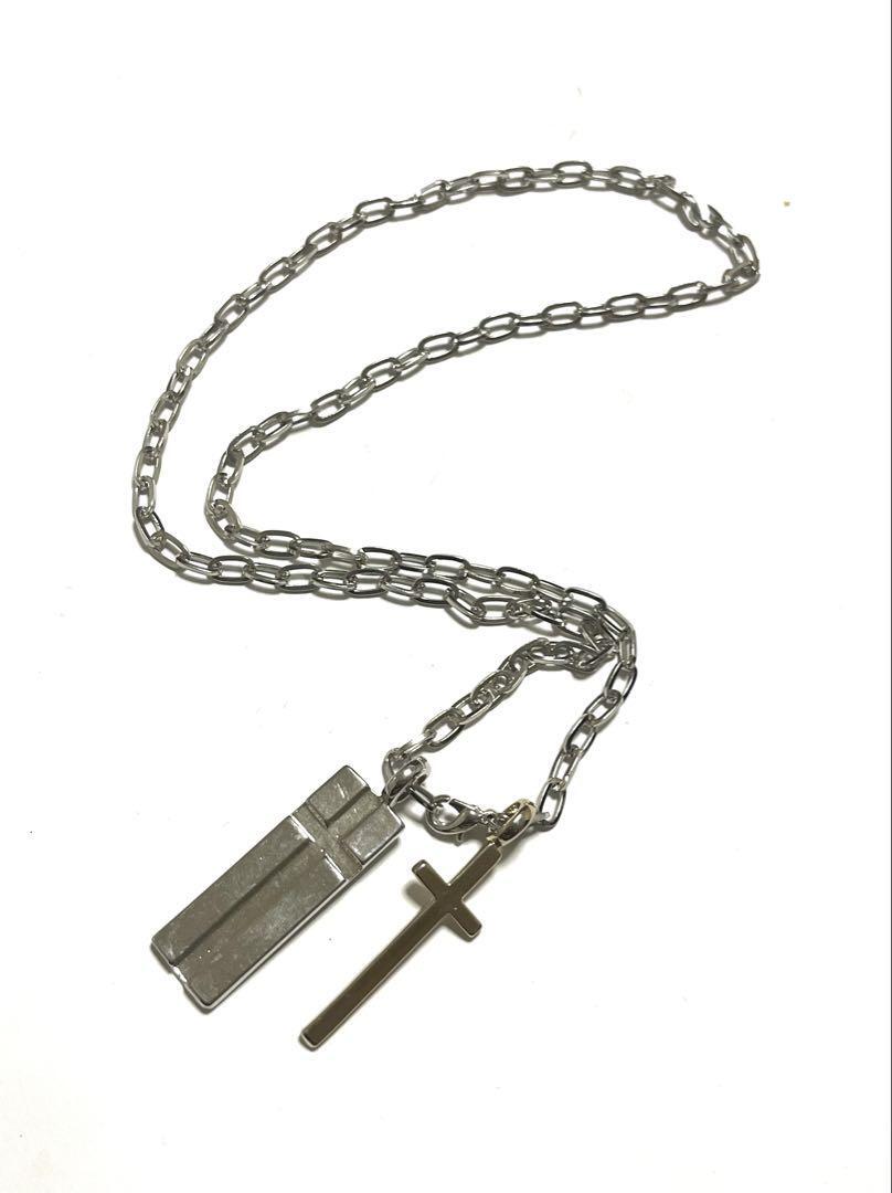 シルバーのリンクチェーンにクロスとプレートのペンダントが特徴的なネックレス。