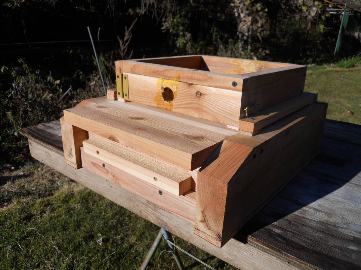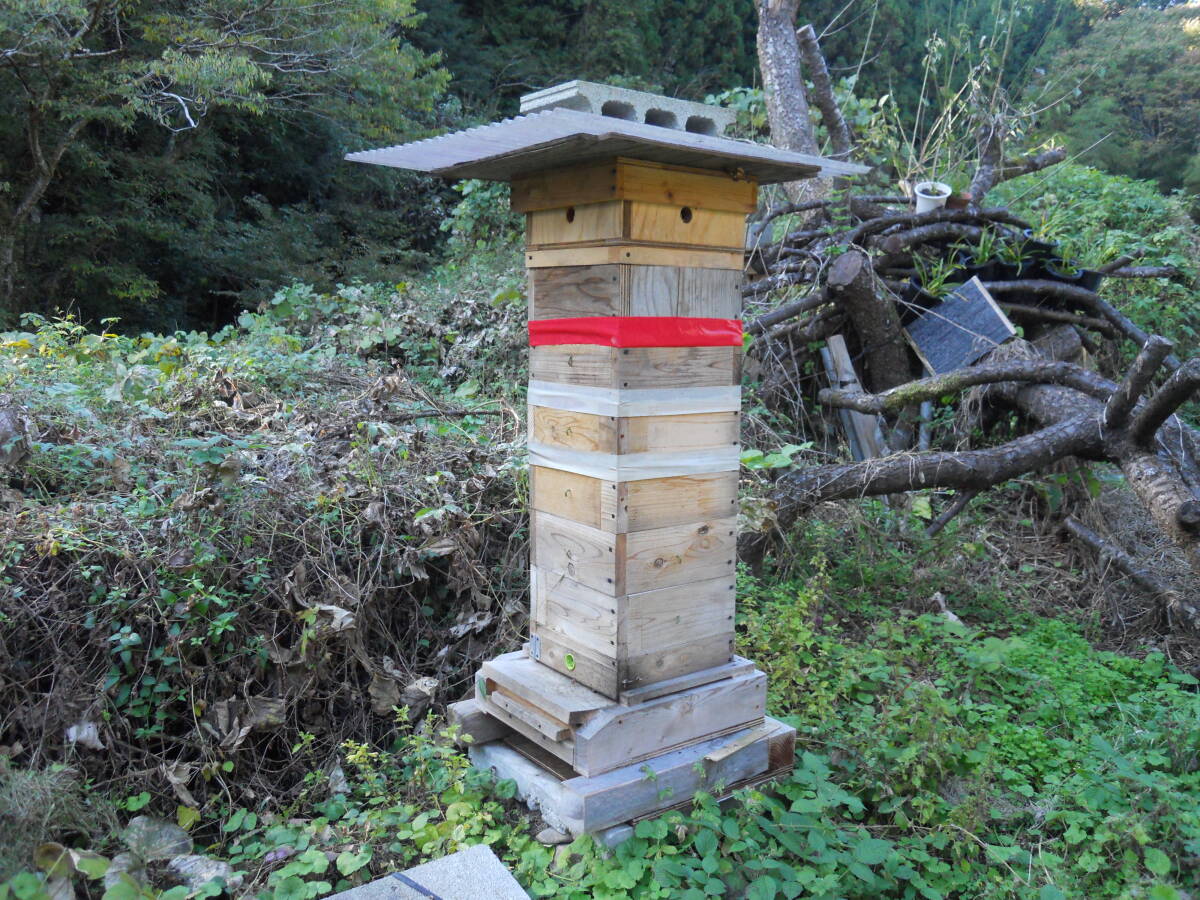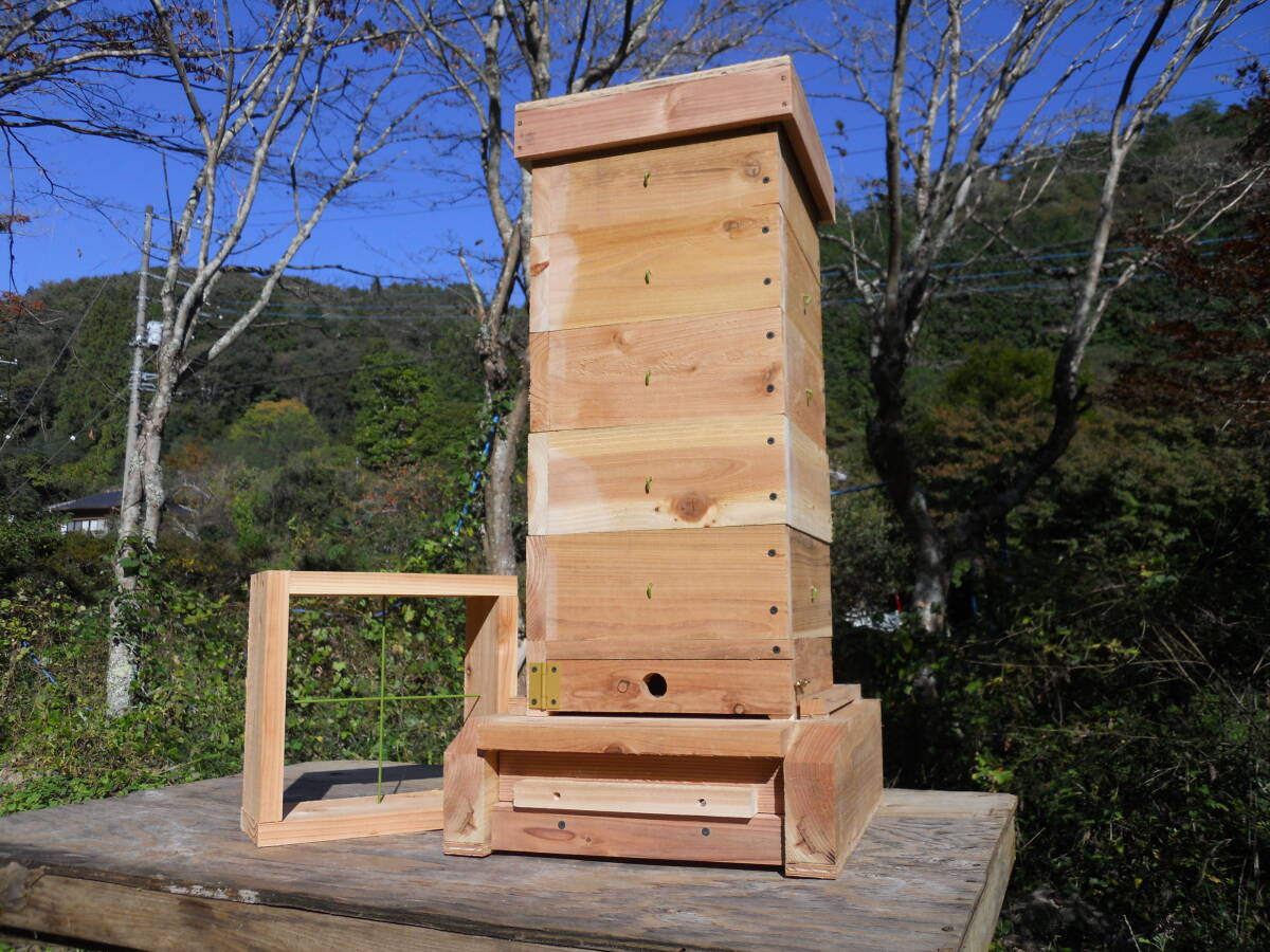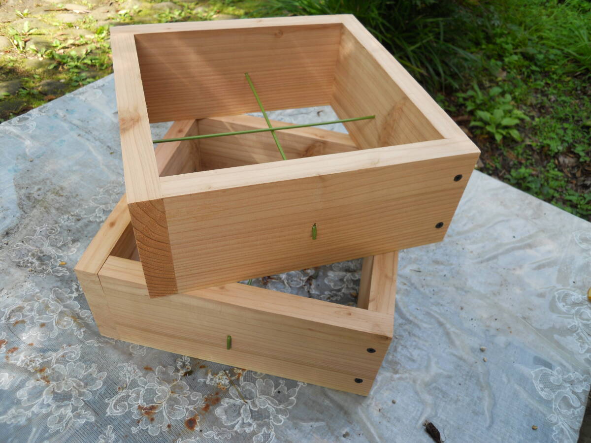 ◇日本ミツバチ 重箱式5段巣箱+脚無し巣箱台(スムシ・アカリンダニ・高温対策) こちらの商品は1群を飼育する為に必要なモノが揃ったセットです! 天蓋、巣門にミツロウを塗布した状態で送ります。 重箱をバラして発送しますので送料が抑えられた分1段おまけも付けます! 重箱5段+おまけ1段とオリジナル台(脚有)のセットです。 重箱のみバラした状態で梱包発送させて頂きます。 ※ バラした状態での梱包にご協力頂けると送料や梱包資材の高騰もあり、送料が抑えられ大変助かります。組立てもインパクトドライバーがあれば簡単です。組立て方法の説明付き。プラスドライバーでも少々時間は掛かりますが 組立可です。ネジ穴も開けてあるので力も要りません。巣箱の説明やミツバチに関する資料も付きます。 ※ 組立てにご協力頂く事で送料を抑えた分で重箱1段おまけが付きます!合計6段 台の脚有りと脚無しは飼育する上では違いは特にありません。好みや設置場所に合った方の台をお選び下さい! 【脚有り】 直接地面に設置可能ですので、設置場所を平らにするだけで他に何も必要ありません。 【脚無し】 コンクリートブロックやビールのプラケース等の上にのせて設置します。台の下に使用する物で巣門の位置、高さを調整出来ます。 高くすると夏場の地面からの照り返しや雨の跳ね返りによる汚れが防げますが、高くし過ぎると継ぎ箱や採蜜の作業が難しくなります。 こちらの商品はオリジナル巣箱台(脚有り)が付いていて1年飼育可能な5段ですのでおススメです。 捕獲に成功してから飼育してみてわかる使い勝手が良い巣箱台だと思っています。 入居に成功したら・・・翌年には分蜂して2群3群捕獲出来るチャンスがあります。 その時は、また巣箱の落札お願い致します! 初心者の方向けに簡易の手引き書A4用紙5枚程度が付きますので巣箱の使い方や捕獲について参考になさってください! 【捕獲する為に】 是非、複数の巣箱を設置する事をおススメします。一般的に設置した巣箱に対して捕獲に成功する確率は3割と言われています。 設置場所の条件や準備の仕方にもよるので一概には言えませんが、複数個所に設置する事も捕獲の近道です。 天蓋、スノコ、巣門に対して重箱2段を用意し、ミツバチを捕獲できそうな場所に設置しましょう。重箱は2段で十分です。3段以上高く積み上げる必要はありません。群が入居して巣の成長に合わせて重箱を足して行きます。 ただ、設置しただけでは入居してくれません。巣箱全体にほのかに蜂蜜の香りがする程度誘引液(ハチミツやミツロウ採った後の煮汁)を塗り、スノコ、巣門にはミツロウを塗ります。これだけで入居する事もありますがまだ足りません。 探索蜂にだけ呼び寄せる効果があるキンリョウヘン(金稜辺)の花が必要です。東洋ランの一種で花からフェロモンを漂わせ引越し先を探している探索蜂を呼び寄せる不思議なランの花です。効果が高いのですが価格もそれなりにしますが必須アイテムです! 代用にミツバチ捕獲ルアーと呼ばれる同様の効果が見込める商品もあります。 自分の経験ですと一度捕獲に成功した場所は、翌年も捕獲出来る事が多いです。そういった場所を見つけるのに最初はあちこち設置しました。上記の準備と合わせて複数の待受巣箱の設置も必要だと思います。 ※別途、待受巣箱の複数セットも出品しております。そちらは巣箱台は付いておりませんがコンクリートブロック、プラケースを使用すれば設置可能です。 今年で日本ミツバチ飼育歴9年ですが、この飼育箱とキンリョウヘンで4、5年前から毎年捕獲と飼育に成功しております。 特に飼育が上手く行くようになった要因は2点です。 まず、この台を使う前の底面を直接掃除するタイプの巣箱よりスムシの被害が格段に減りました。巣箱の底面が引出しになっていて掃除がし易くなりました。引出しなので巣箱内に手を入れなくても掃除が出来るので人間にもミツバチにもストレスがほとんどありません。網と板の2層なので巣くずや花粉等が網を通して落ちるのでスムシも巣に登りにくいです。 【スムシの被害→逃居】 ハチノスツヅリガの幼虫でミツバチの巣が大好物です。自然界では共存しているようですが巣箱による飼育では環境が良く増えすぎて大きくなると巣に侵入し巣を食べながら破壊します。群が弱まると顕著に被害が現れます。 2つ目は、真夏の猛暑で巣落ちがとても心配なのですが、巣門は4方向が開いていて通気性も良くなっているのでその心配が減りました。 それでも直射日光は避けなければいけません。落葉樹の下や遮光するなどの対策は必要です。 【巣落ち→逃居】 巣落ちをするという事は天井から巣版が落下する事です。ハチミツの層、育児エリアが滅茶苦茶になり巣の存続が難しくなります。 巣箱からハチミツが流れ出て、蜂も巣箱の側面に出てきます。 ミツバチにとっての最大級のストレスですので経験者がよっぽど上手く対処しないとほぼ逃居し