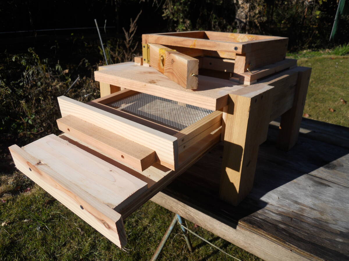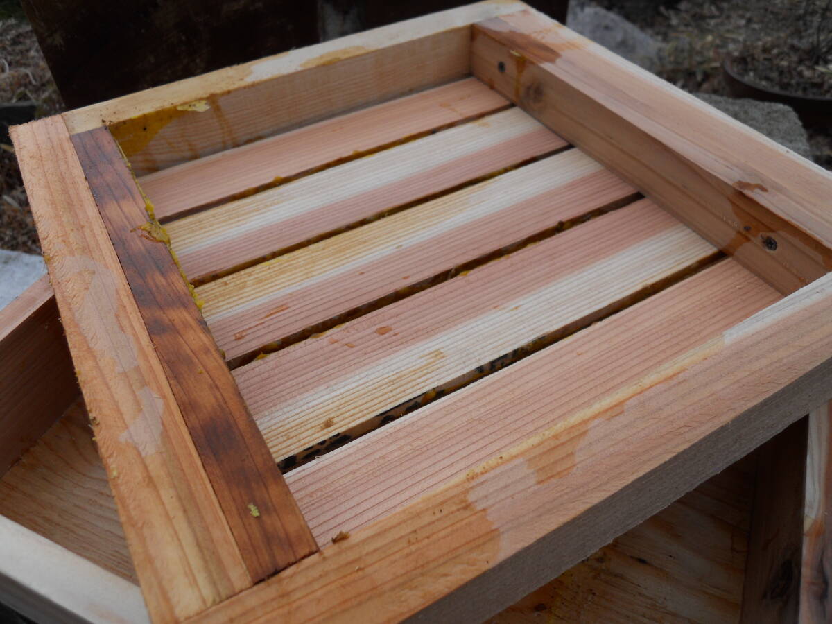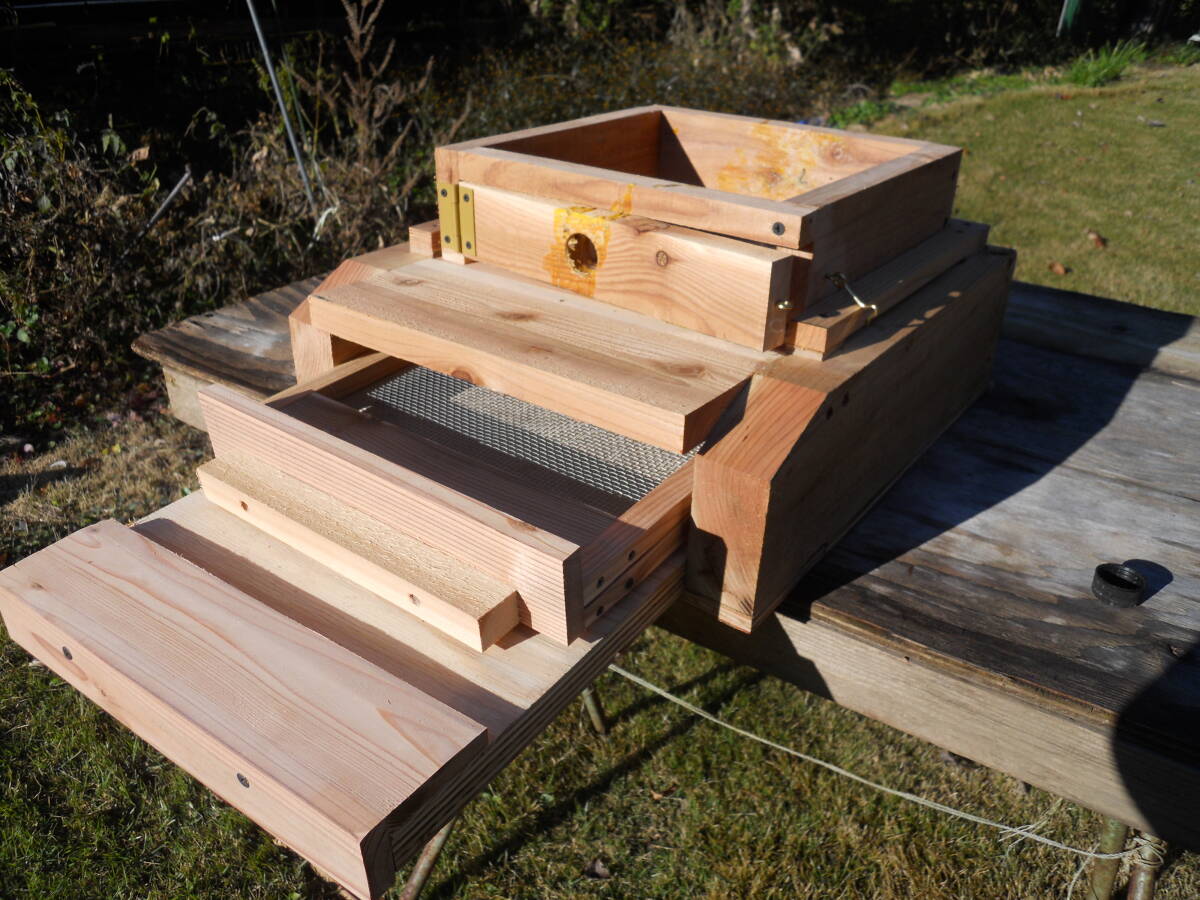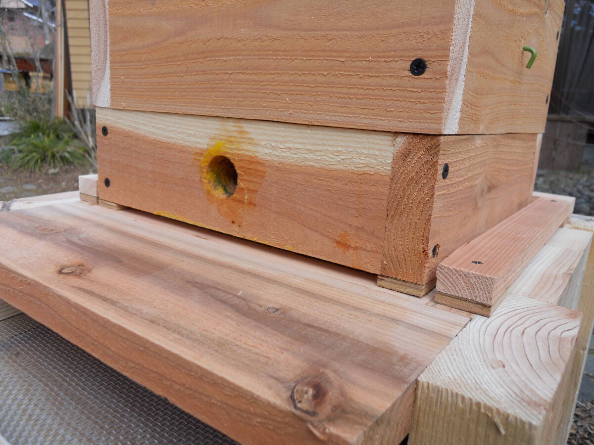 ◇日本ミツバチ 重箱式5段巣箱+脚無し巣箱台(スムシ・アカリンダニ・高温対策) こちらの商品は1群を飼育する為に必要なモノが揃ったセットです! 天蓋、巣門にミツロウを塗布した状態で送ります。 重箱をバラして発送しますので送料が抑えられた分1段おまけも付けます! 重箱5段+おまけ1段とオリジナル台(脚有)のセットです。 重箱のみバラした状態で梱包発送させて頂きます。 ※ バラした状態での梱包にご協力頂けると送料や梱包資材の高騰もあり、送料が抑えられ大変助かります。組立てもインパクトドライバーがあれば簡単です。組立て方法の説明付き。プラスドライバーでも少々時間は掛かりますが 組立可です。ネジ穴も開けてあるので力も要りません。巣箱の説明やミツバチに関する資料も付きます。 ※ 組立てにご協力頂く事で送料を抑えた分で重箱1段おまけが付きます!合計6段 台の脚有りと脚無しは飼育する上では違いは特にありません。好みや設置場所に合った方の台をお選び下さい! 【脚有り】 直接地面に設置可能ですので、設置場所を平らにするだけで他に何も必要ありません。 【脚無し】 コンクリートブロックやビールのプラケース等の上にのせて設置します。台の下に使用する物で巣門の位置、高さを調整出来ます。 高くすると夏場の地面からの照り返しや雨の跳ね返りによる汚れが防げますが、高くし過ぎると継ぎ箱や採蜜の作業が難しくなります。 こちらの商品はオリジナル巣箱台(脚有り)が付いていて1年飼育可能な5段ですのでおススメです。 捕獲に成功してから飼育してみてわかる使い勝手が良い巣箱台だと思っています。 入居に成功したら・・・翌年には分蜂して2群3群捕獲出来るチャンスがあります。 その時は、また巣箱の落札お願い致します! 初心者の方向けに簡易の手引き書A4用紙5枚程度が付きますので巣箱の使い方や捕獲について参考になさってください! 【捕獲する為に】 是非、複数の巣箱を設置する事をおススメします。一般的に設置した巣箱に対して捕獲に成功する確率は3割と言われています。 設置場所の条件や準備の仕方にもよるので一概には言えませんが、複数個所に設置する事も捕獲の近道です。 天蓋、スノコ、巣門に対して重箱2段を用意し、ミツバチを捕獲できそうな場所に設置しましょう。重箱は2段で十分です。3段以上高く積み上げる必要はありません。群が入居して巣の成長に合わせて重箱を足して行きます。 ただ、設置しただけでは入居してくれません。巣箱全体にほのかに蜂蜜の香りがする程度誘引液(ハチミツやミツロウ採った後の煮汁)を塗り、スノコ、巣門にはミツロウを塗ります。これだけで入居する事もありますがまだ足りません。 探索蜂にだけ呼び寄せる効果があるキンリョウヘン(金稜辺)の花が必要です。東洋ランの一種で花からフェロモンを漂わせ引越し先を探している探索蜂を呼び寄せる不思議なランの花です。効果が高いのですが価格もそれなりにしますが必須アイテムです! 代用にミツバチ捕獲ルアーと呼ばれる同様の効果が見込める商品もあります。 自分の経験ですと一度捕獲に成功した場所は、翌年も捕獲出来る事が多いです。そういった場所を見つけるのに最初はあちこち設置しました。上記の準備と合わせて複数の待受巣箱の設置も必要だと思います。 ※別途、待受巣箱の複数セットも出品しております。そちらは巣箱台は付いておりませんがコンクリートブロック、プラケースを使用すれば設置可能です。 今年で日本ミツバチ飼育歴9年ですが、この飼育箱とキンリョウヘンで4、5年前から毎年捕獲と飼育に成功しております。 特に飼育が上手く行くようになった要因は2点です。 まず、この台を使う前の底面を直接掃除するタイプの巣箱よりスムシの被害が格段に減りました。巣箱の底面が引出しになっていて掃除がし易くなりました。引出しなので巣箱内に手を入れなくても掃除が出来るので人間にもミツバチにもストレスがほとんどありません。網と板の2層なので巣くずや花粉等が網を通して落ちるのでスムシも巣に登りにくいです。 【スムシの被害→逃居】 ハチノスツヅリガの幼虫でミツバチの巣が大好物です。自然界では共存しているようですが巣箱による飼育では環境が良く増えすぎて大きくなると巣に侵入し巣を食べながら破壊します。群が弱まると顕著に被害が現れます。 2つ目は、真夏の猛暑で巣落ちがとても心配なのですが、巣門は4方向が開いていて通気性も良くなっているのでその心配が減りました。 それでも直射日光は避けなければいけません。落葉樹の下や遮光するなどの対策は必要です。 【巣落ち→逃居】 巣落ちをするという事は天井から巣版が落下する事です。ハチミツの層、育児エリアが滅茶苦茶になり巣の存続が難しくなります。 巣箱からハチミツが流れ出て、蜂も巣箱の側面に出てきます。 ミツバチにとっての最大級のストレスですので経験者がよっぽど上手く対処しないとほぼ逃居し