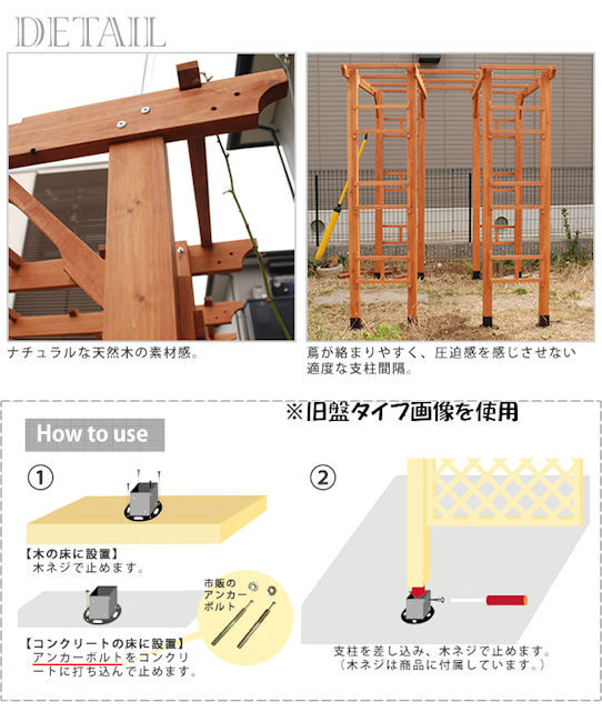 藤の花棚や葡萄棚のようなトンネル状パーゴラに設置する事も可能です