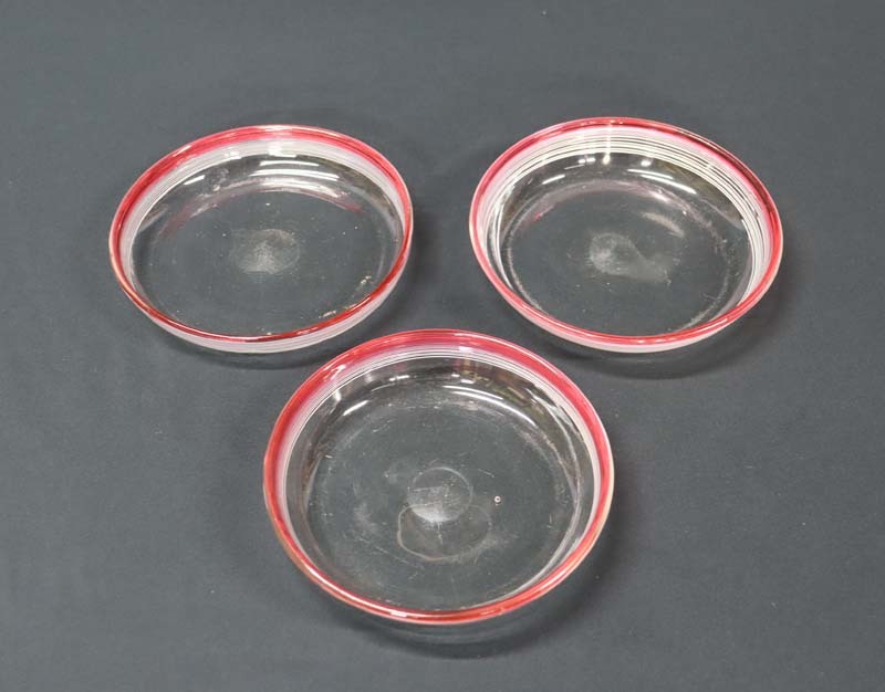 透明ガラスの中皿、口辺部は赤でぼかし、さらに乳白の糸巻文が入っています。