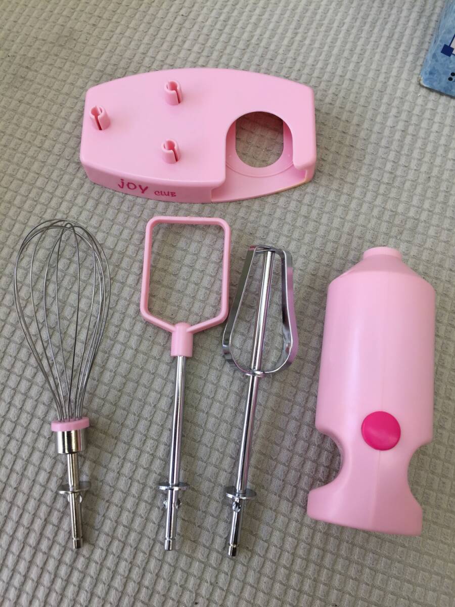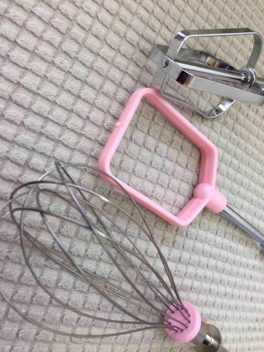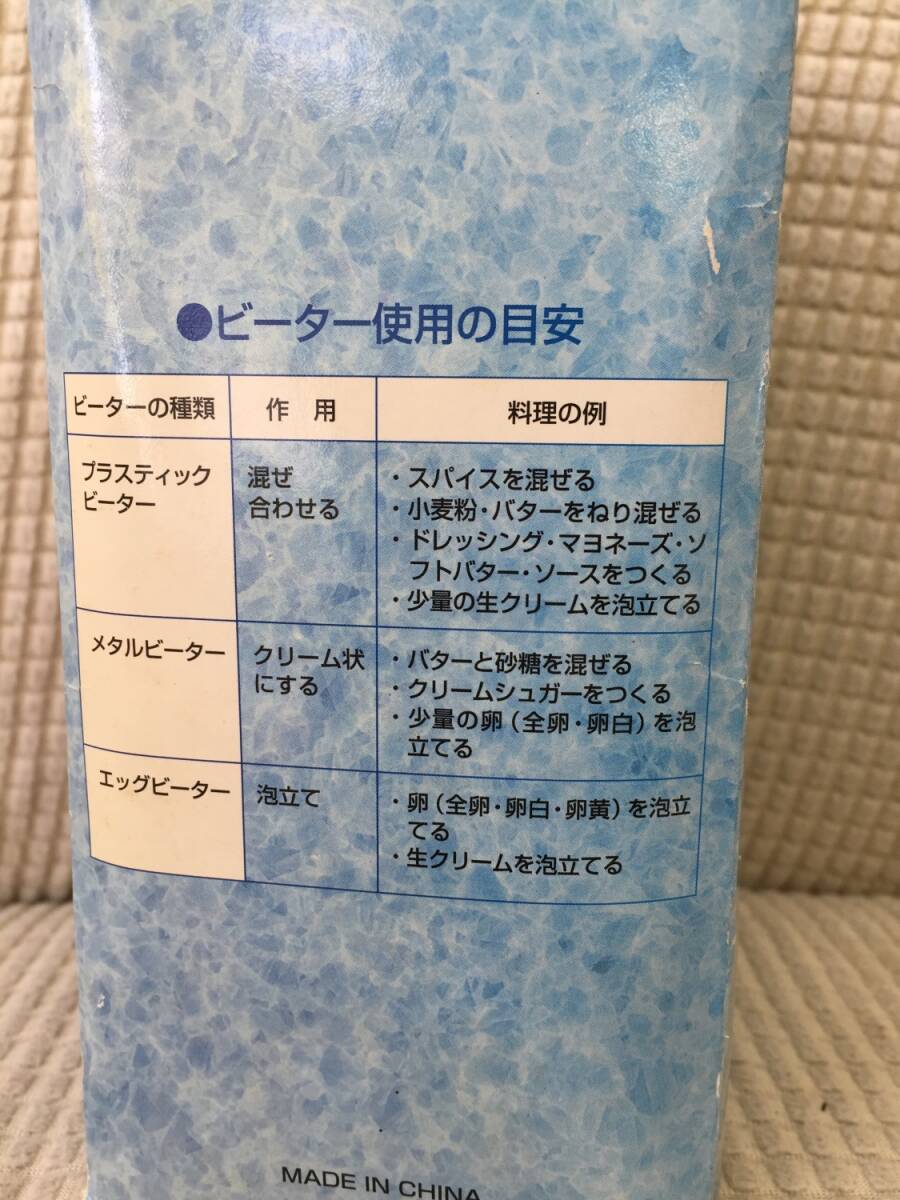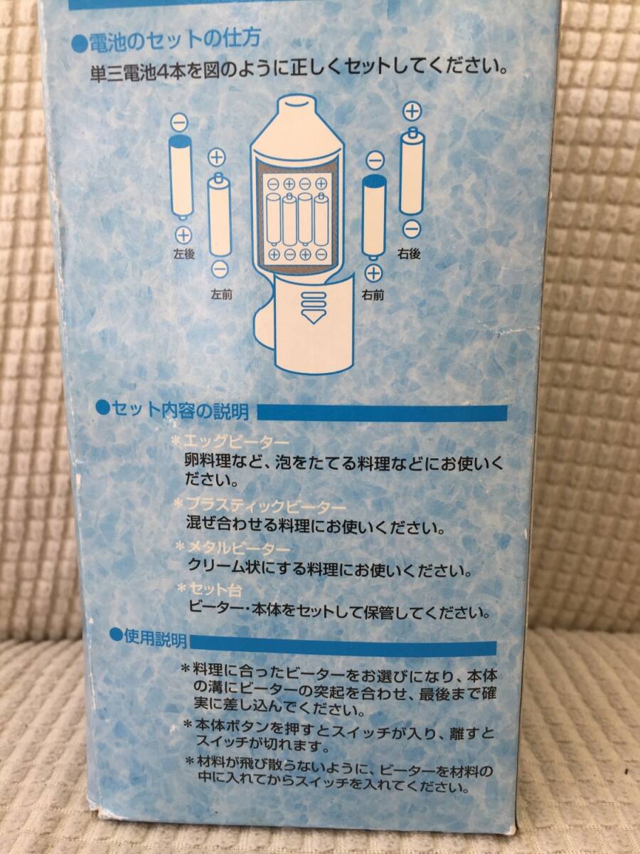 ◎サイズ ハンディミキサー本体の全長 約12.5cm 画像5のものまとめて重量:約 236g ※箱込み総重量:約266g ※多少誤差は生じると思います。 -------------- ◎状態 中古。長期保管品。 画像1にあるものが全てです。 軽く清掃しましたが、画像10のように 台の裏面に白い汚れがあります。 動作確認としまして、私物の電池を入れて スイッチオン。 画像9のようにエッグビーターとメタルビーターは 回転しました。しかし プラスチックビーターはうまく回転しませんでした。 ですのでタイトルに「一部動きが悪い」と記載しました。 (プラスチックビーターはたまに回転しますが、 回転しない方が多いと感じました) 動作確認はここまでです。実際に当方は調理に 使用しておりません。 保証書などもないため、新品のように完璧に 動く保証はありません。あくまで中古品です。 ※電池は付属しません。 箱は折れ、汚れ、日焼けなどダメージがあります。 美品ではありません。 --------------