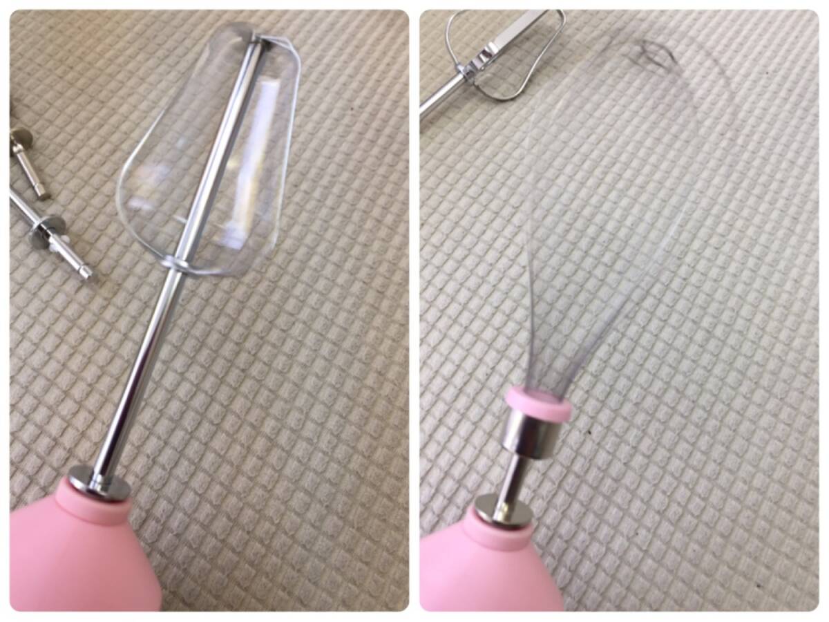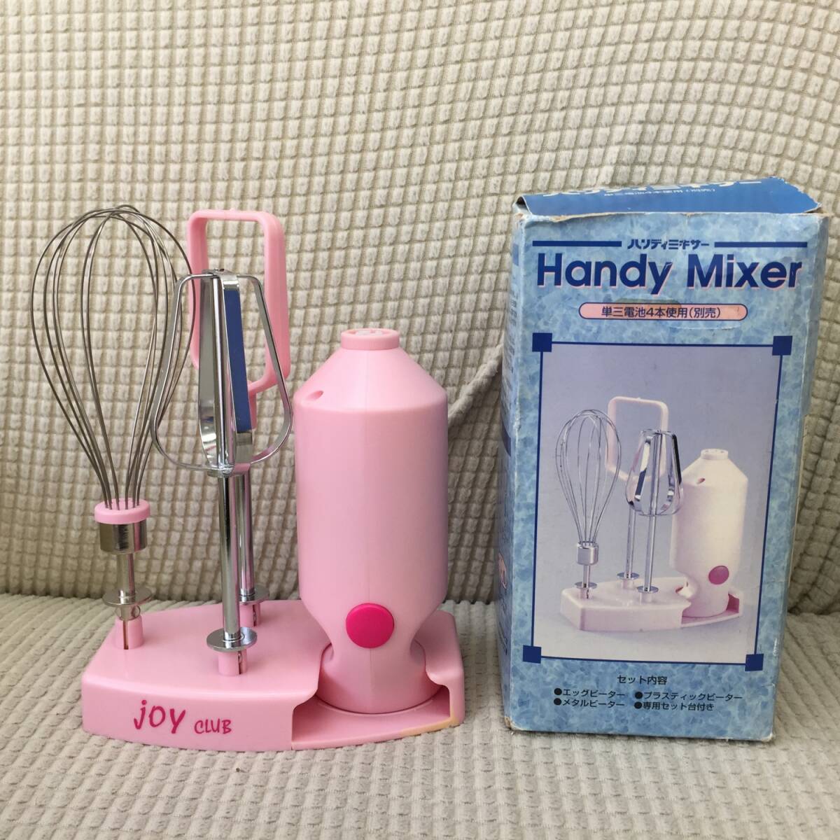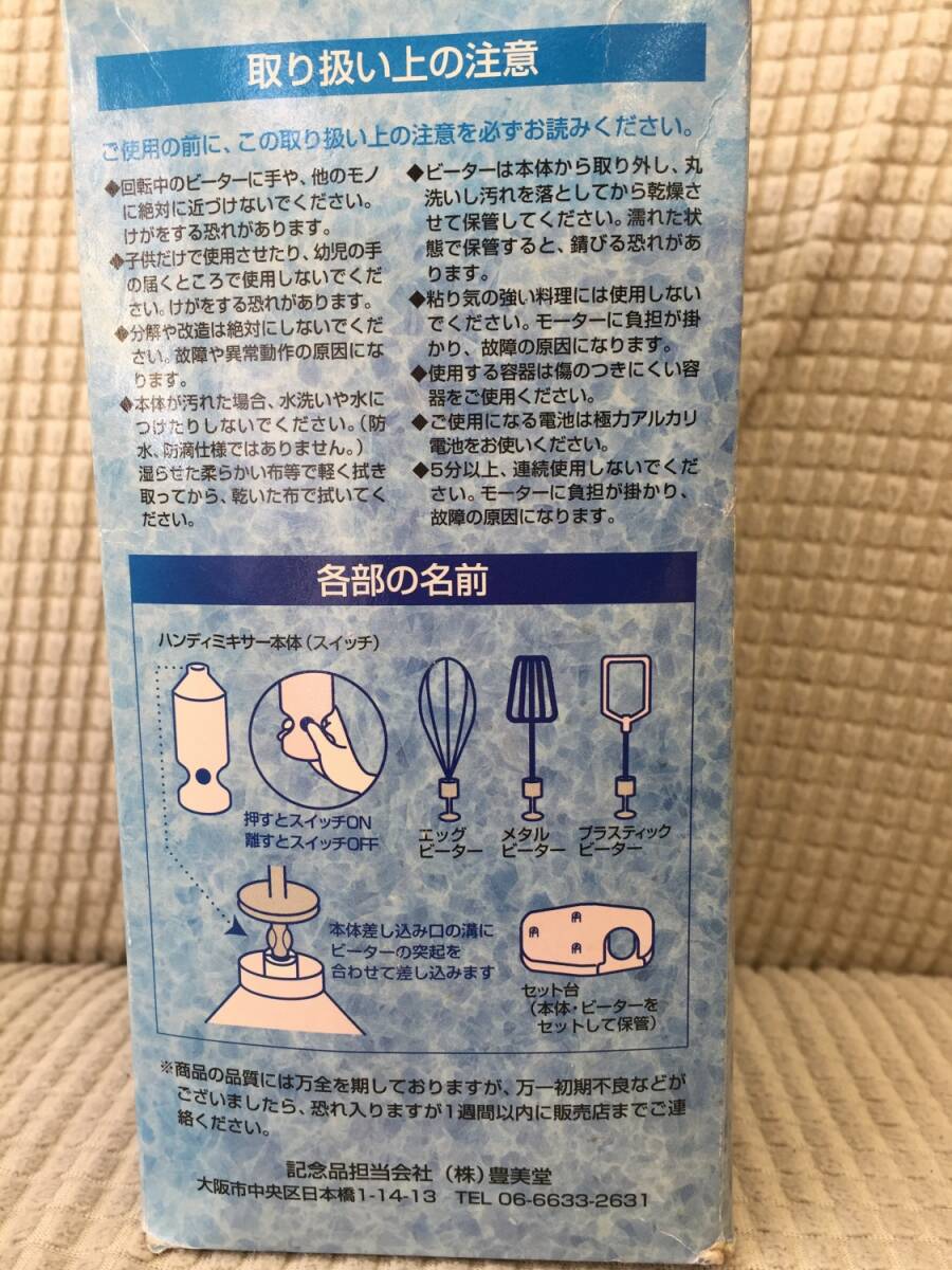 ◎サイズ ハンディミキサー本体の全長 約12.5cm 画像5のものまとめて重量:約 236g ※箱込み総重量:約266g ※多少誤差は生じると思います。 -------------- ◎状態 中古。長期保管品。 画像1にあるものが全てです。 軽く清掃しましたが、画像10のように 台の裏面に白い汚れがあります。 動作確認としまして、私物の電池を入れて スイッチオン。 画像9のようにエッグビーターとメタルビーターは 回転しました。しかし プラスチックビーターはうまく回転しませんでした。 ですのでタイトルに「一部動きが悪い」と記載しました。 (プラスチックビーターはたまに回転しますが、 回転しない方が多いと感じました) 動作確認はここまでです。実際に当方は調理に 使用しておりません。 保証書などもないため、新品のように完璧に 動く保証はありません。あくまで中古品です。 ※電池は付属しません。 箱は折れ、汚れ、日焼けなどダメージがあります。 美品ではありません。 --------------
