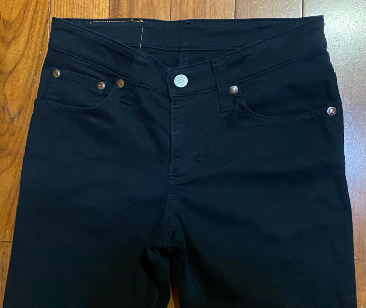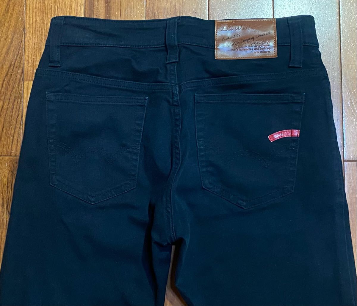 エドウィンのストレッチデニムパンツ、506FGです。色はブラックです。USEDですが状態は良いです(10段階中8程度)。生地はストレッチ入りで綿98%、ポリウレタン2%です。ジッパーフライ、裾はチェーンステッチです。正規品です((株)エドウイン、中国製)。サイズはW28でウエストは重ねずに平置きで約78cm、ヒップ約98cm、股上約24cm、股下約84cm、股下15cmのふともも部分約49cm、裾まわり約35cm、重量約520gです。発送はゆうパケットポストになります。