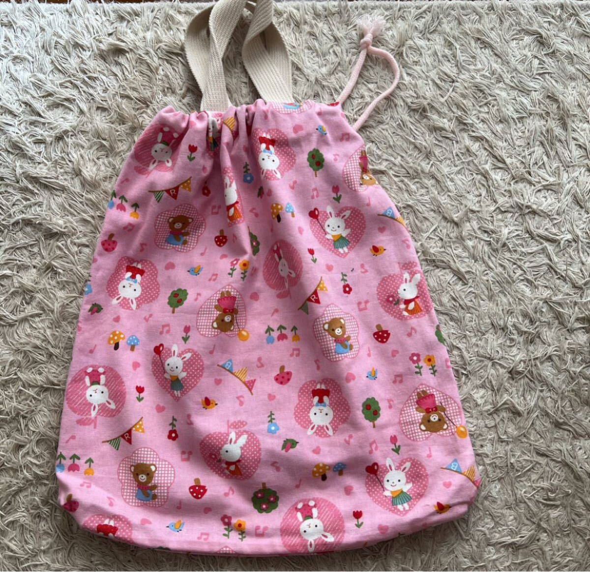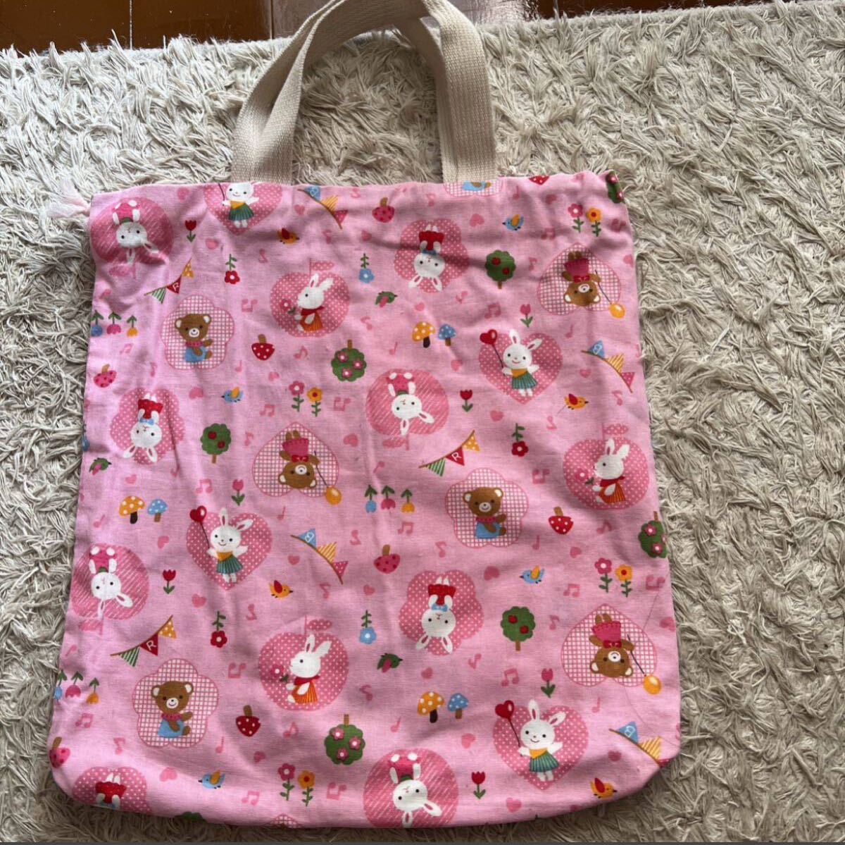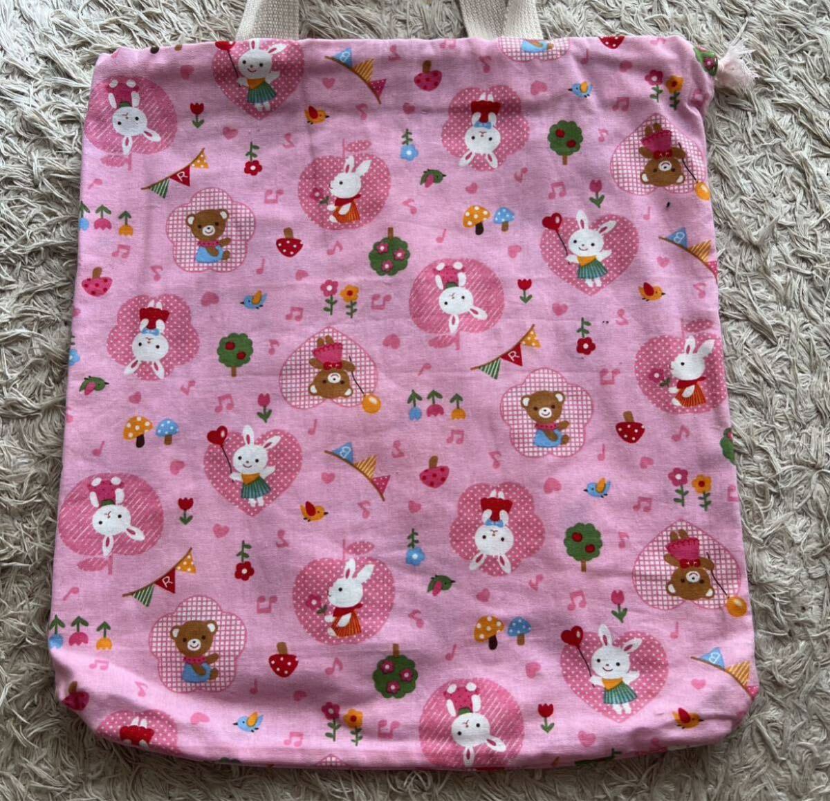 ハンドメイド キッズ うさぎプリント 巾着トートバッグ 約34×32cm
