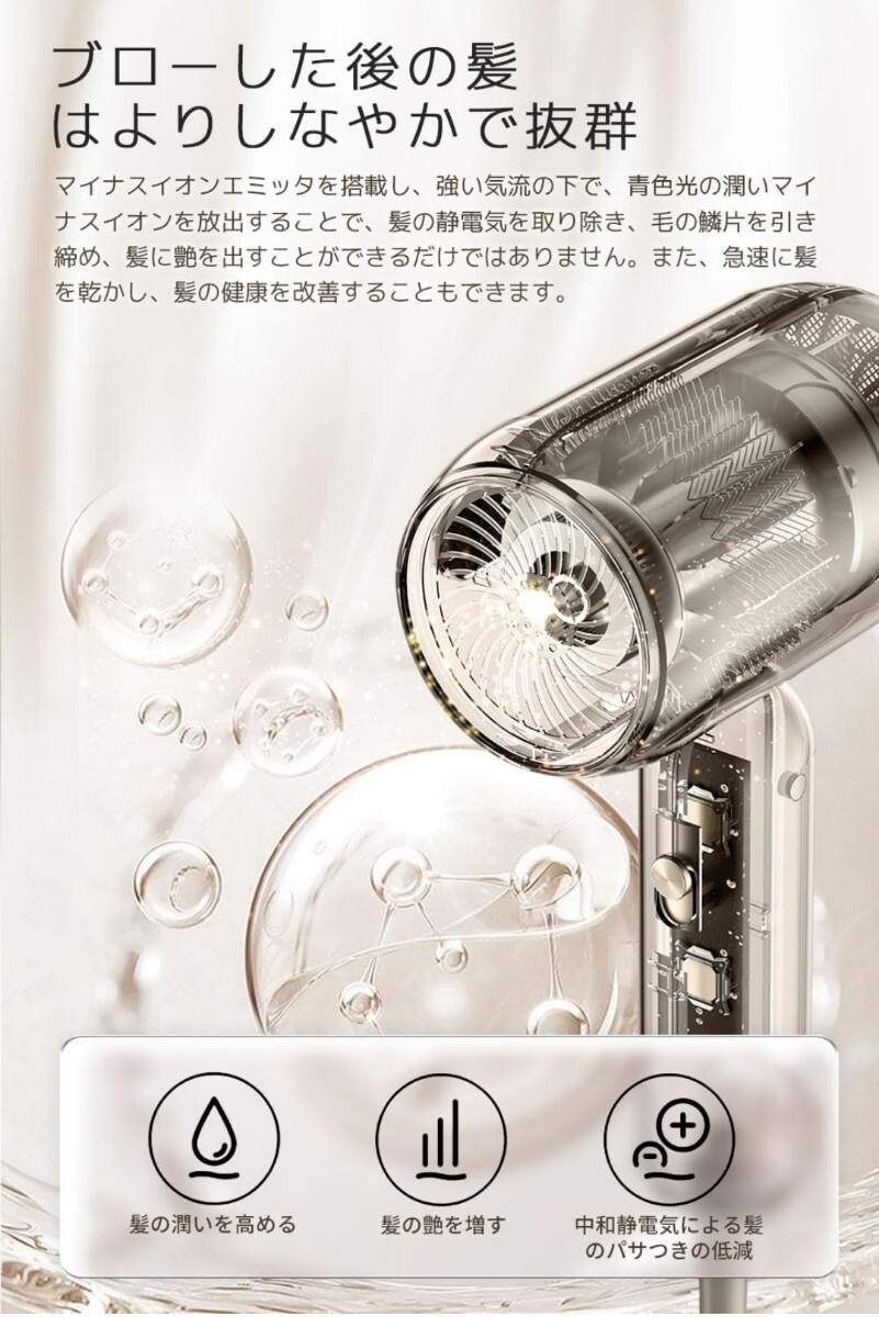 【2億高濃度マイナスイオン・青色LED】青色LEDとマイナスイオンを結合し、毛鱗を引き締め、髪の枝分かれを減らし、乱れた髪に別れを告げ、髪質を効果的に改善して綺麗な髪を作ます。マイナスイオンエミッタを搭載、強い気流中、青色光の潤いマイナスイオンを放出することで、髪中のプラス電荷を中和し、静電気の蓄積を減少させ、髪に艶を出すことができます。