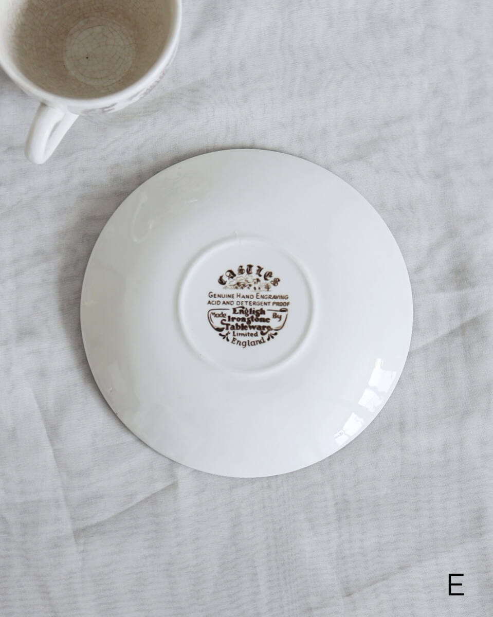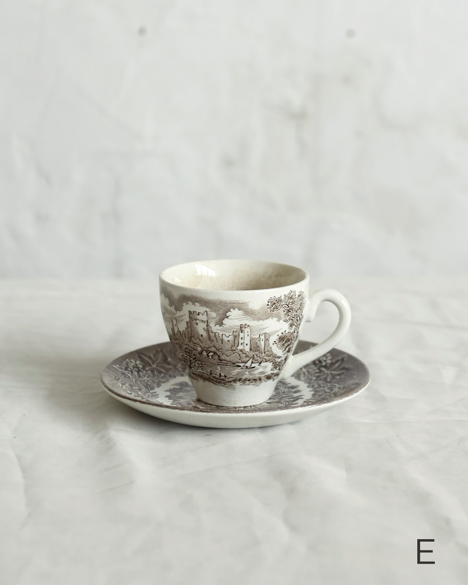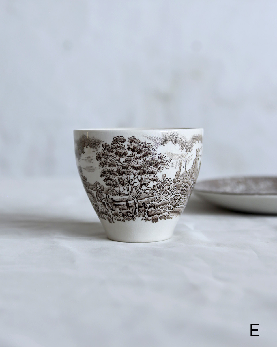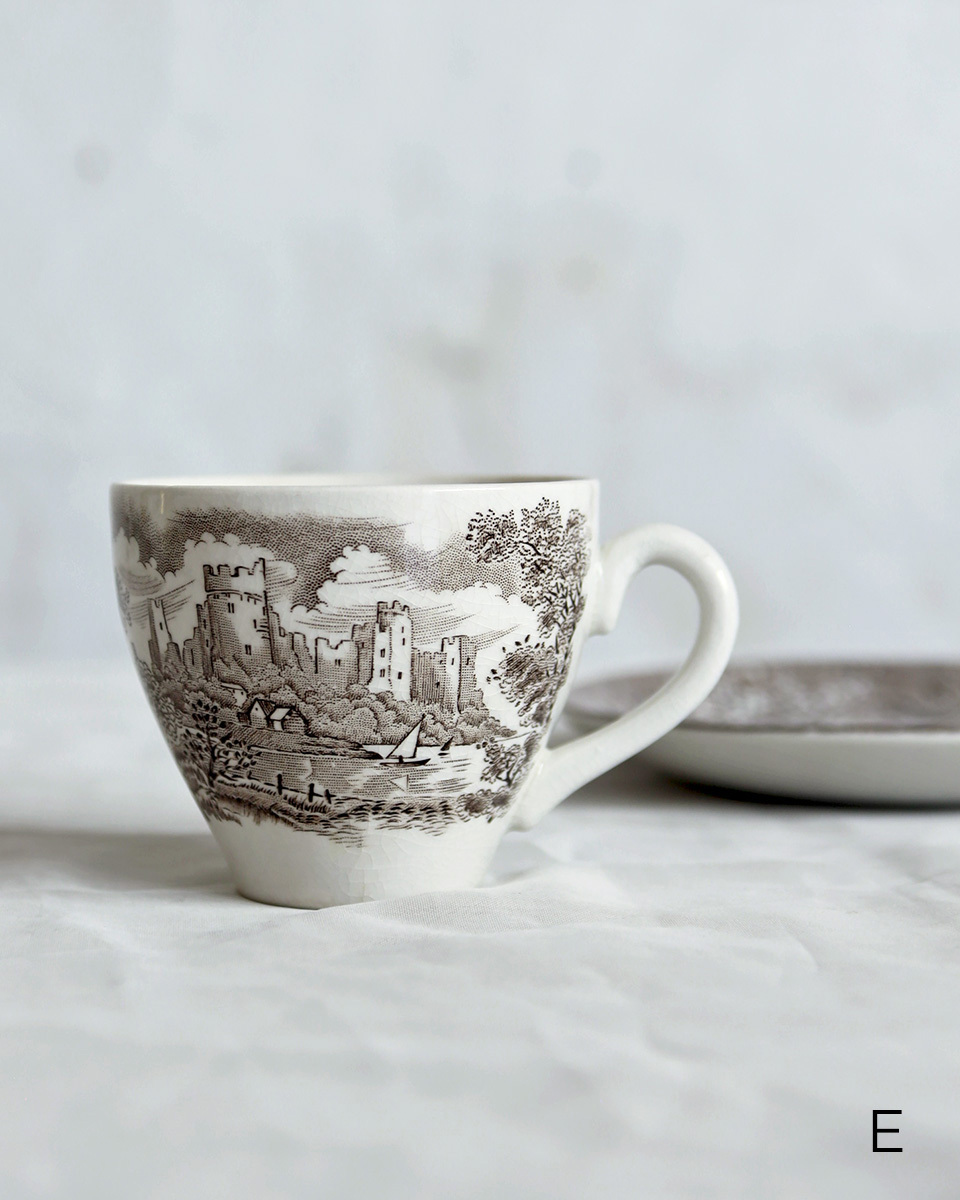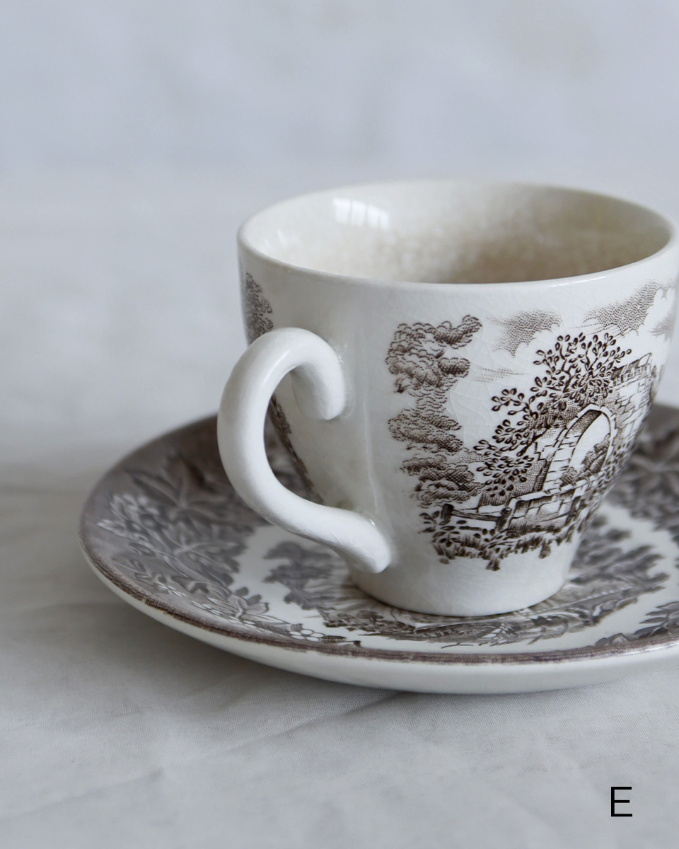 From : France イングリッシュ・アイロンストーン・テーブルウェア社 の"CASTLES"と名付けられたカップ&ソーサーです。 お城や村の風景が、ブラウンカラー1色で描かれており 上品で落ち着いた雰囲気が魅力的です。 ・ ENGLISH IRONSTONE TABLEWARE ENGLISH IRONSTONE TABLEWARE(略:EIT) の歴史は、 1946年に陶器産業の町、ストークオントレントに設立された WASHINGTON POTTERY 社に始まります。 工場を立ち上げ、主にホテルやレストラン向けの食器を製造していました。 1972年にEITに社名変更し、庶民向けの陶器を製造していましたが、 1994年にその歴史を閉じました。ライセンスを取得し、 ビートルズ絵柄の商品を販売したことでも知られています。 こちらは1点ずつの販売となっており、在庫が3点ございます。 それぞれ少しずつ濃淡が異なっております。 また、カップ内側全体に細かな貫入があり、貫入部分に色沈着がございます。 恐れ入りますが、予めご了承くださいませ。 食器として実際にお使いいただく際の衛生面での保証はいたしかねます。 大変恐れ入りますが、お客様ご自身の判断でご使用くださいませ。 商品はアンティーク品のため、お写真では伝わり 難い色褪せや小傷、汚れや貫入などがございます。 追加のお写真をご希望の方はお気軽にお問合せくださいませ。 |