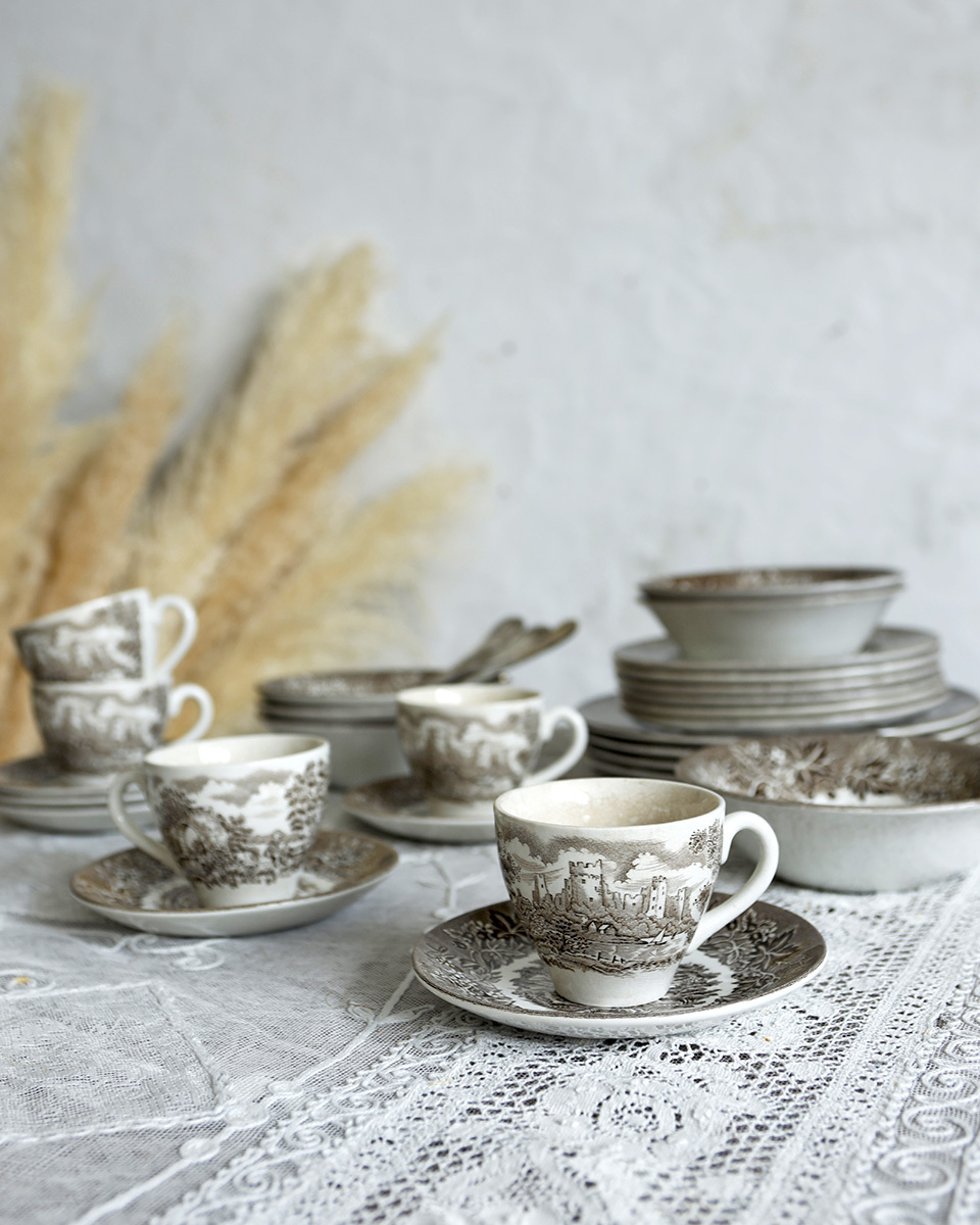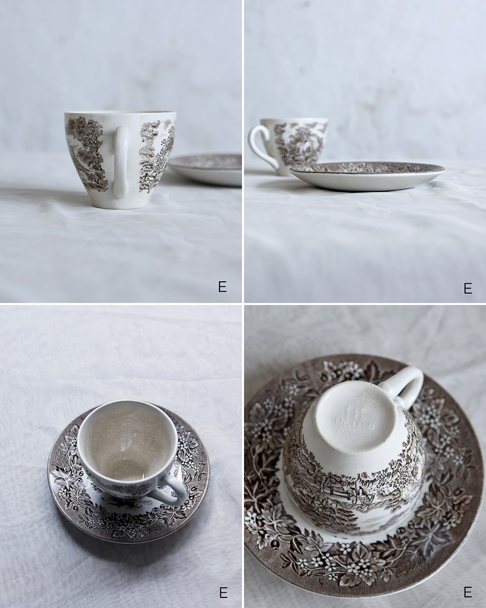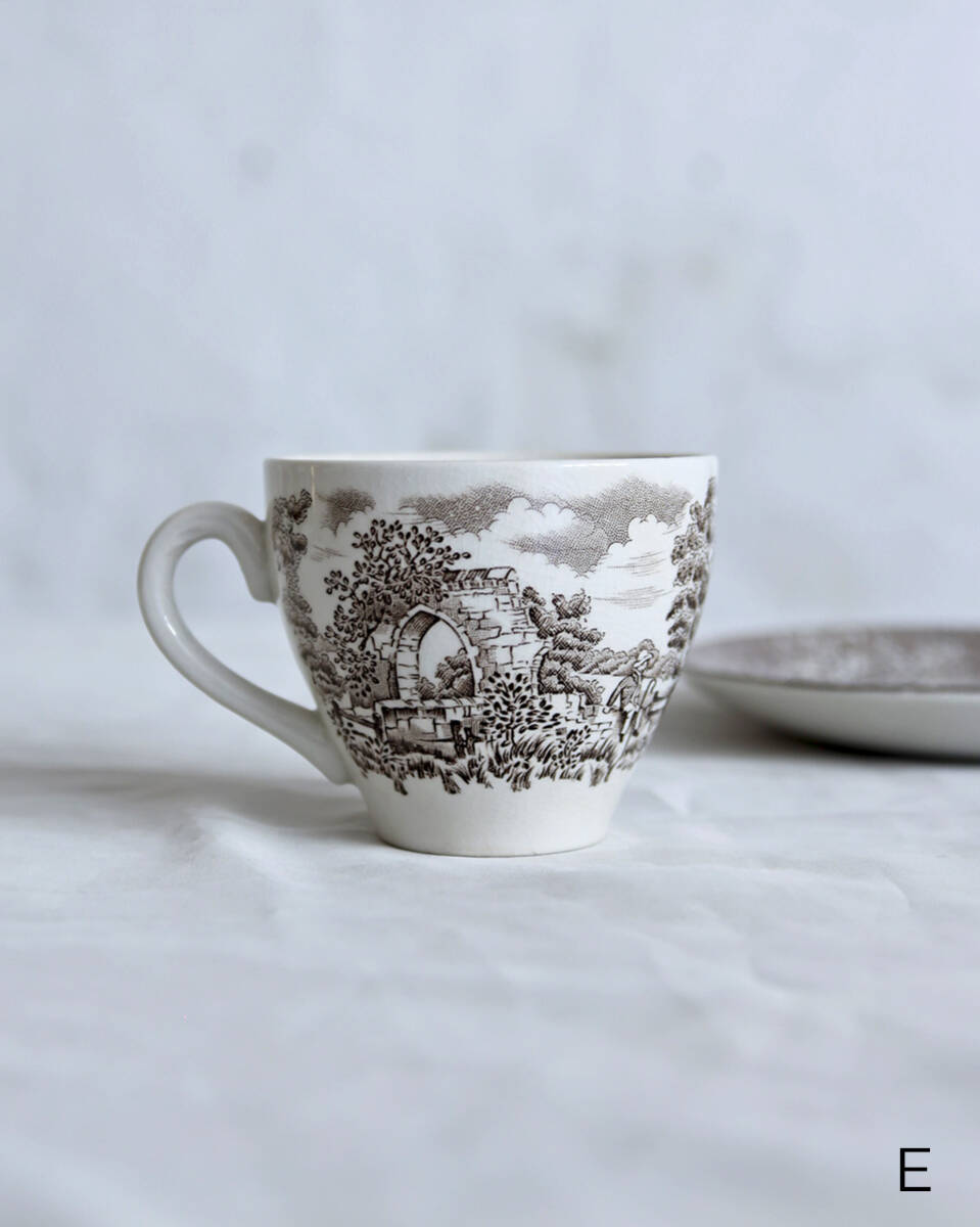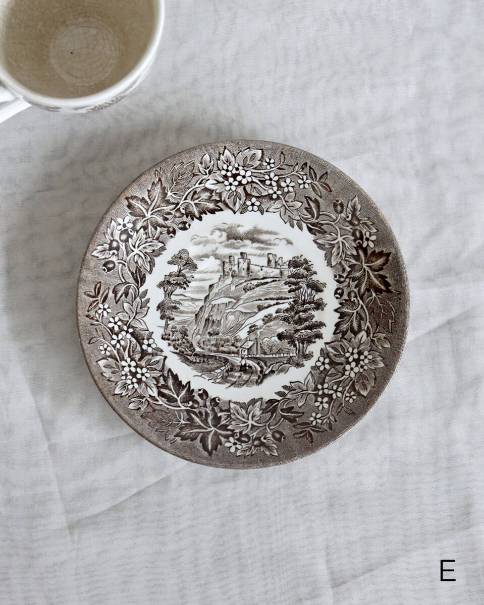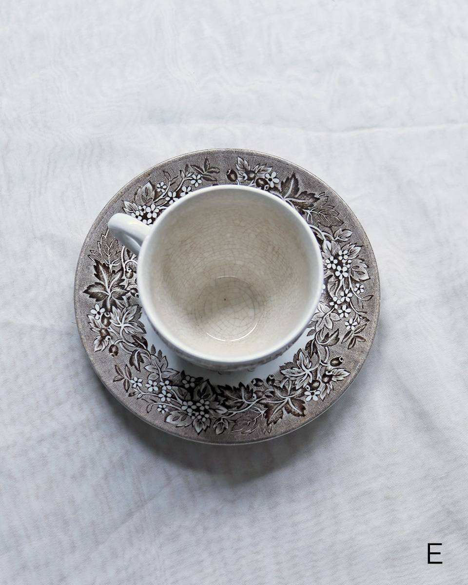 From : France イングリッシュ・アイロンストーン・テーブルウェア社 の"CASTLES"と名付けられたカップ&ソーサーです。 お城や村の風景が、ブラウンカラー1色で描かれており 上品で落ち着いた雰囲気が魅力的です。 ・ ENGLISH IRONSTONE TABLEWARE ENGLISH IRONSTONE TABLEWARE(略:EIT) の歴史は、 1946年に陶器産業の町、ストークオントレントに設立された WASHINGTON POTTERY 社に始まります。 工場を立ち上げ、主にホテルやレストラン向けの食器を製造していました。 1972年にEITに社名変更し、庶民向けの陶器を製造していましたが、 1994年にその歴史を閉じました。ライセンスを取得し、 ビートルズ絵柄の商品を販売したことでも知られています。 こちらは1点ずつの販売となっており、在庫が3点ございます。 それぞれ少しずつ濃淡が異なっております。 また、カップ内側全体に細かな貫入があり、貫入部分に色沈着がございます。 恐れ入りますが、予めご了承くださいませ。 食器として実際にお使いいただく際の衛生面での保証はいたしかねます。 大変恐れ入りますが、お客様ご自身の判断でご使用くださいませ。 商品はアンティーク品のため、お写真では伝わり 難い色褪せや小傷、汚れや貫入などがございます。 追加のお写真をご希望の方はお気軽にお問合せくださいませ。 |