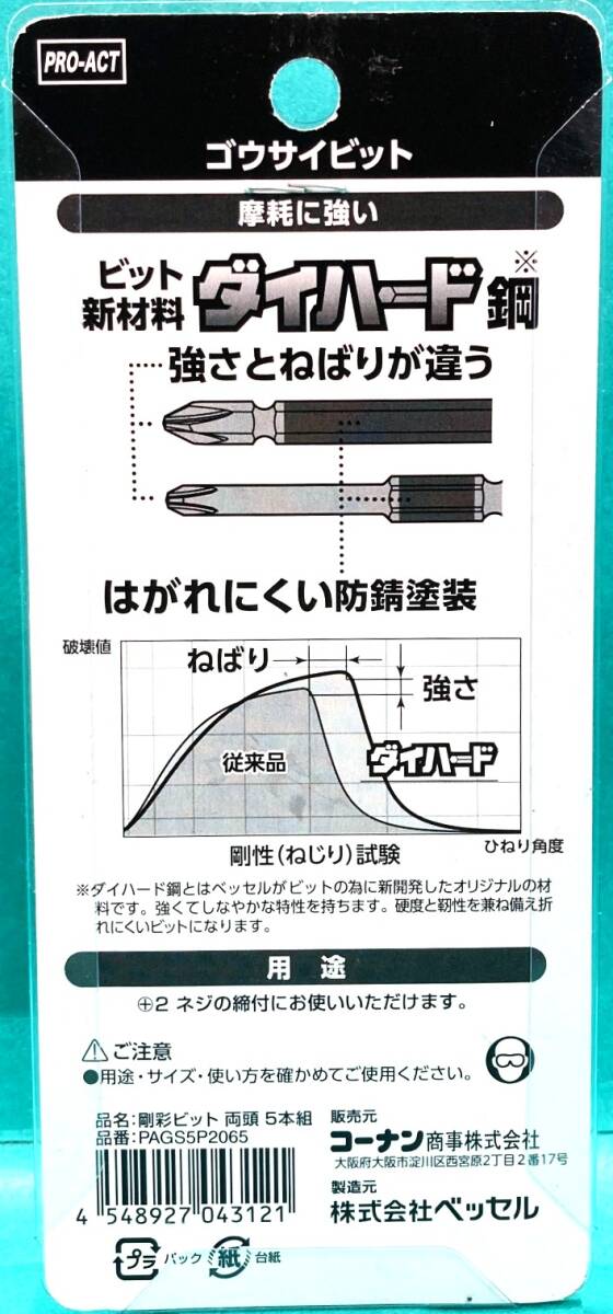 | 商品説明 | カテゴリー:電動インパクトドリルドライバー用ビット メーカー:VESSEL(株式会社ベッセル) 品番:PAGS5P2065 数量・内容:5本セット L:65mm×6.35mm 両頭 (+2ネジ用) 材質:ダイハード鋼(HRC62) マグネット 対応機種:40V対応品(18Vにも対応) 状態:新品未使用・未開封 日本製(MADE IN JAPAN) ★ダイハード鋼の採用で、折れ・ねじれに強い。 強さとねばりが違う ※ダイハード鋼とはベッセルがビットの為に新開発したオリジナルの材料です。 強くてしなやかな特性を持ちます。 硬度と靭性を兼ね備え折れにくいビットになります。 ★はがれにくい防錆塗装 |