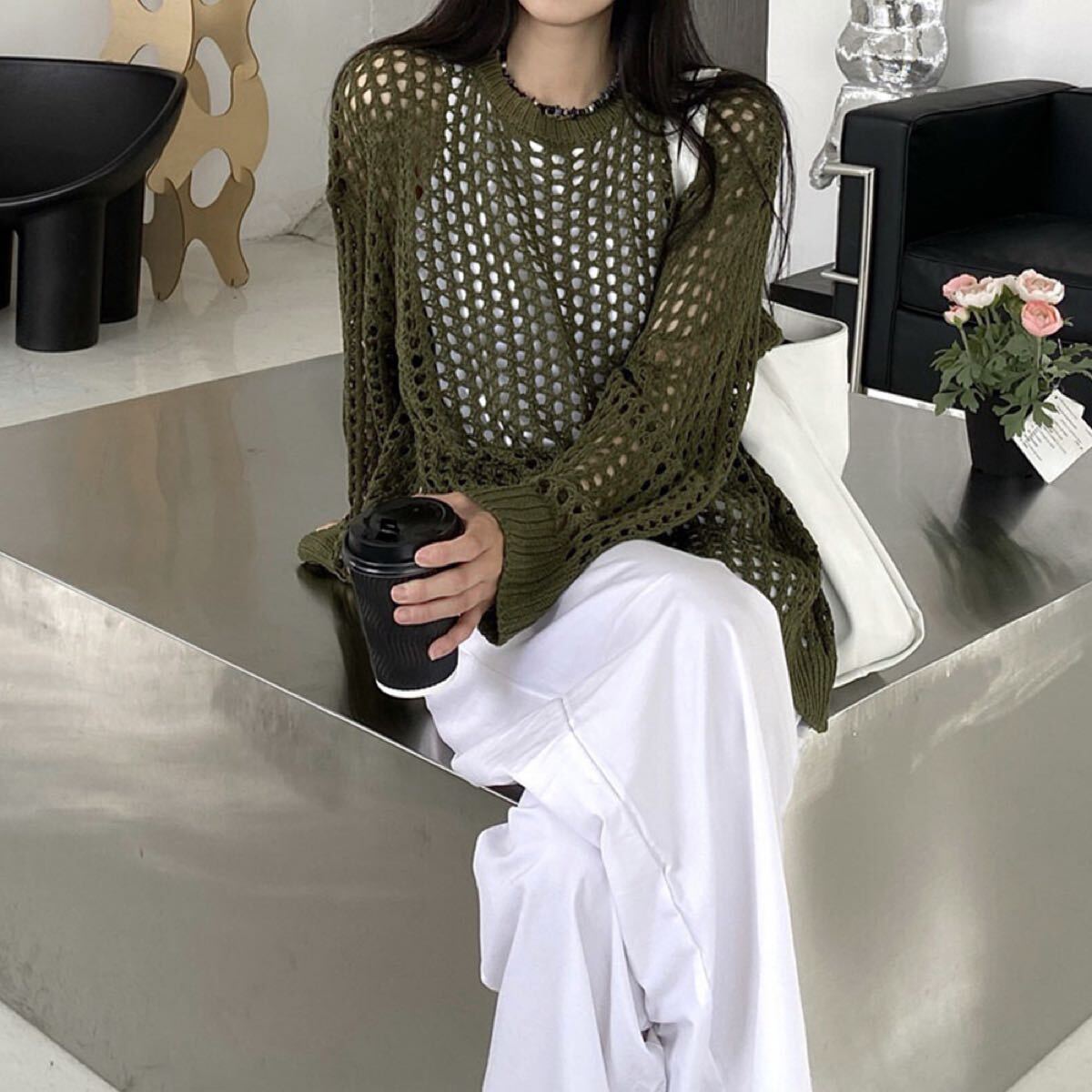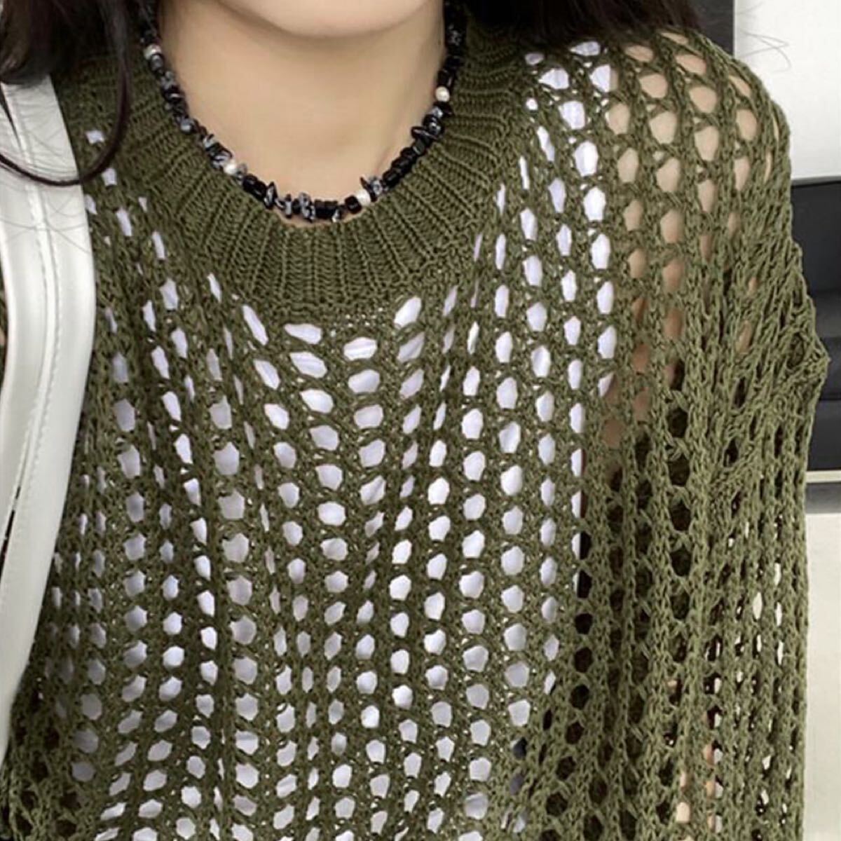 メッシュトップス秋/ざっくりニット春夏/かぎ編みニット大人