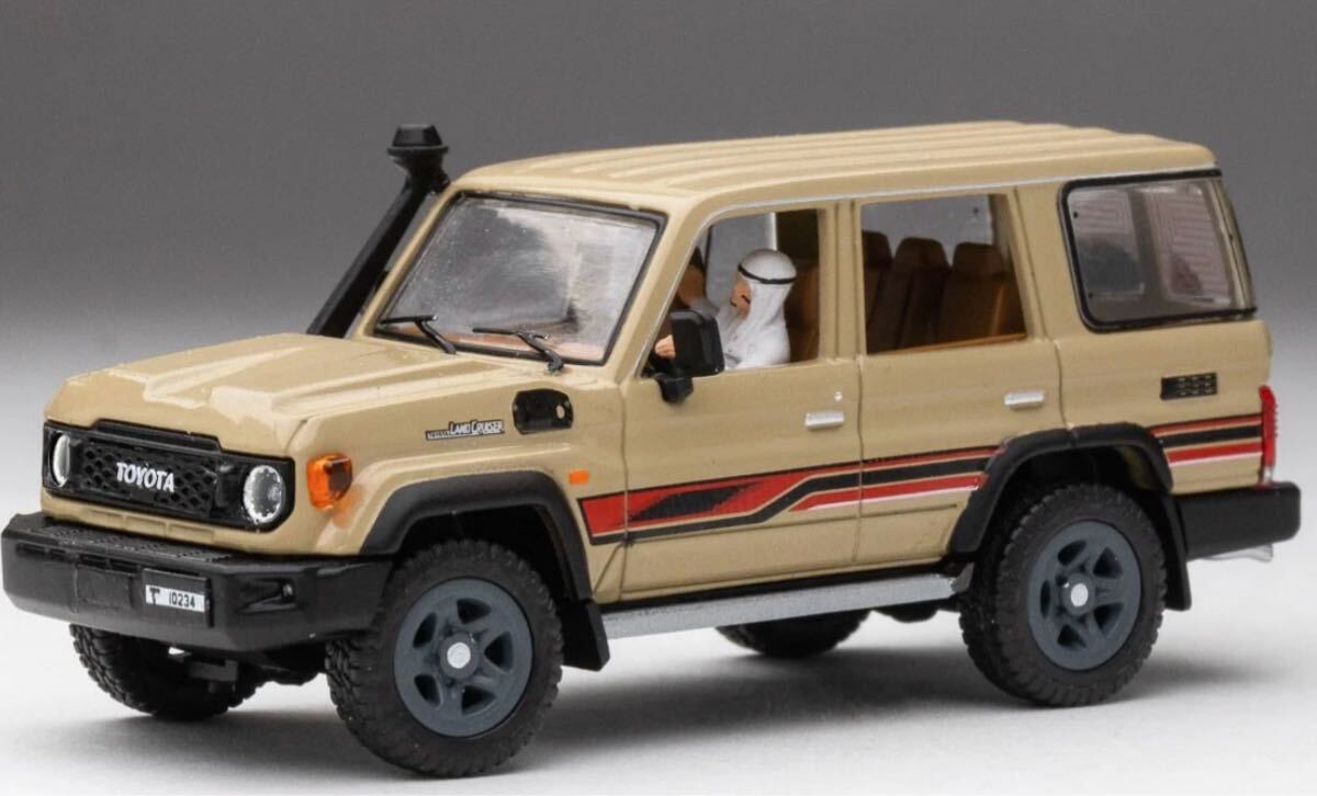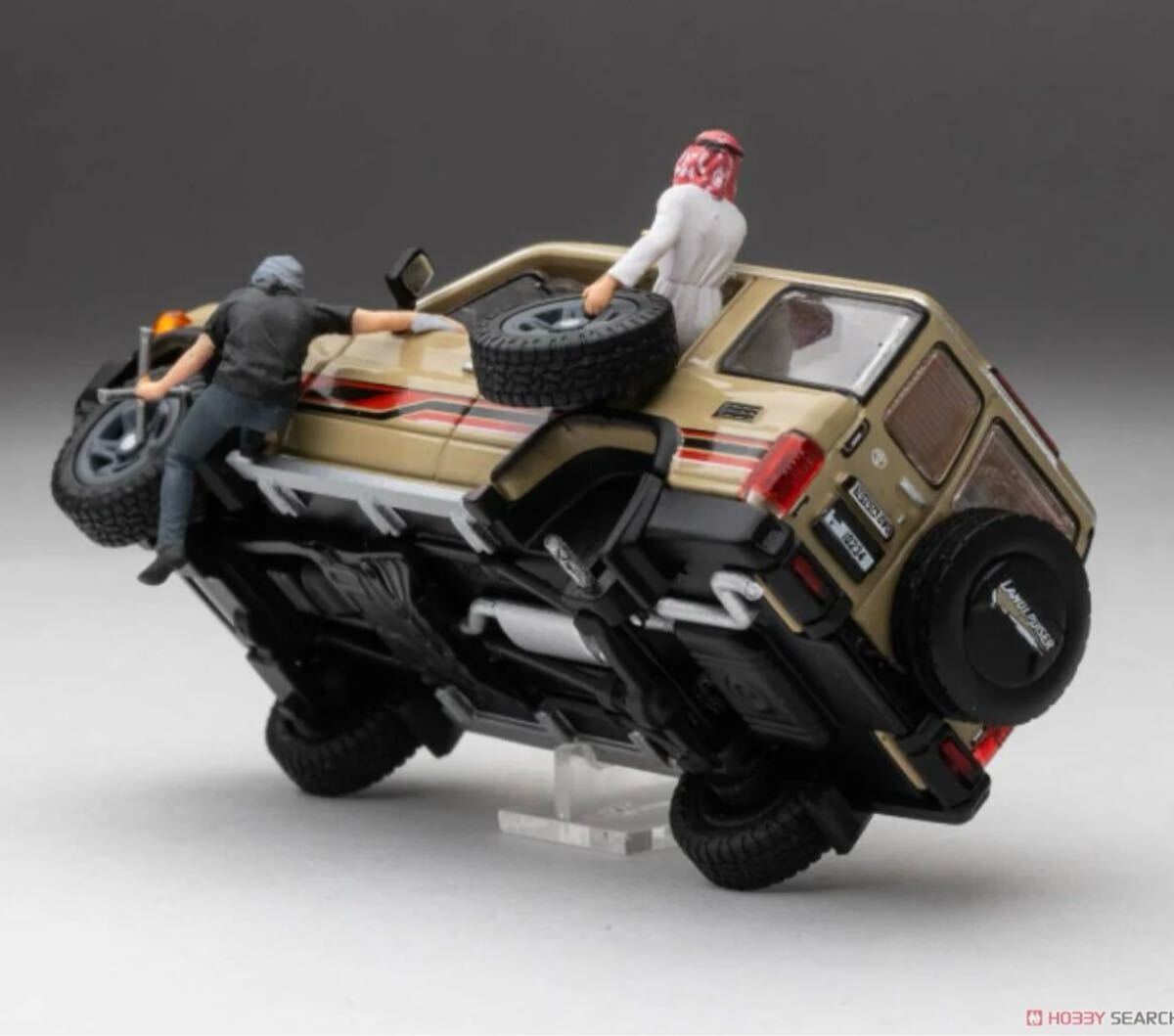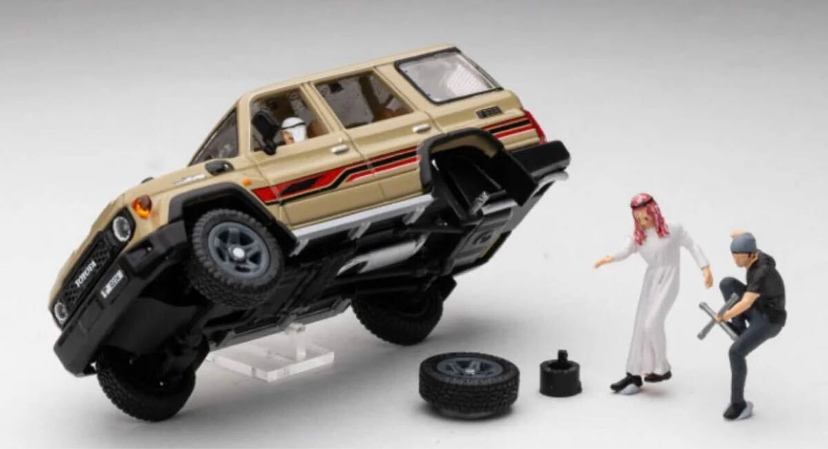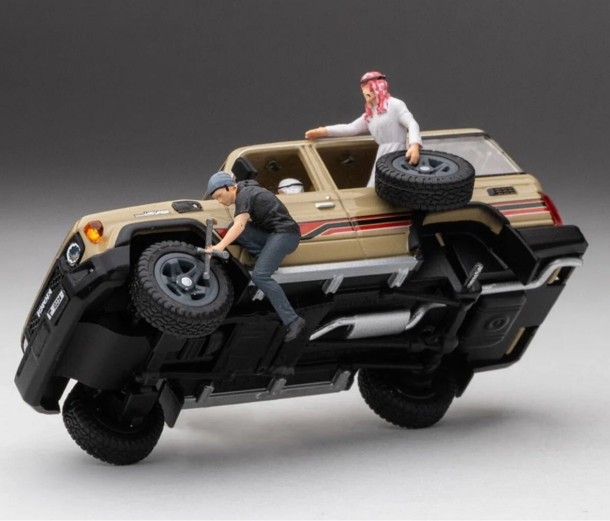 YouTubeやinstagramなどでおなじみの高速道路をランドクルーザー70を片輪走行しながらタイヤ交換する動画をミニカーにしたモデルになります。