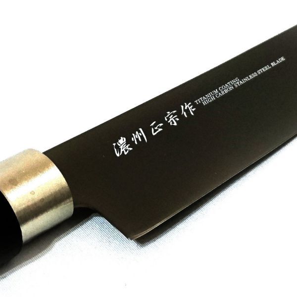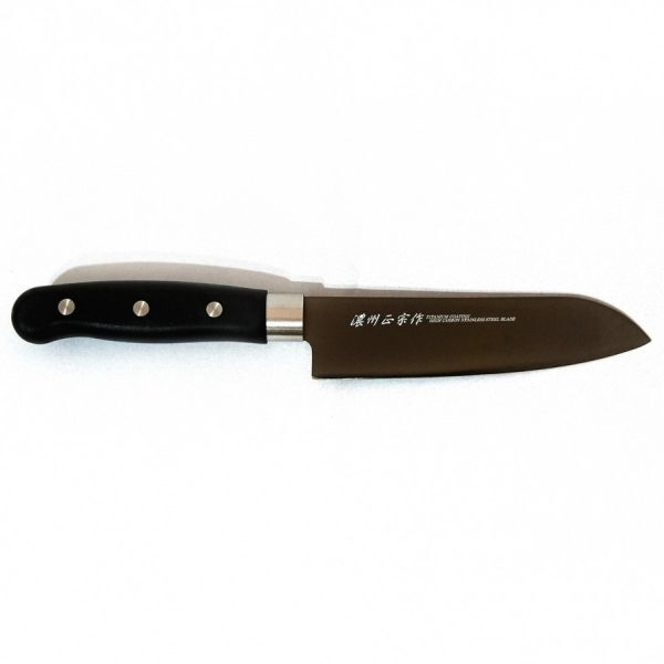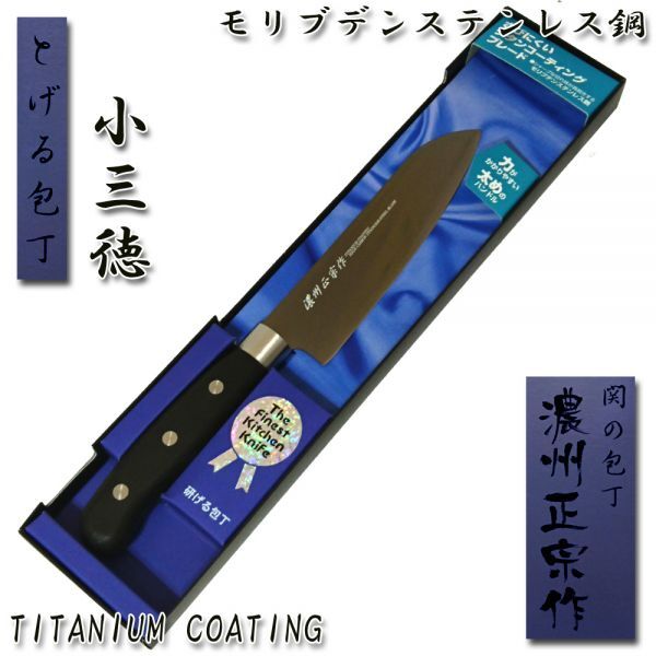 「金物のまち、関の本格お料理包丁」 小三徳包丁(万能包丁) サイズ(約): 全 長:23.5cm 刃渡り:12cm 重 量:0.06kg 材質: 刃部:モリブデンステンレス刃物鋼 (チタンコーティング) 柄 :PP樹脂 原産国: 日本製 (岐阜県関市) ★本格料理包丁が切れ味抜群なのに激安価格! 研げる(とげる)包丁 700余年の伝統を受け継いでいる刃物の町 「美濃国 関」で造られました。 伝統ある日本刀鍛練の最高技術に 優秀な機械技術を加える事により 切れ味、美しさ、品質、 全てにおいて最高の和包丁を作り上げることに成功。 楽しいお料理の必需品! 末永く御愛用下さい! 樹脂ハンドルで、 汚れにくく、水にも強く、衛生的です。 モリブデンステンレス鋼チタンコーティングにより、 一般のステンレス包丁に比べ、さらに錆びにくい! |