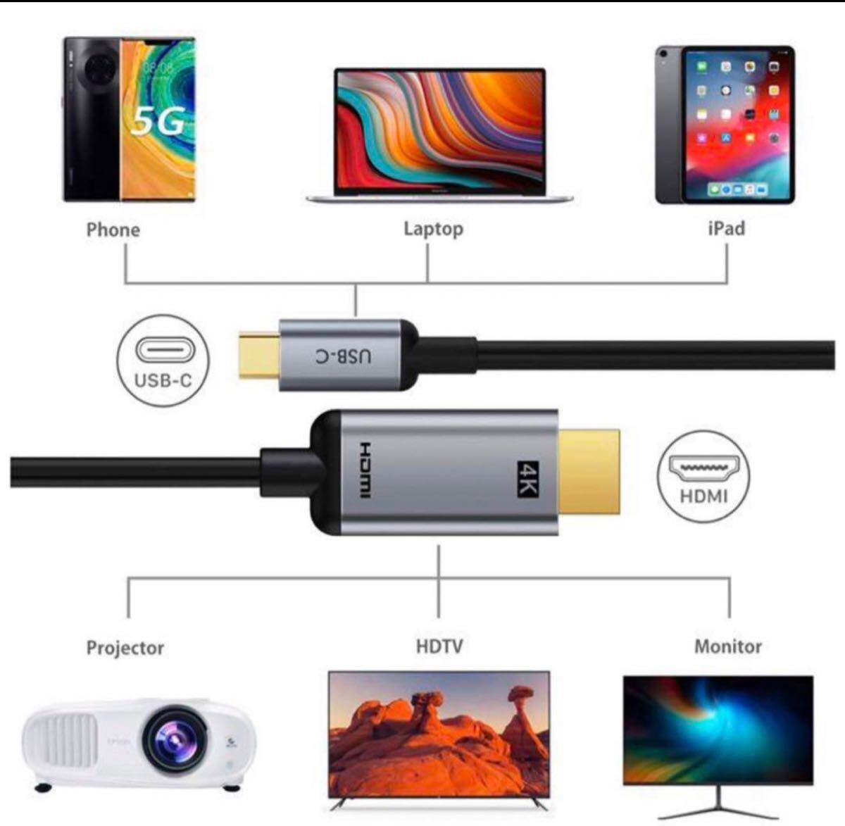【USB Type-C HDMI変換】4K映像をUSB Type C端子の携帯やパソコンからテレビなどの外部HDMIデバイス(テレビ、モニター、プロジェクト等)に変換するアダプタケーブルです。ご使用の設備に挿すだけですぐ映ります。面倒な設定やドライバ、アダプター、電源出力は一切不要です。