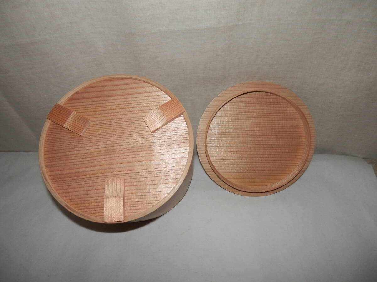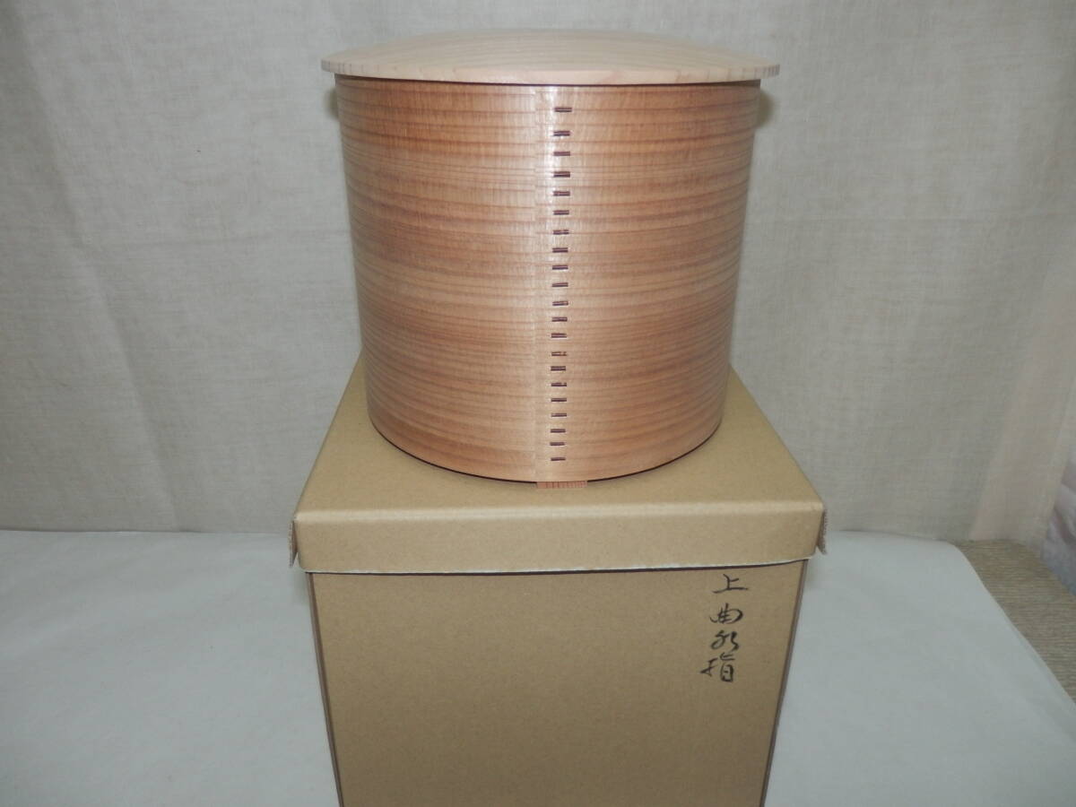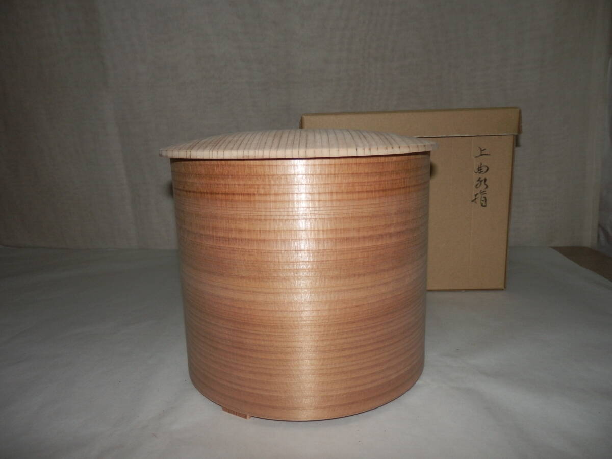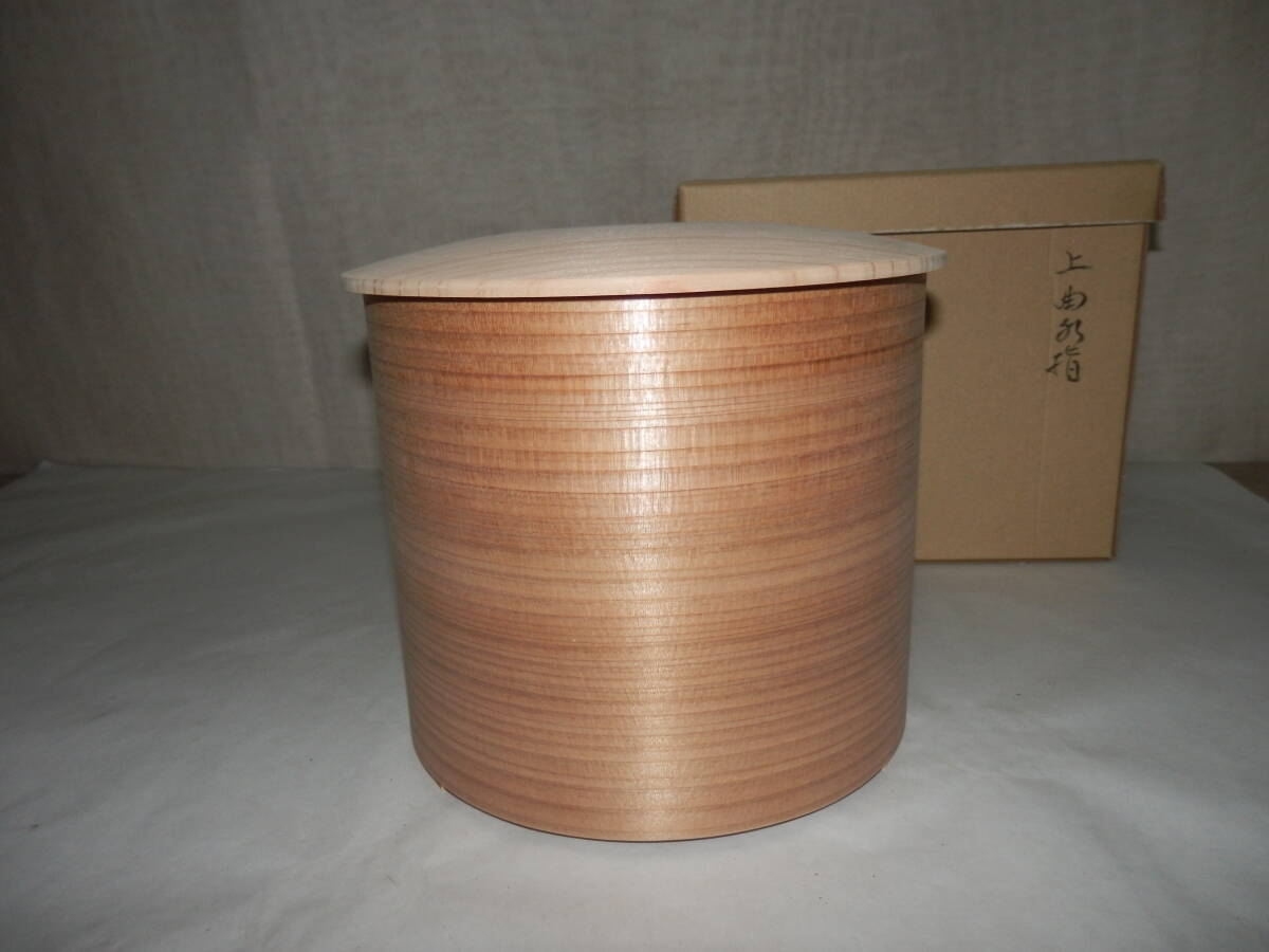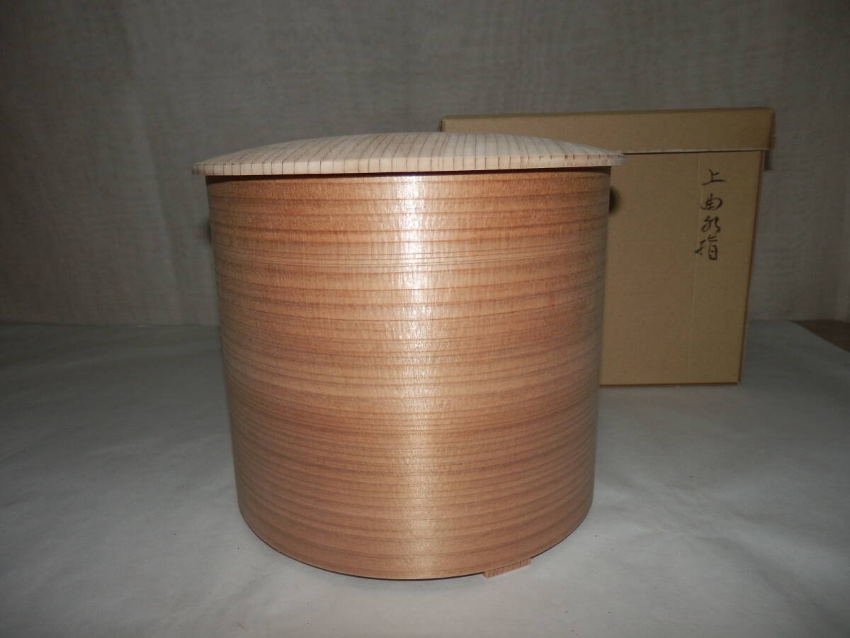 「新品・茶道具」秋田杉製の曲水指です。{上}です。 胴径約17.7cm 蓋径約18.5cm 高さ約17cm 紙箱。 どうぞ宜しく。