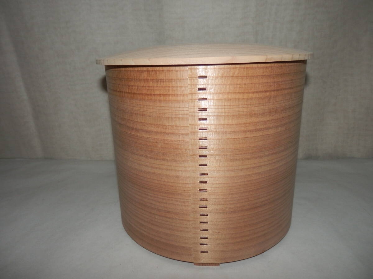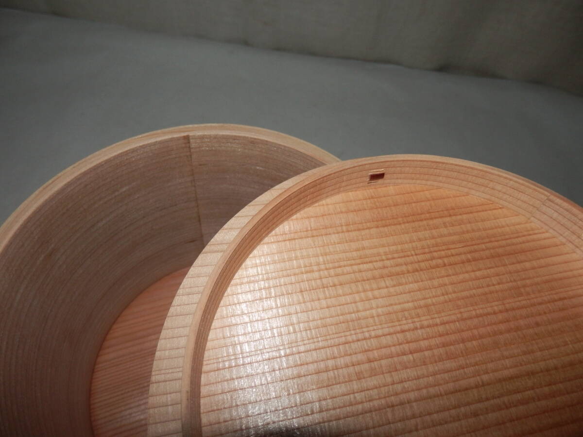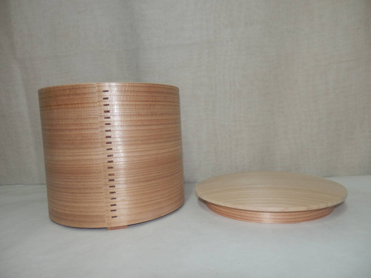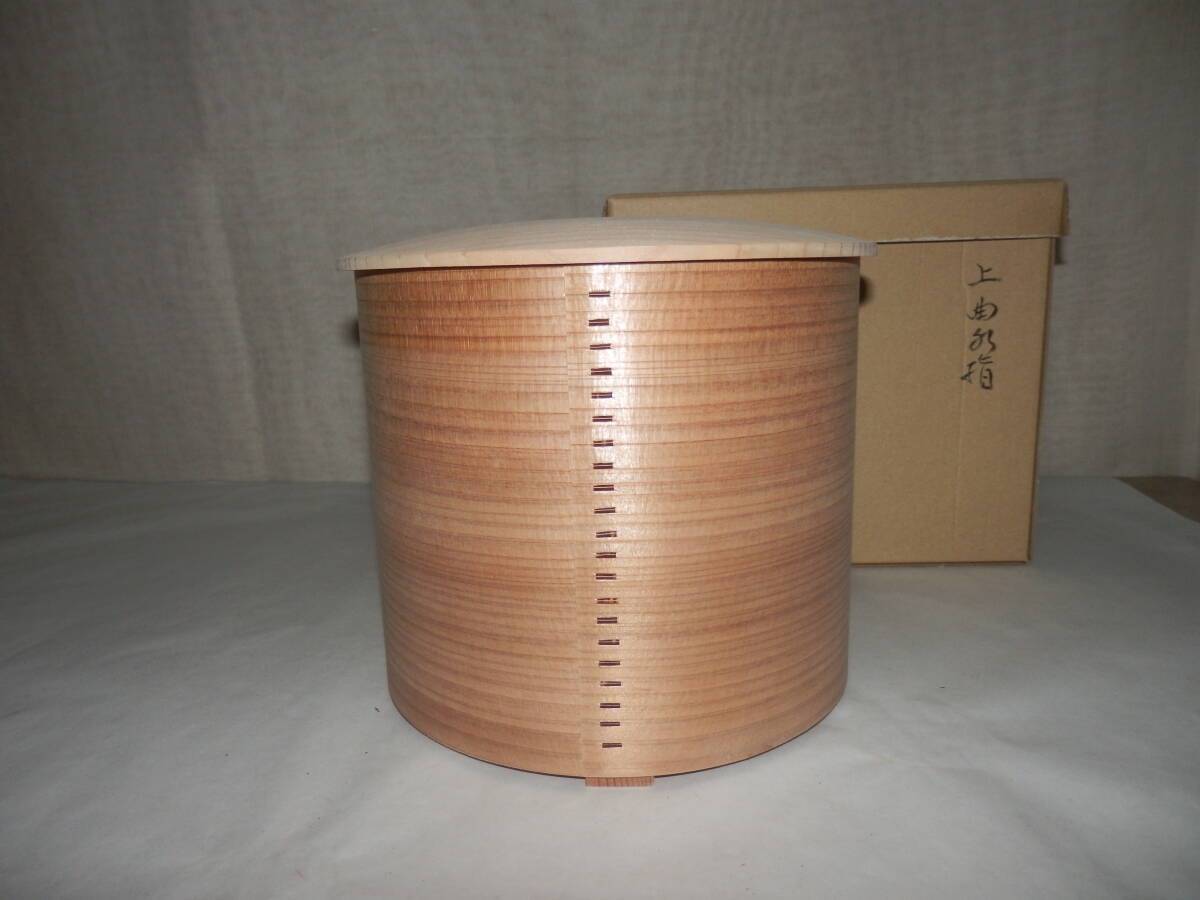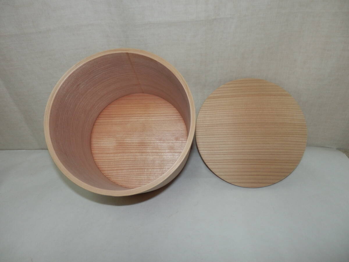 「新品・茶道具」秋田杉製の曲水指です。{上}です。 胴径約17.7cm 蓋径約18.5cm 高さ約17cm 紙箱。 どうぞ宜しく。