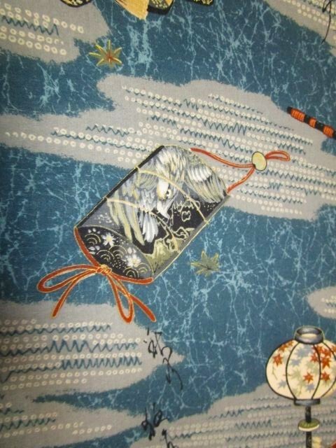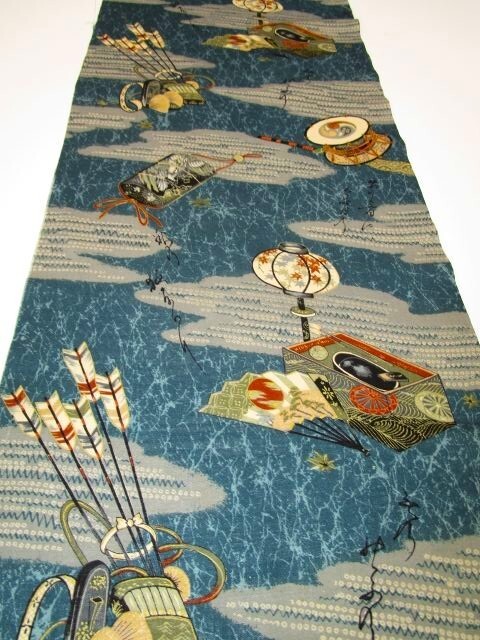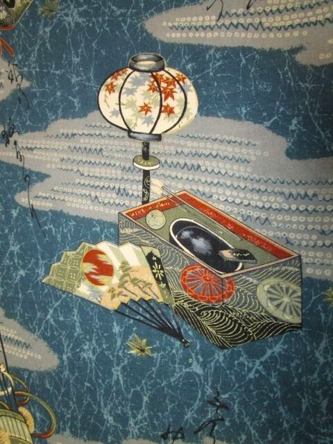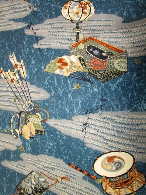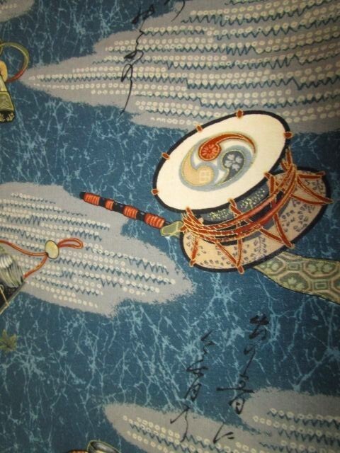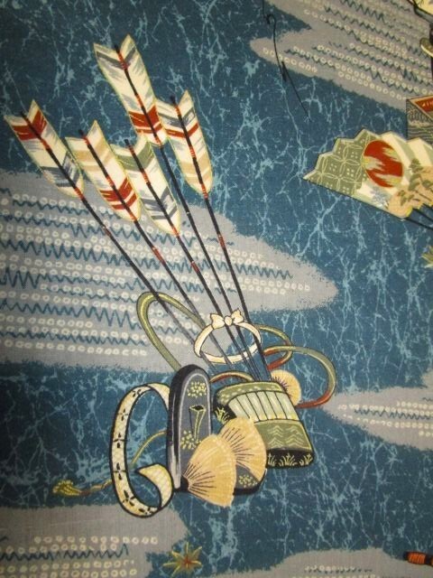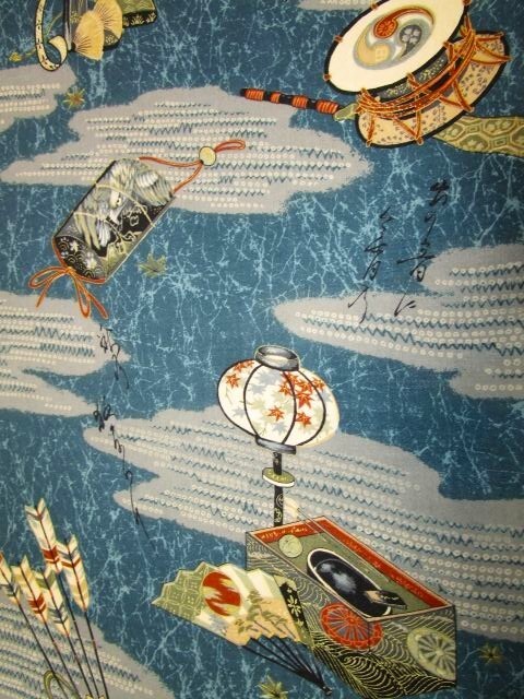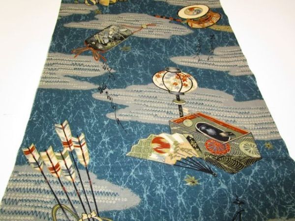男6-43★江戸柄*弓矢*行燈*扇*硯*印籠*太鼓*モスリン*古布はぎれ★一閑張り/掛軸/襖絵/屏風絵/アンティーク