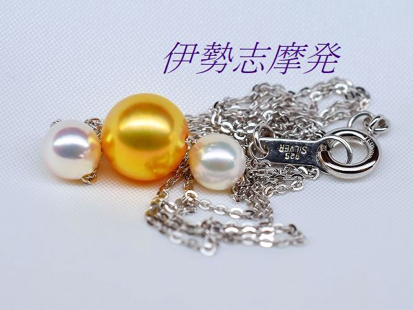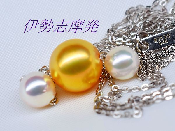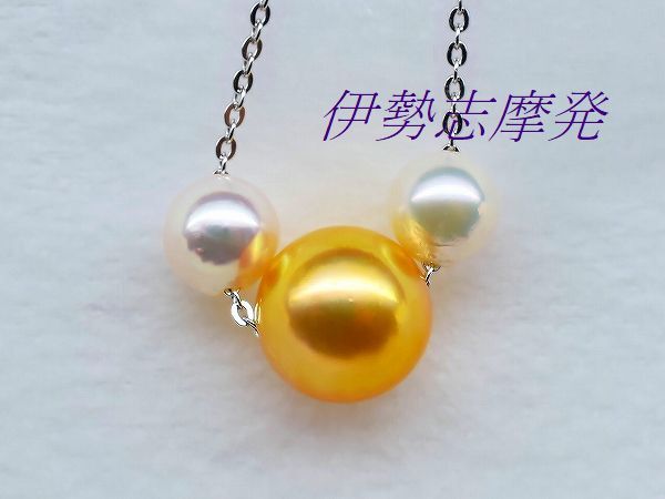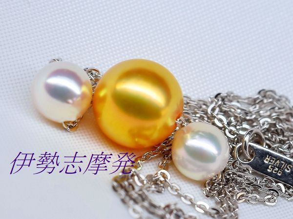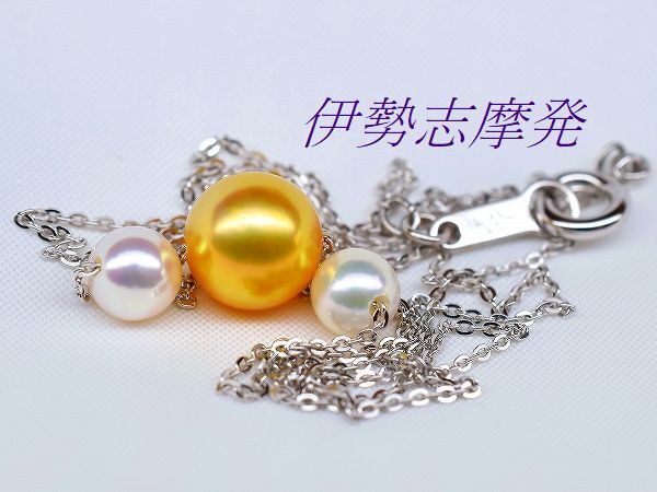 【真珠の種類】 あこや真珠 【珠サイズ】 8㎜up珠と5,4㎜と5,15㎜ベビー珠 【珠の形状】 ラウンド 【色】 ゴールド・ホワイトピンクの干渉色 【巻き】 非常に良い◎ 【照り】 非常に良い◎ 【キズ】 ほとんど無し 【エクボ】 ほとんど無し 【金具の材質】 全てシルバー製 【デザインの大きさなど】 全長45㎝ ◆ エレガントな雰囲気で女性の魅力を引き出す、煌びやかなテリと強い光沢はデコルテに華やかさを添えます。 ◆ センターに赤みを含んだ高貴なあこやゴールド8㎜up珠、元からのゴールド珠を特殊技術で濃いゴールド色に加工した(染色ではありません)自然発色珠です。お顔を近づけると映し込む超美珠! 両端にはホワイトピンクの干渉色のあこやベビー真珠、5,4㎜と5,15㎜珠をセットした大変美しいスルーネックレスです。あこや真珠ならではの透明感のある、美しい真珠です。 繊細で美しいシルバーチェーンも動く度にきらきらと輝きお洒落、パールを直接チェーンに通して動きを演出し、胸元で揺れるさまがとてもエレガントです。 | ||||||||