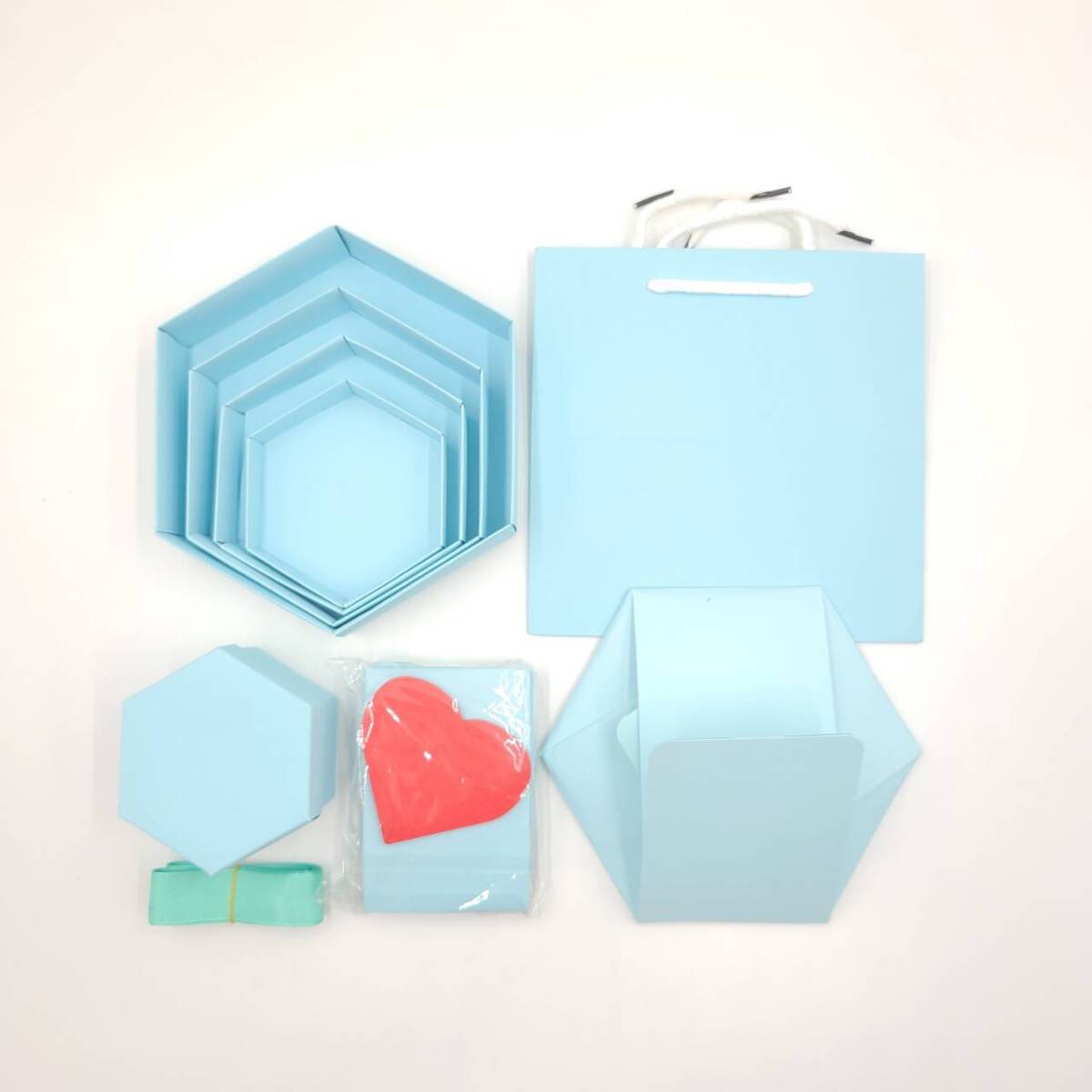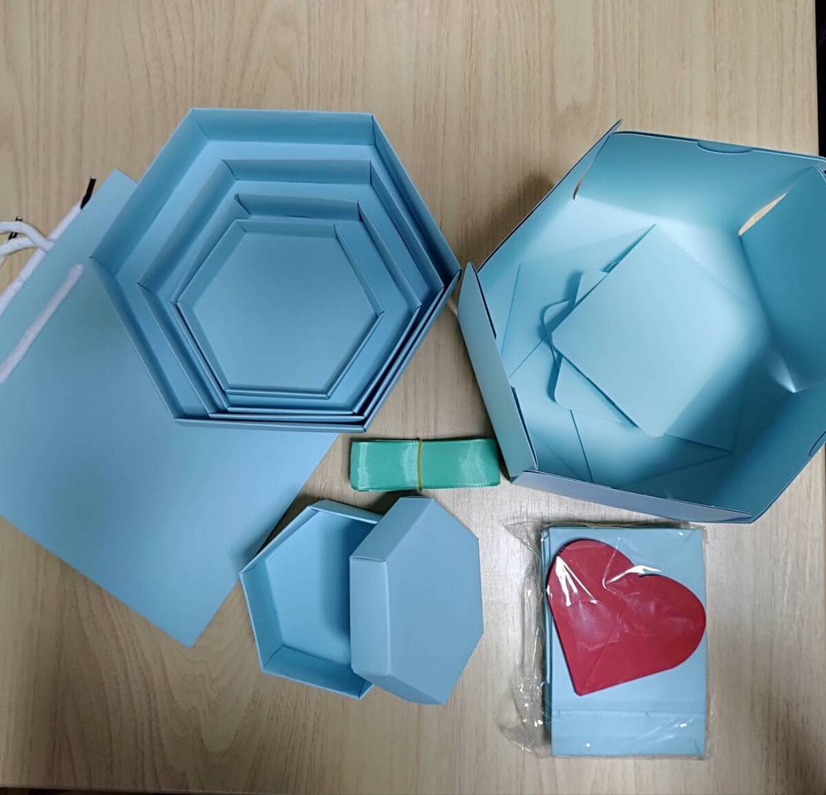 箱の外側から見ると六角形のギフトボックスのように見えますが、重ねて開くと目の前に花が咲くように見えます♪