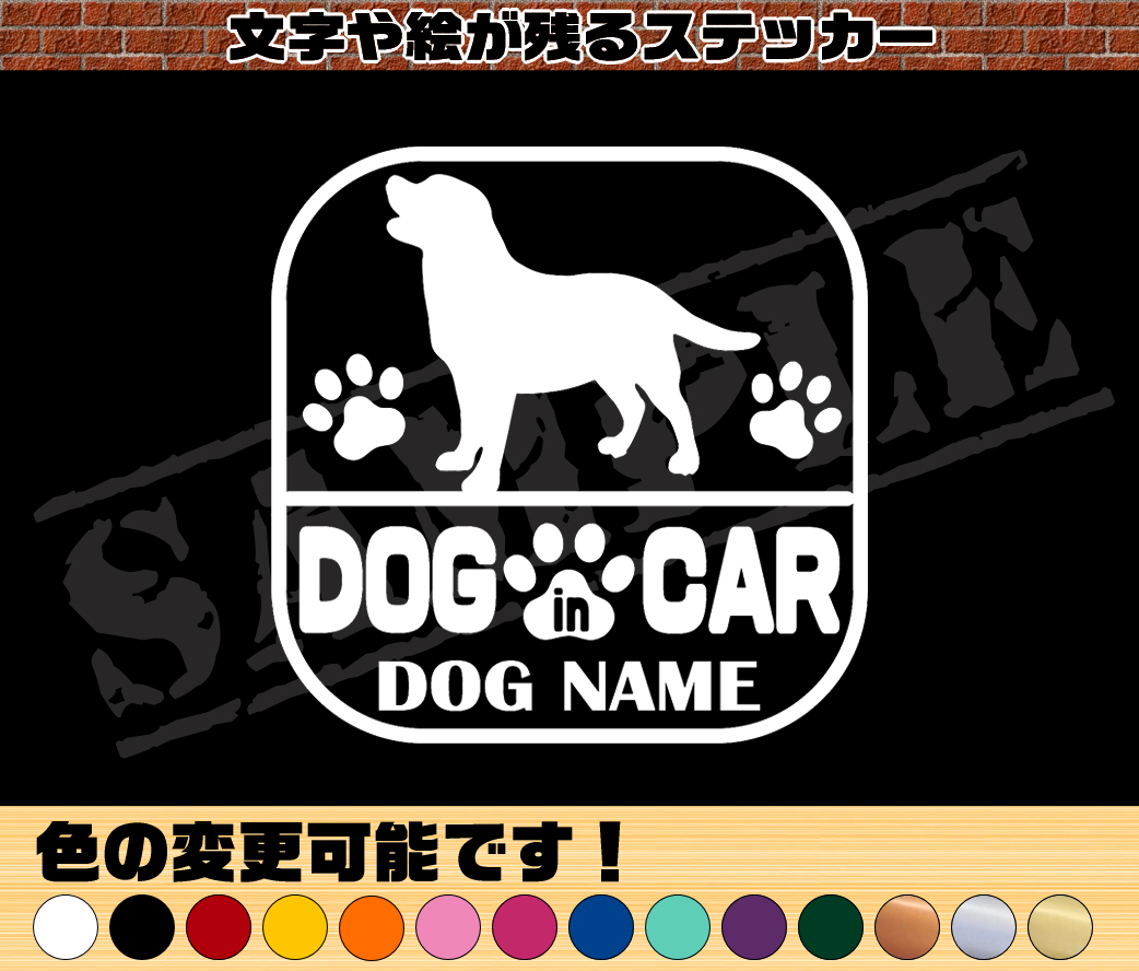 文字やイラストだけが残る ラブラドール(立ち姿①)・お名前入れ♪・DOG IN CAR・四角枠パロディステッカーです。