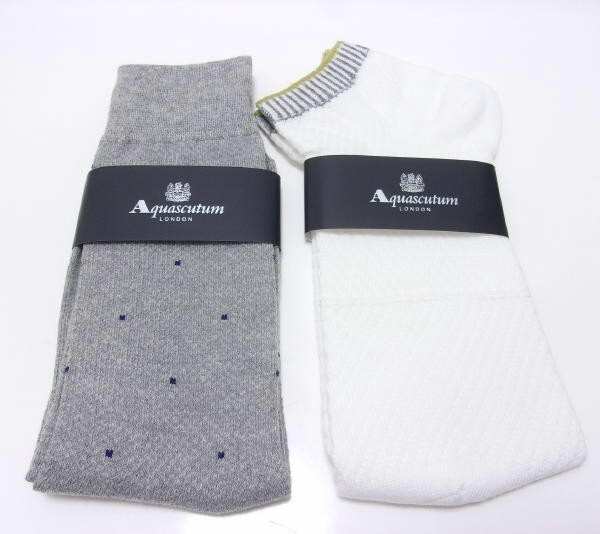 ◆Aquascutum(アクアスキュータム) の靴下2足セット新品です。 定価は¥2.750です。 表記サイズ 25cm~27cm カラー グレー、ホワイト系 素材 綿、ナイロン、ポリウレタン | |||