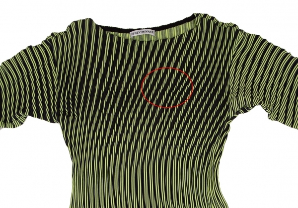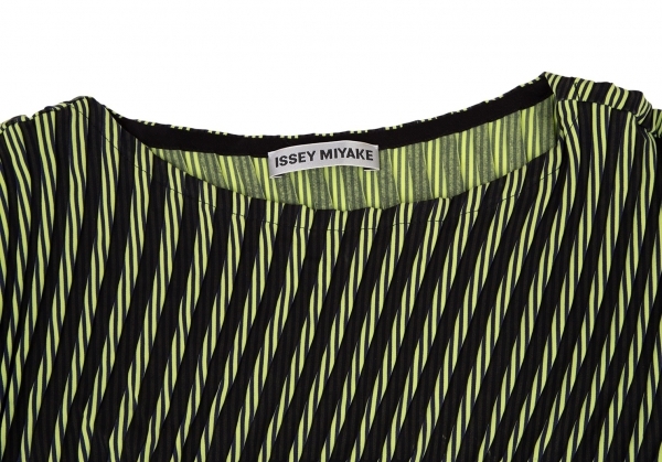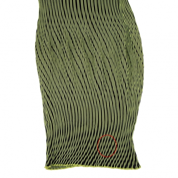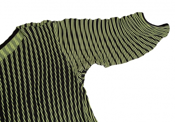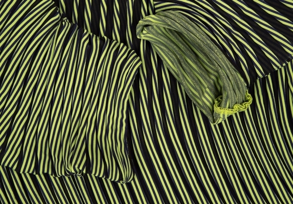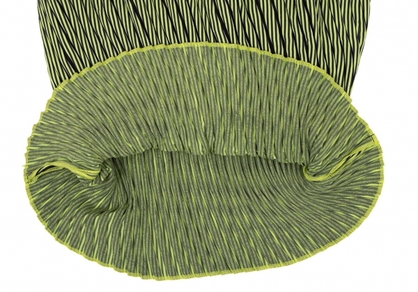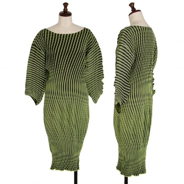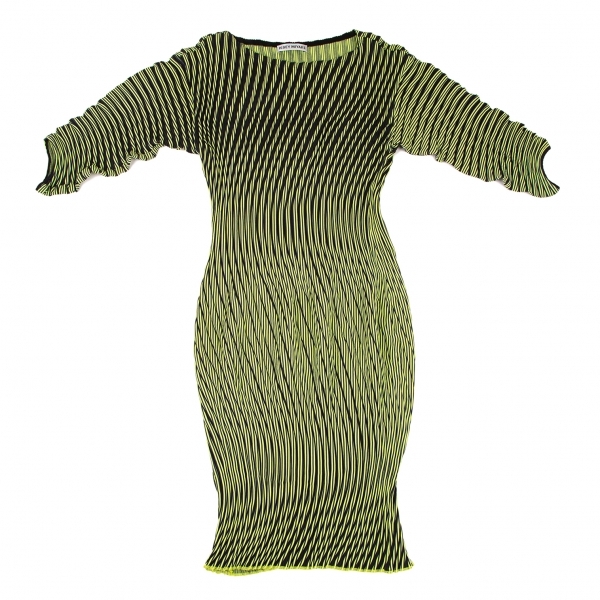 | イッセイミヤケISSEY MIYAKE PLASMA Baked Stretch ストライプカーブプリーツワンピース 黄緑紺2 |