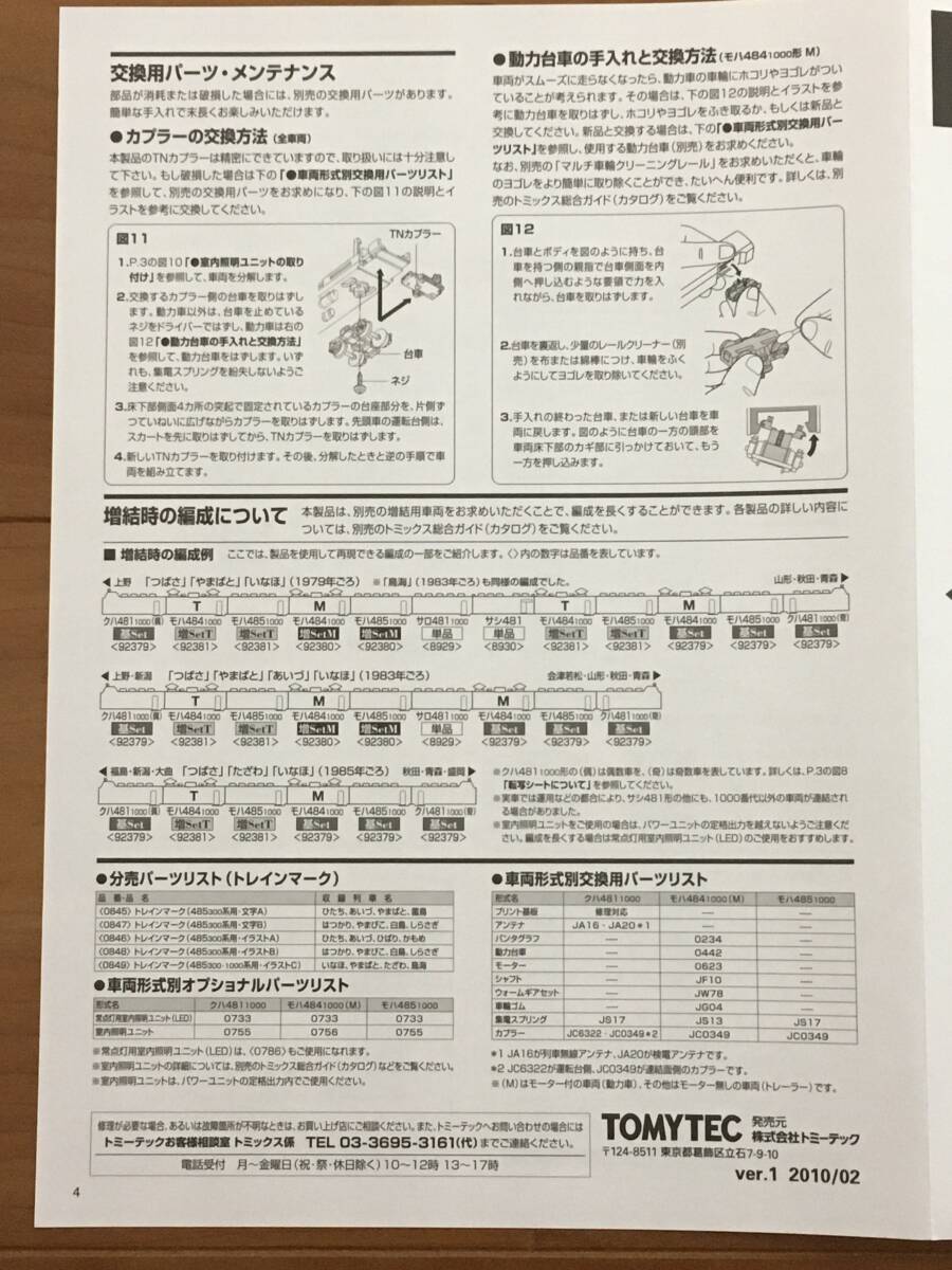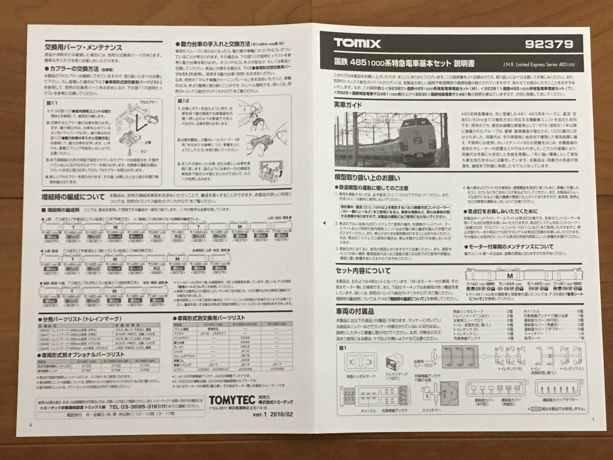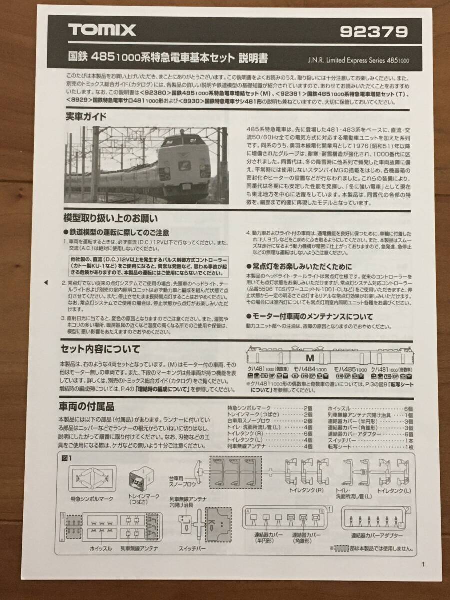 TOMIX 国鉄 485 1000系 特急電車基本セット (商品番号:92379) 説明書 1枚