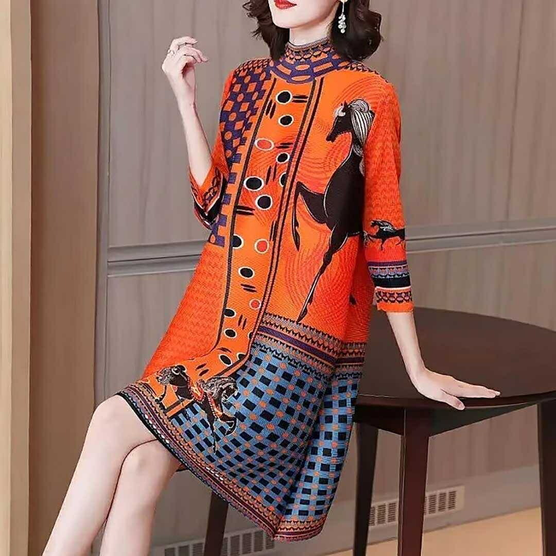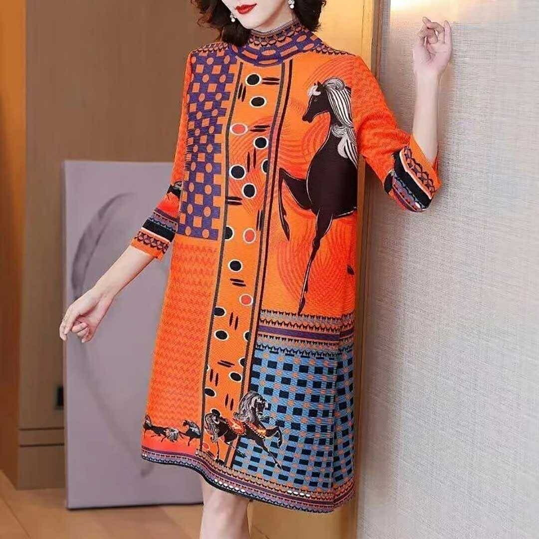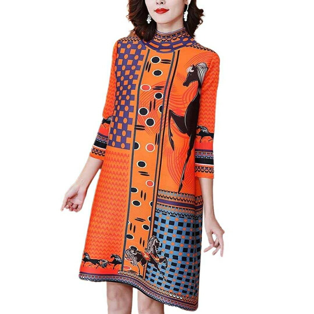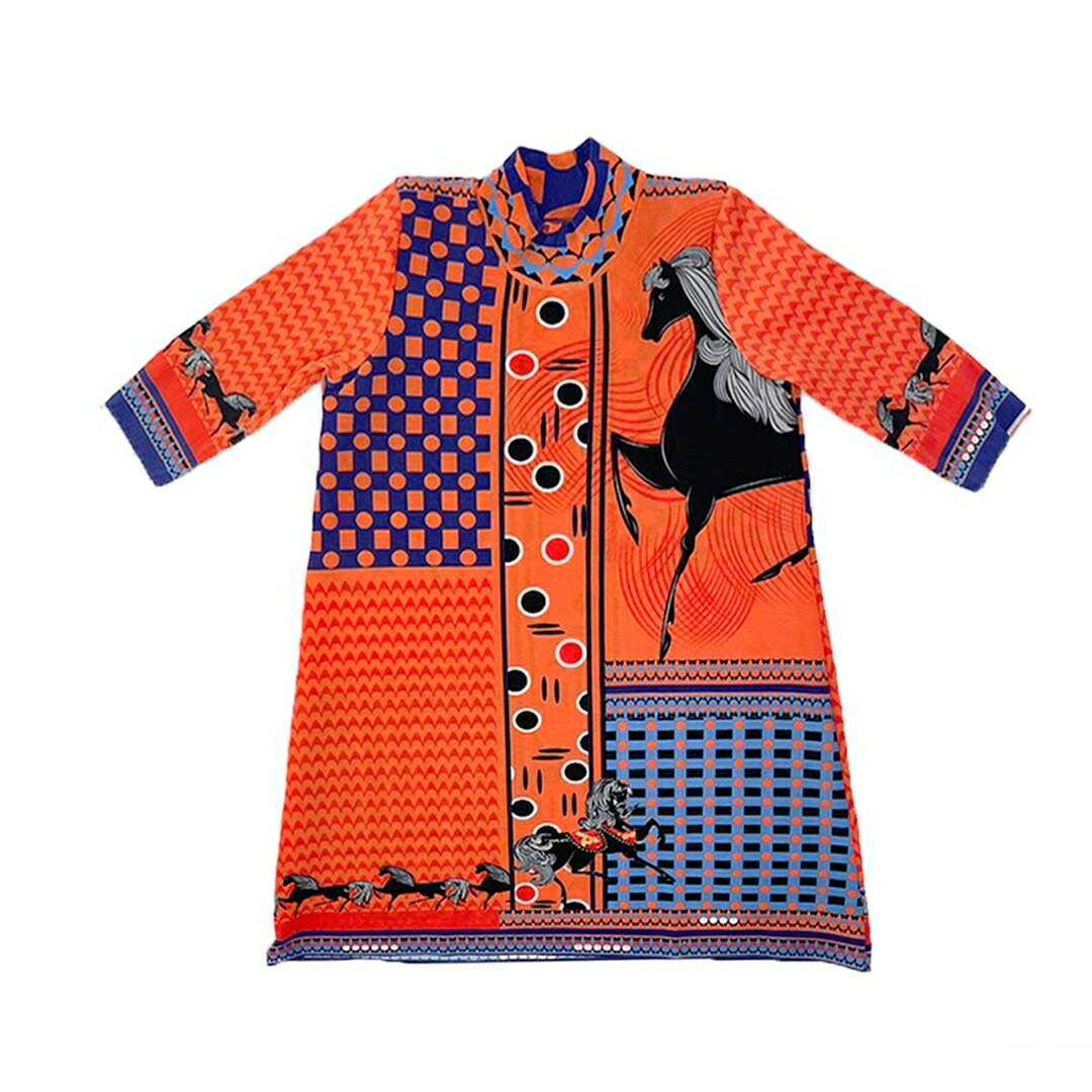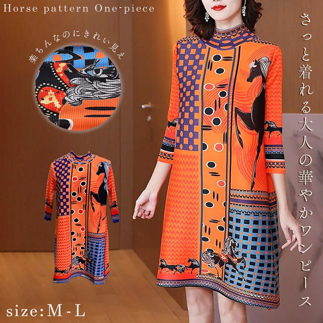 【2サイズから選択】【※購入後メッセージ下さい】ワンピース 馬柄 オレンジ 膝上丈 MサイズorLサイズ 伸縮性 ホース オリエンタル