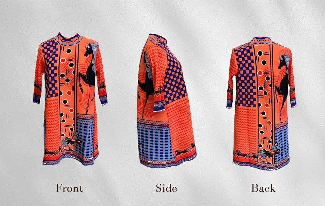 とてもユニークで可愛い主役級のワンピースドレスです。こちらのワンピースは落ち着いたオレンジに馬の柄を取り入れてシックな大人の女性を演出しております。着るだけで印象的ですっきりと大人の雰囲気でお召し頂けるのもお勧めのポイントです