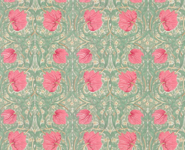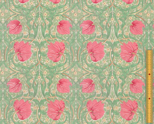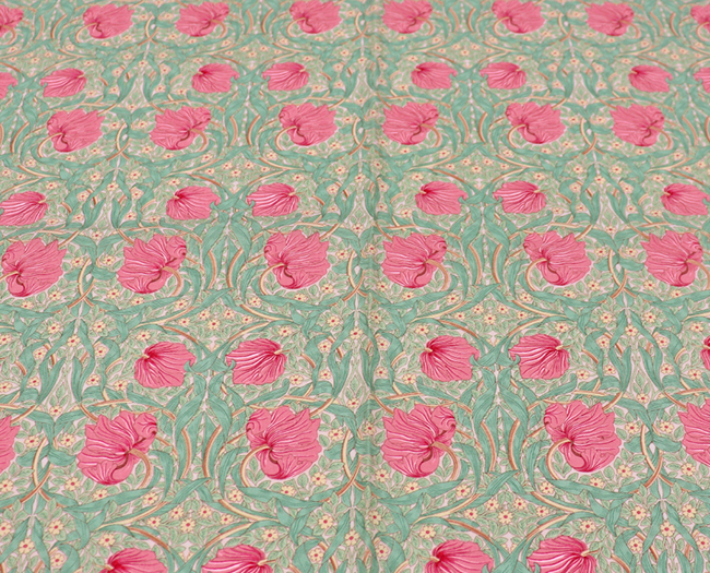 「ピンパネル(Pimpernel )」は、1876年にウィリアムモリスが壁紙としてデザインした作品で、鏡面対象に描かれた、荒涼としたイメージの風に吹かれた花のパターンは、ウィリアム・モリスの素晴らしデザインの典型です。ハマー・スミス、ケルムスコット・マナーのダイニングルームに使われていたことから、モリスお気に入りのデザインだったと推測されます。