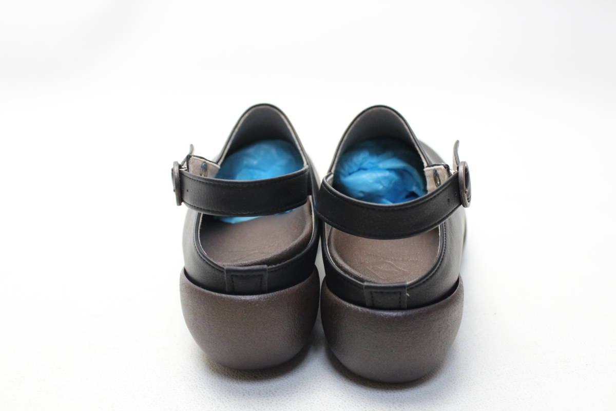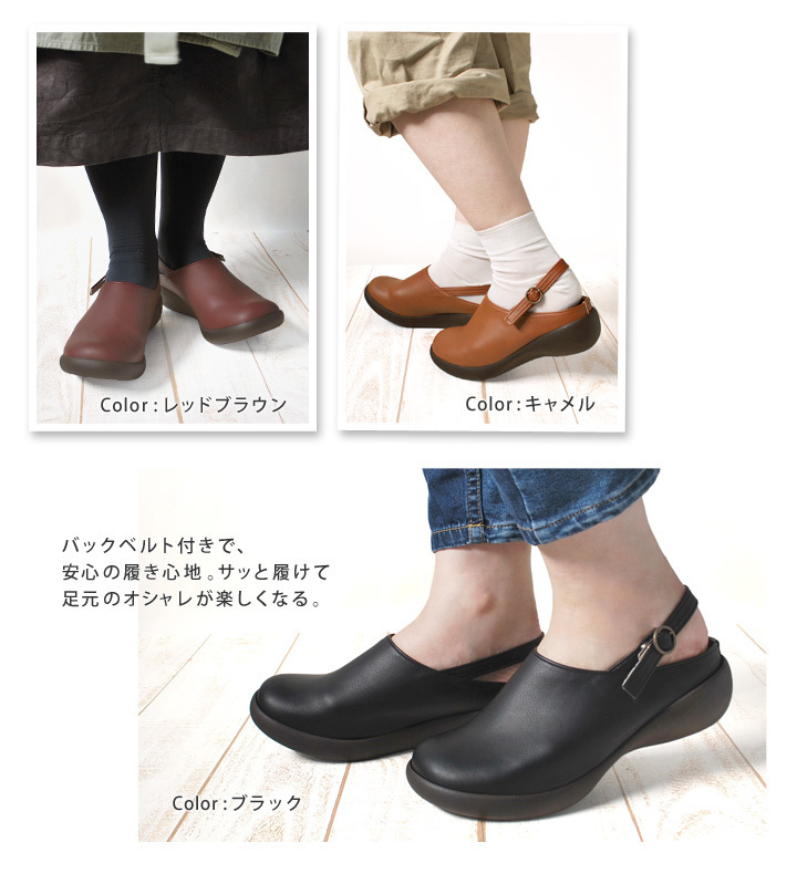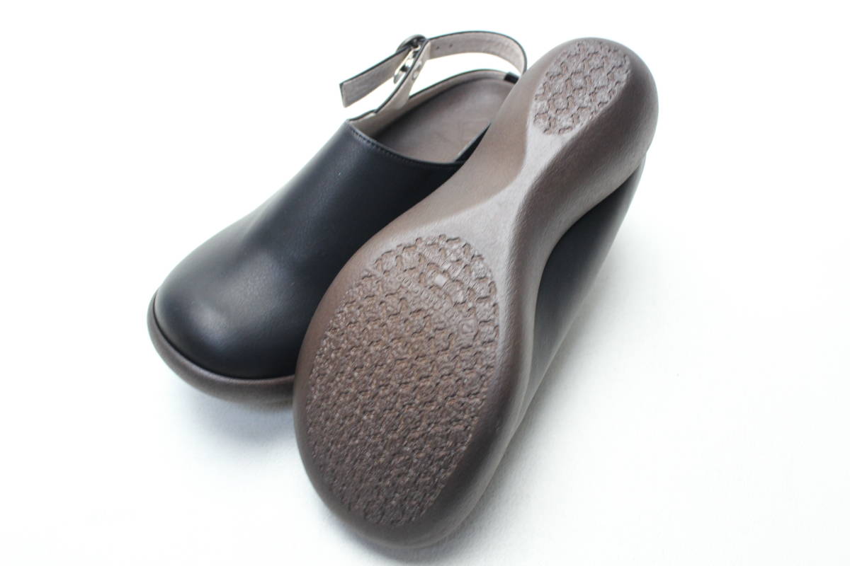 底には安定感があり、美脚見せの効果もあるアシンメトリーウェッジヒールを使用!
